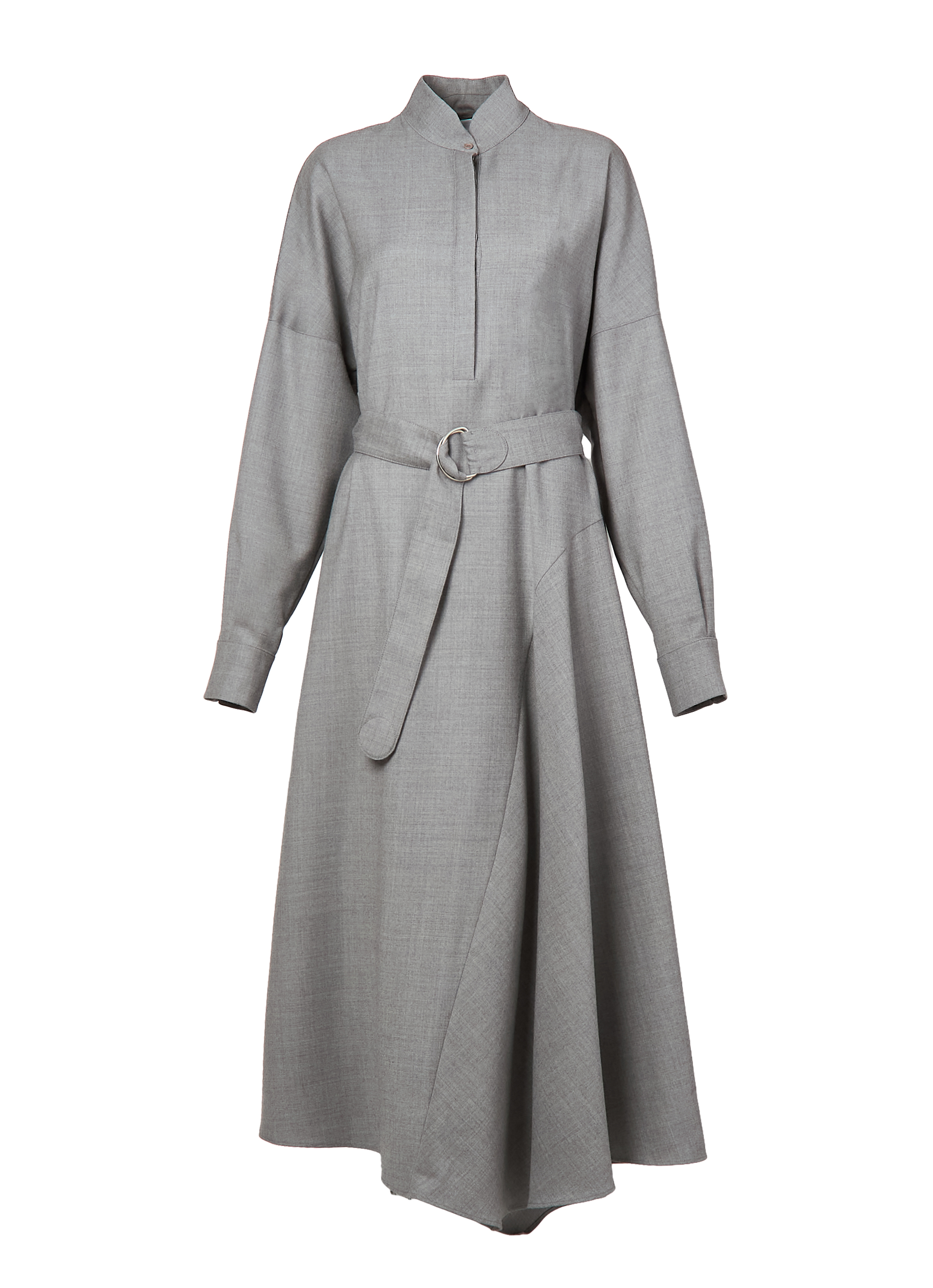 スタンドカラーが洗練された印象を与え、ウエストベルトでメリハリのある美しいシルエットに。