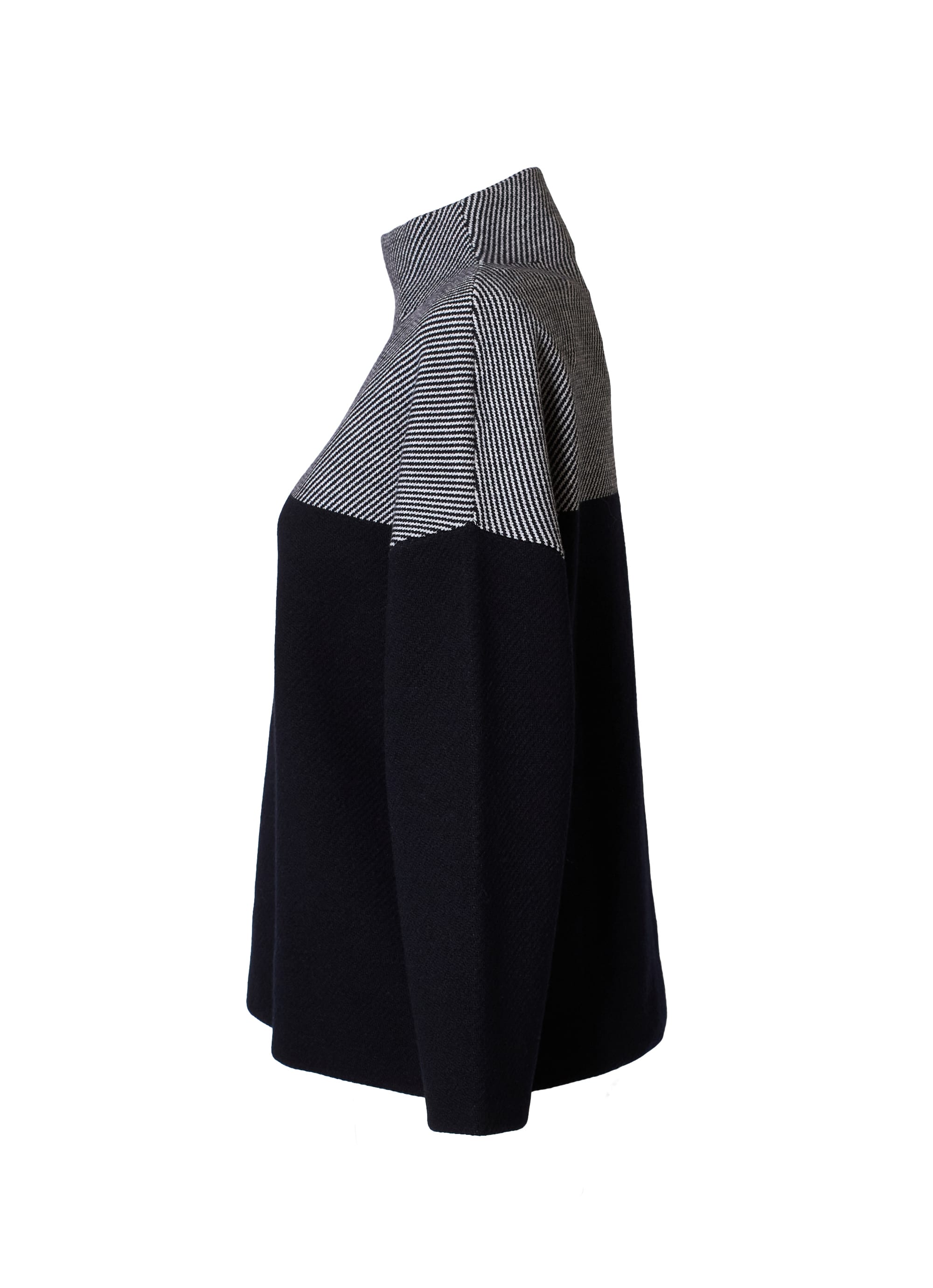 素材使いとグラフィカルな表現が融合した、秋冬のワードローブに映える一着です。