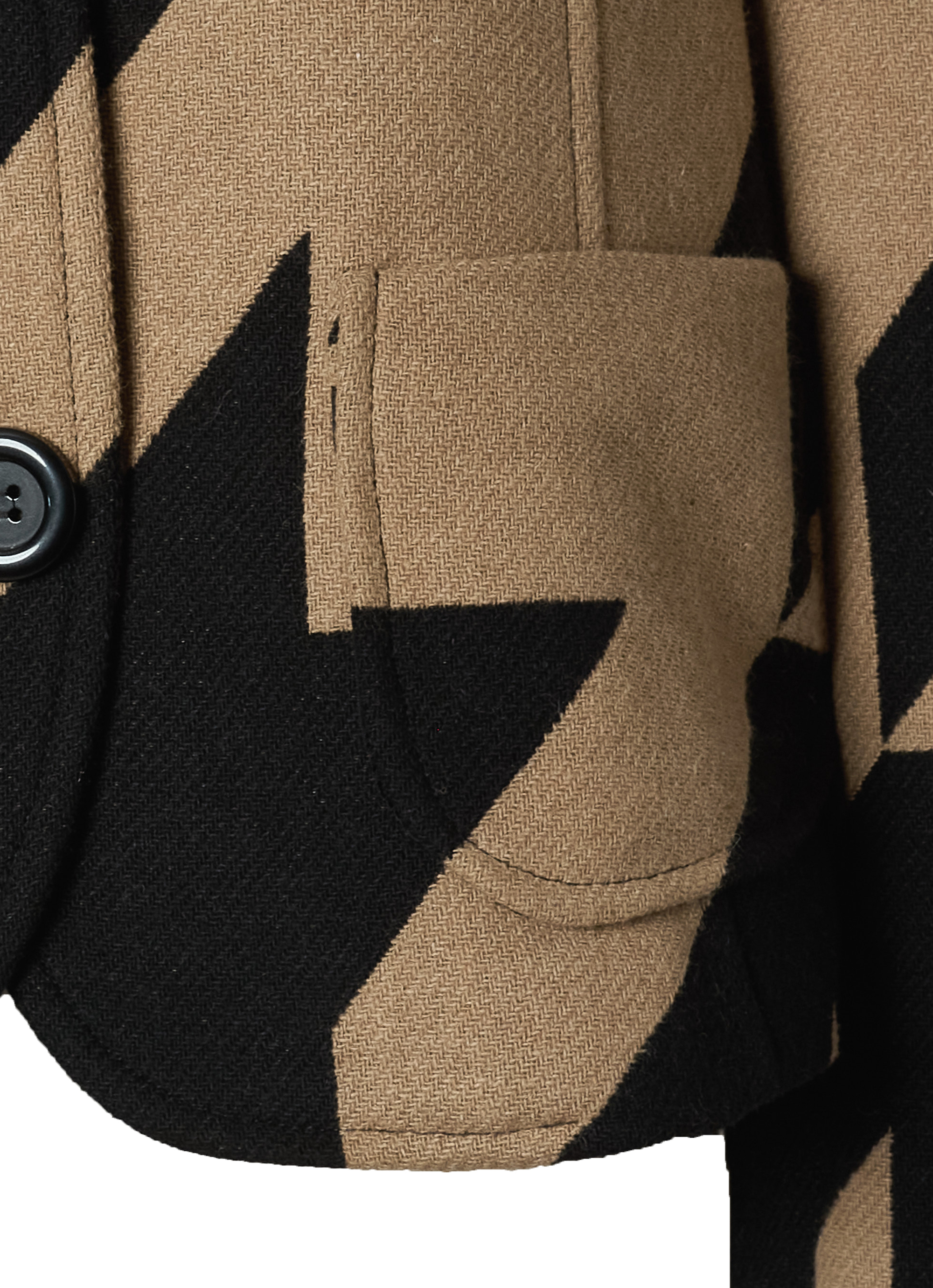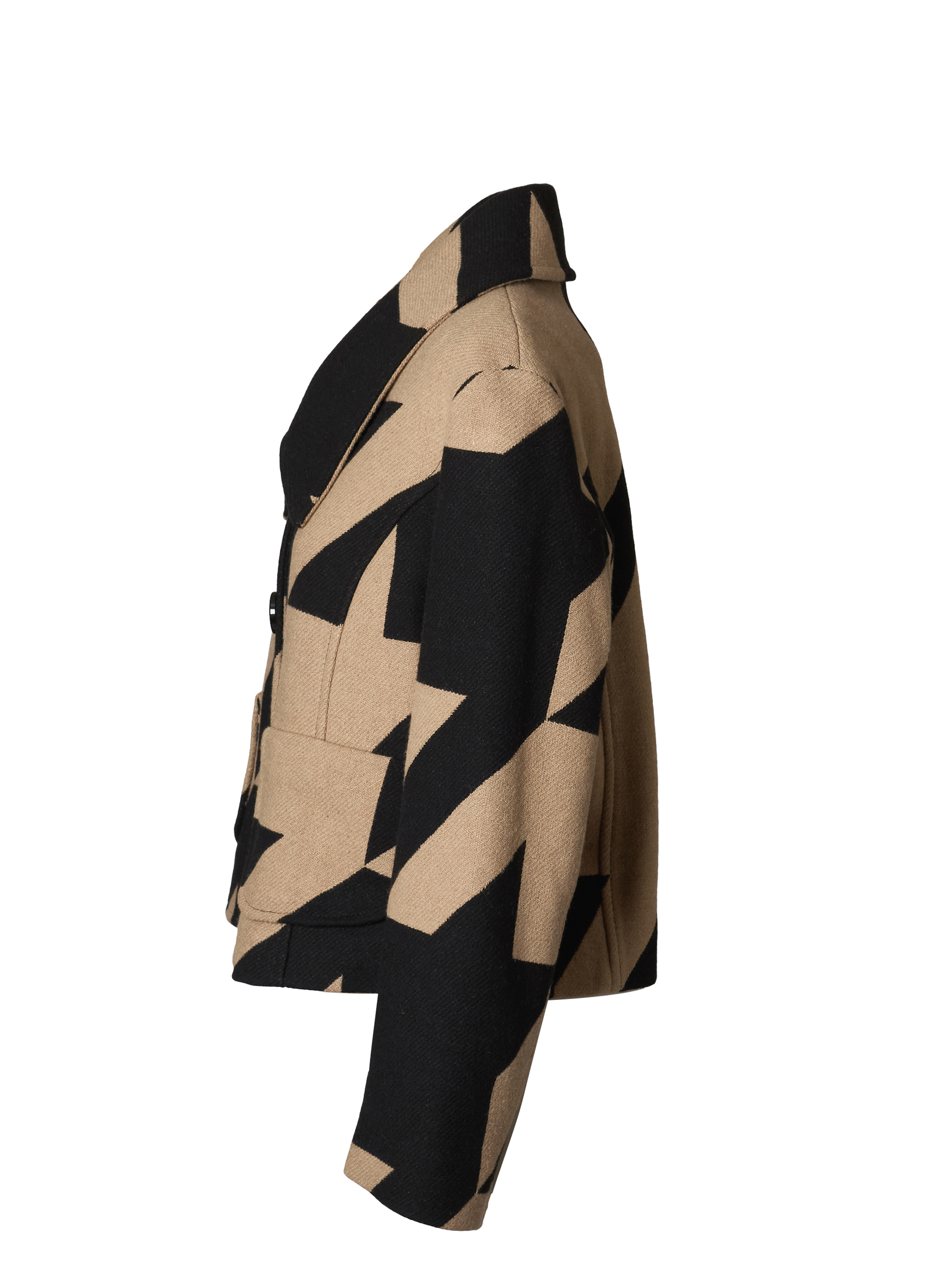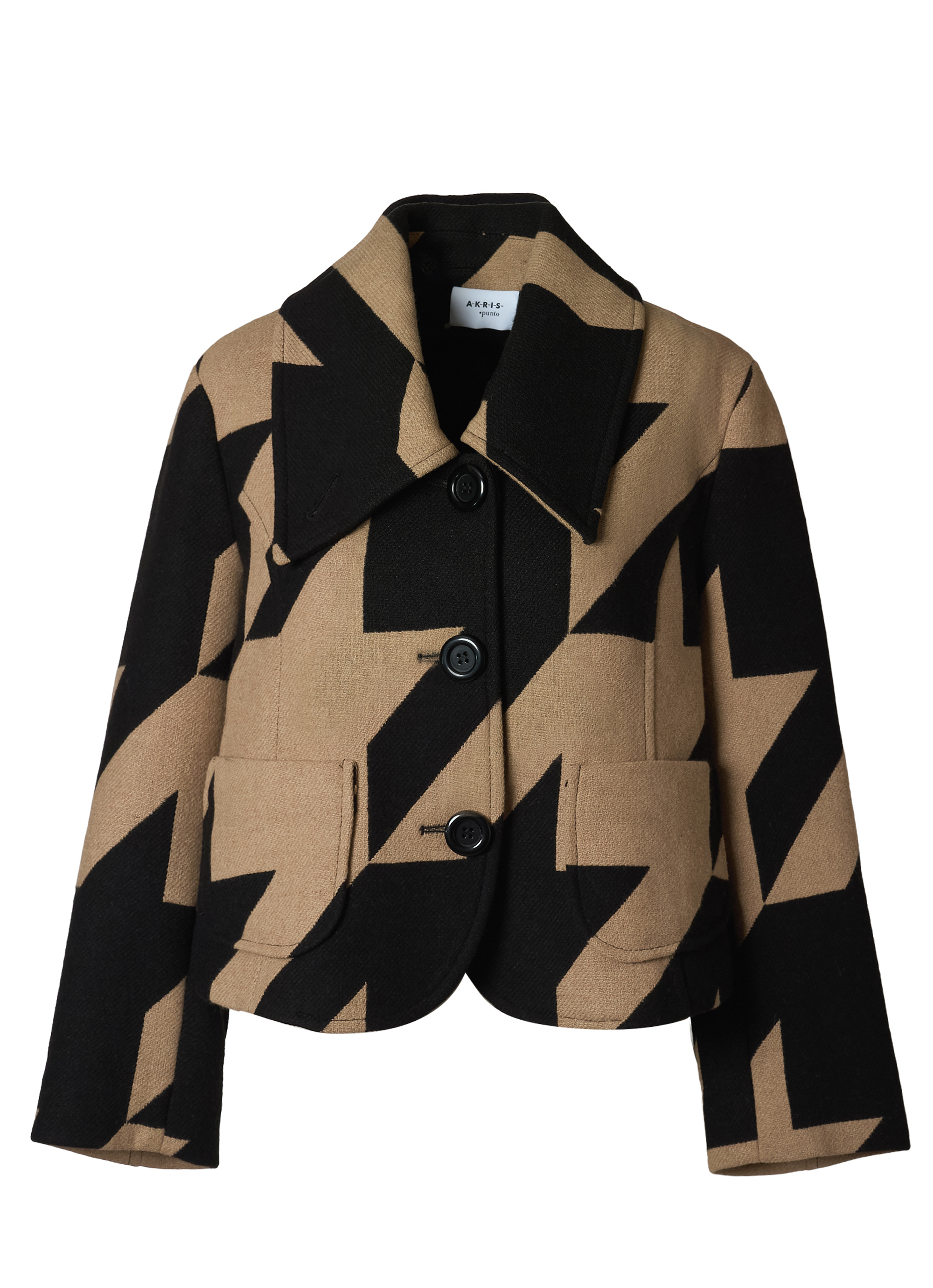 大胆なビッグサイズの千鳥格子柄が目を引く、ジャカード織りのジャケット。