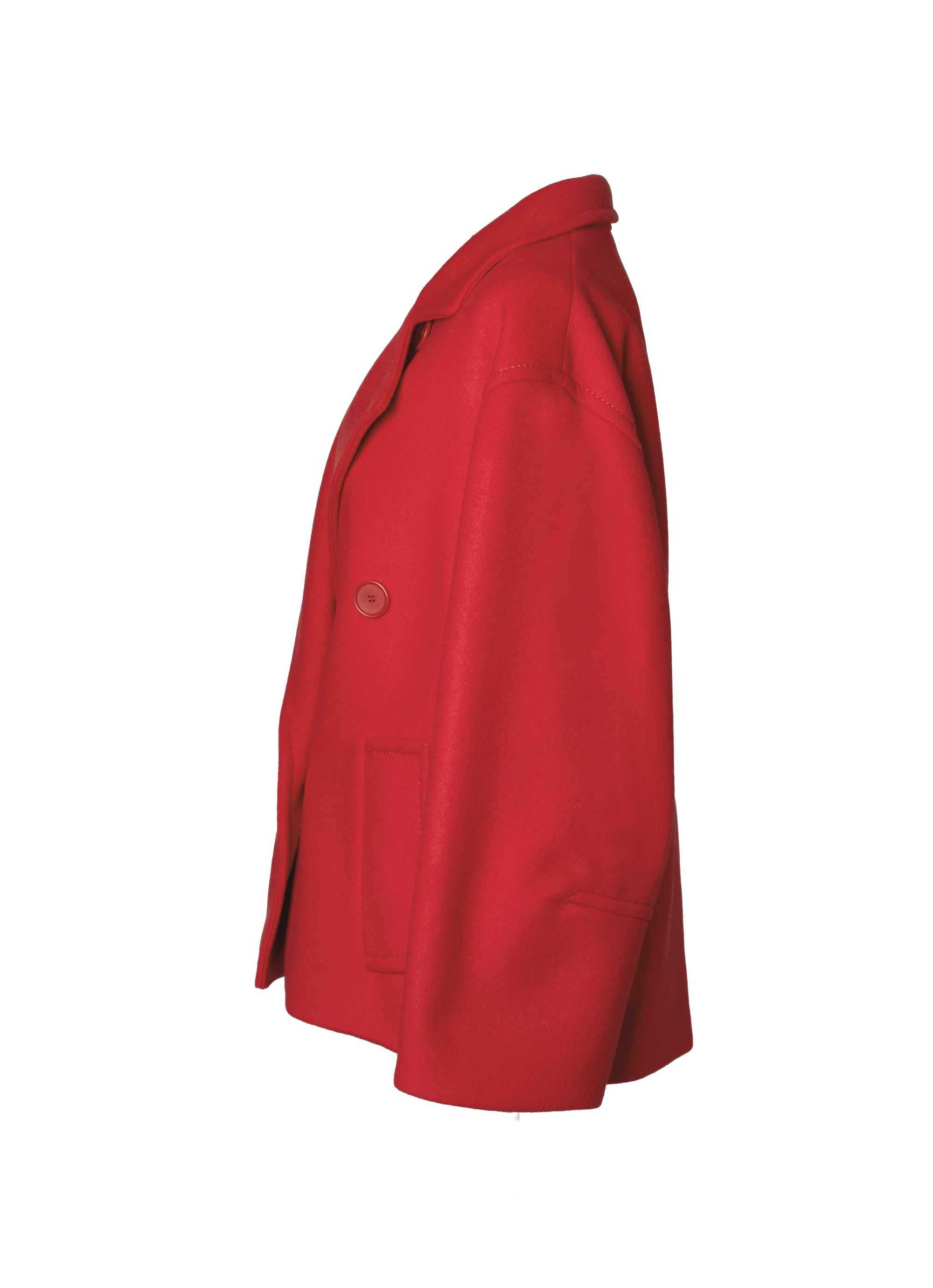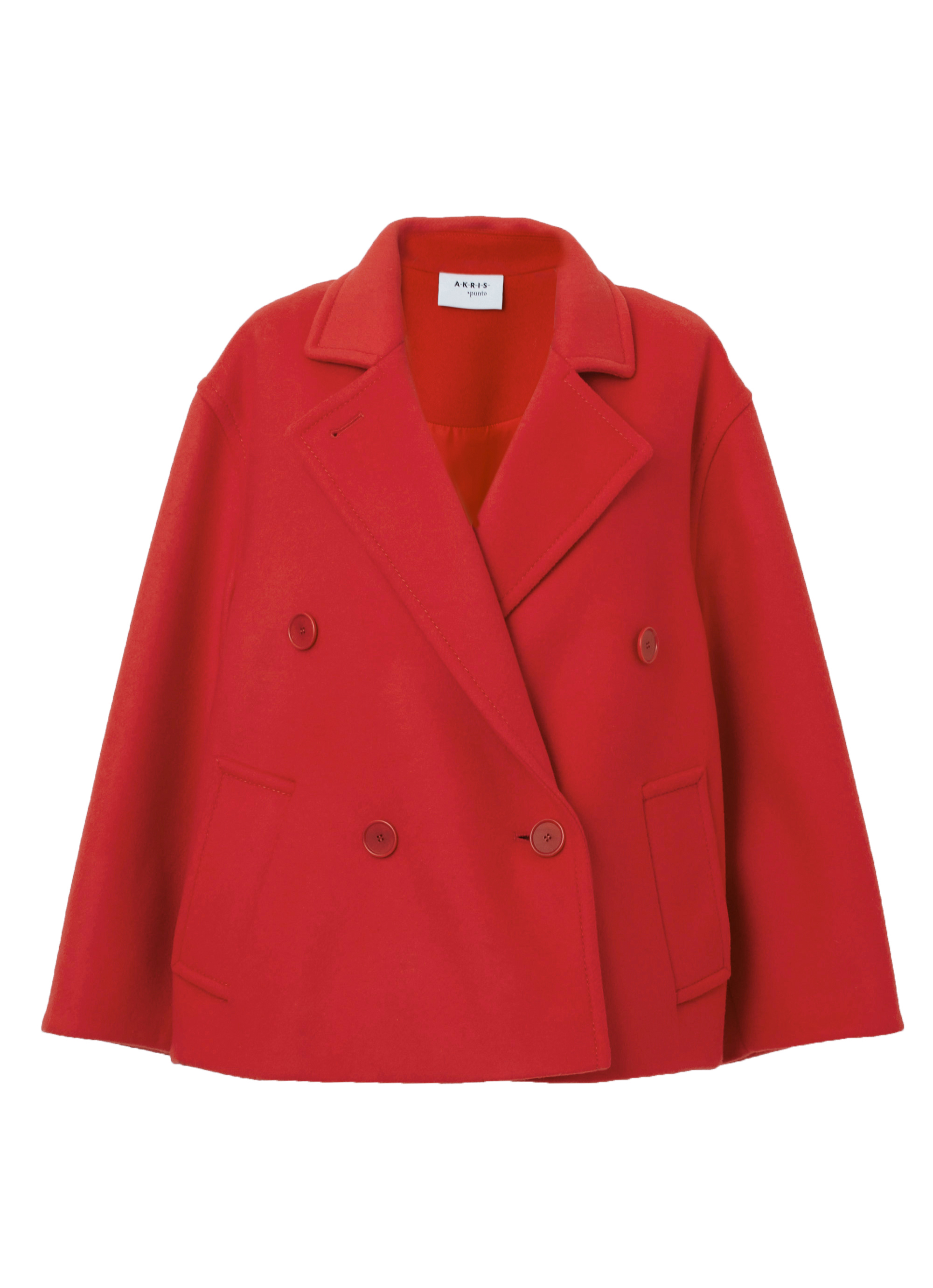 クラシックなボタンのダブルブレスト仕様に、すっきりとしたシルエットが洗練された印象を与えます。