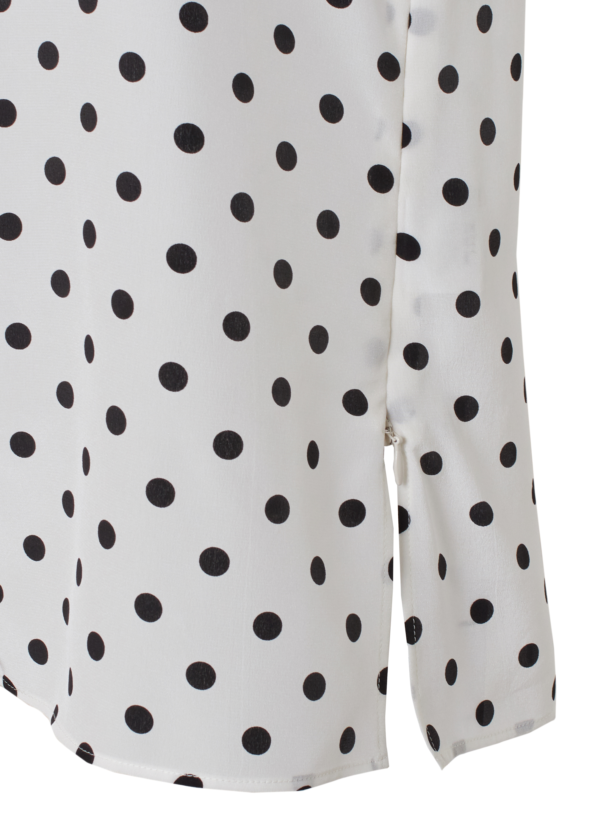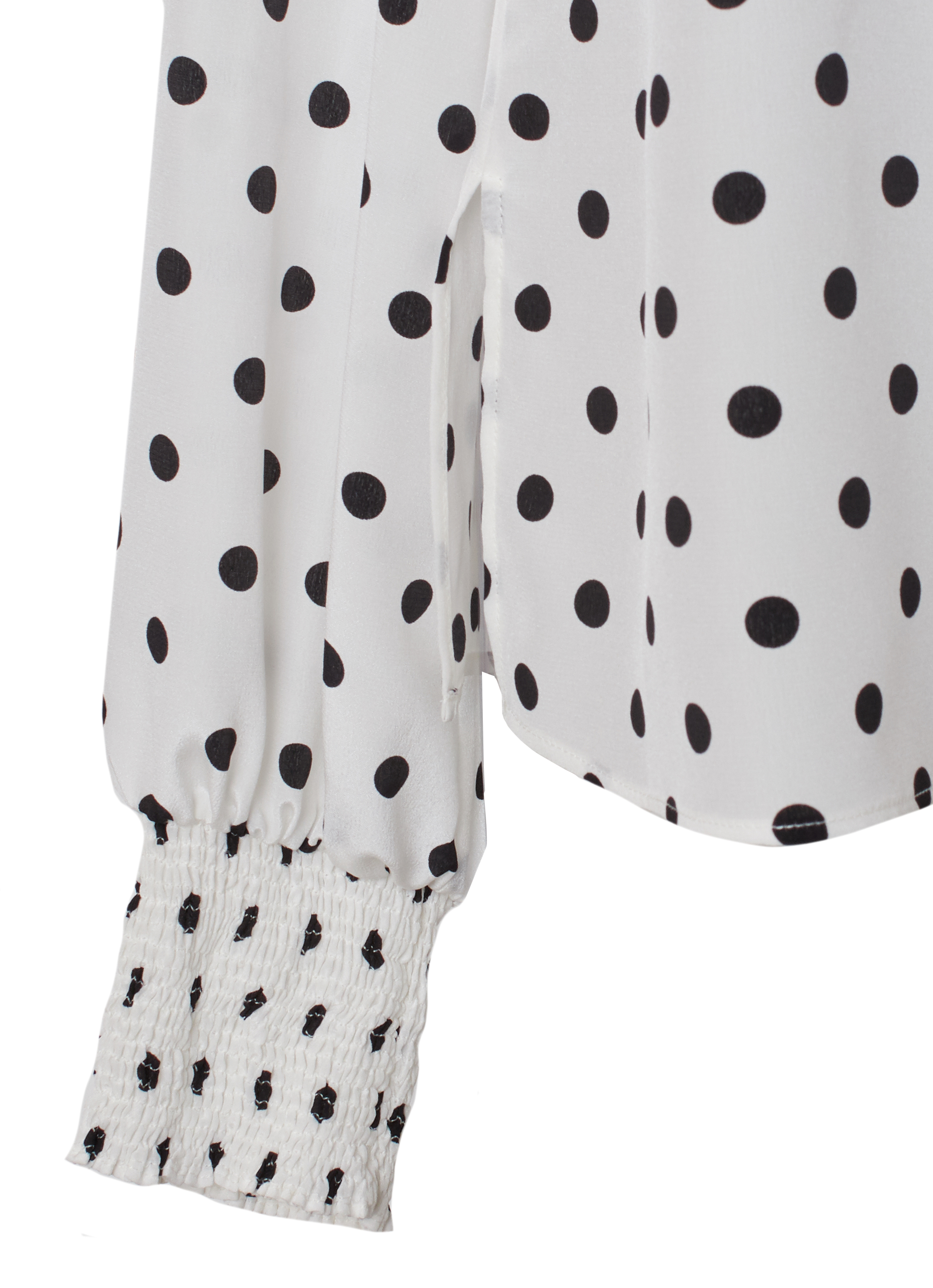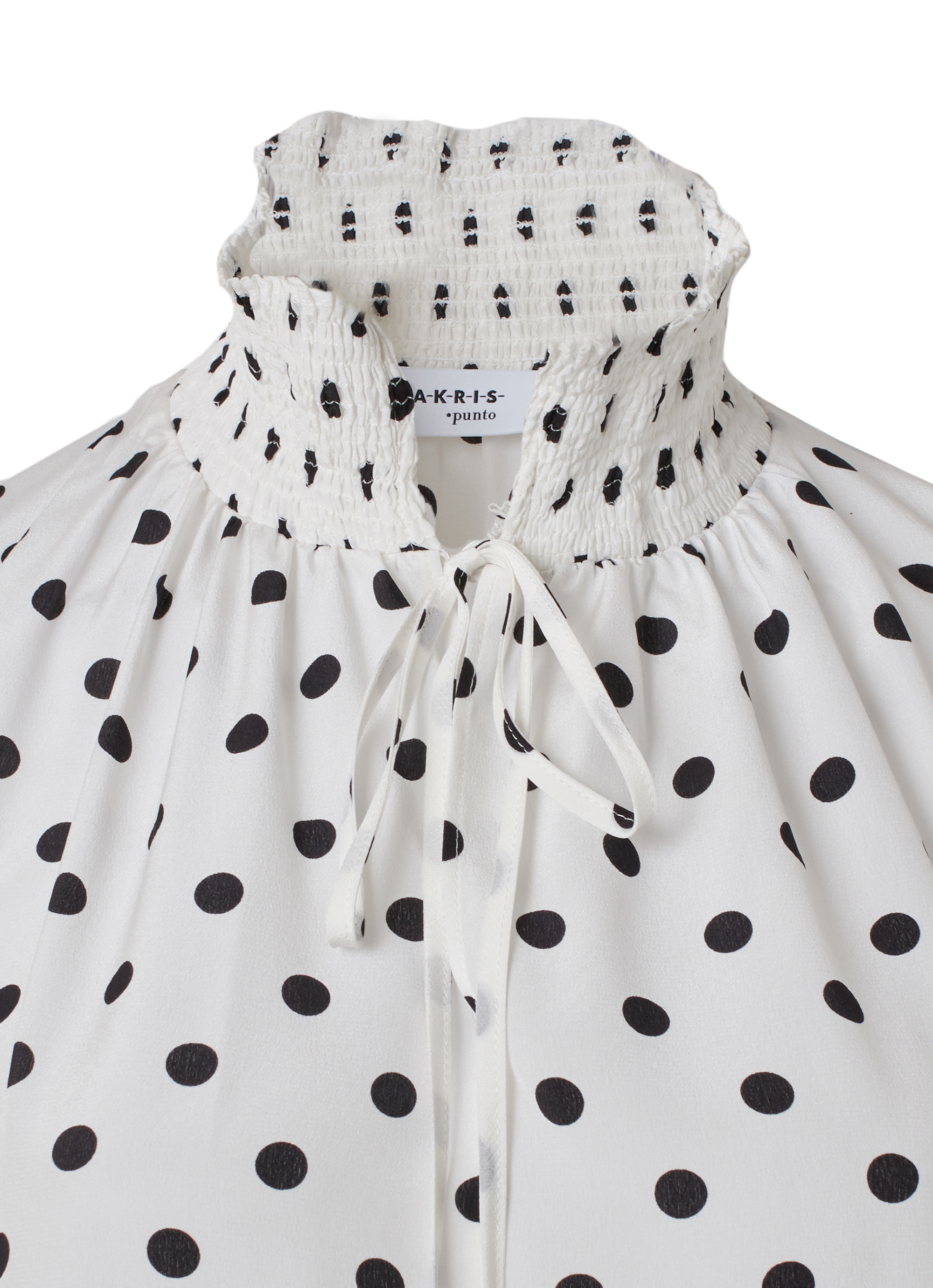 白地に黒のドット柄がクラシカルな雰囲気を演出し、襟元のリボンタイが上品なアクセントに。