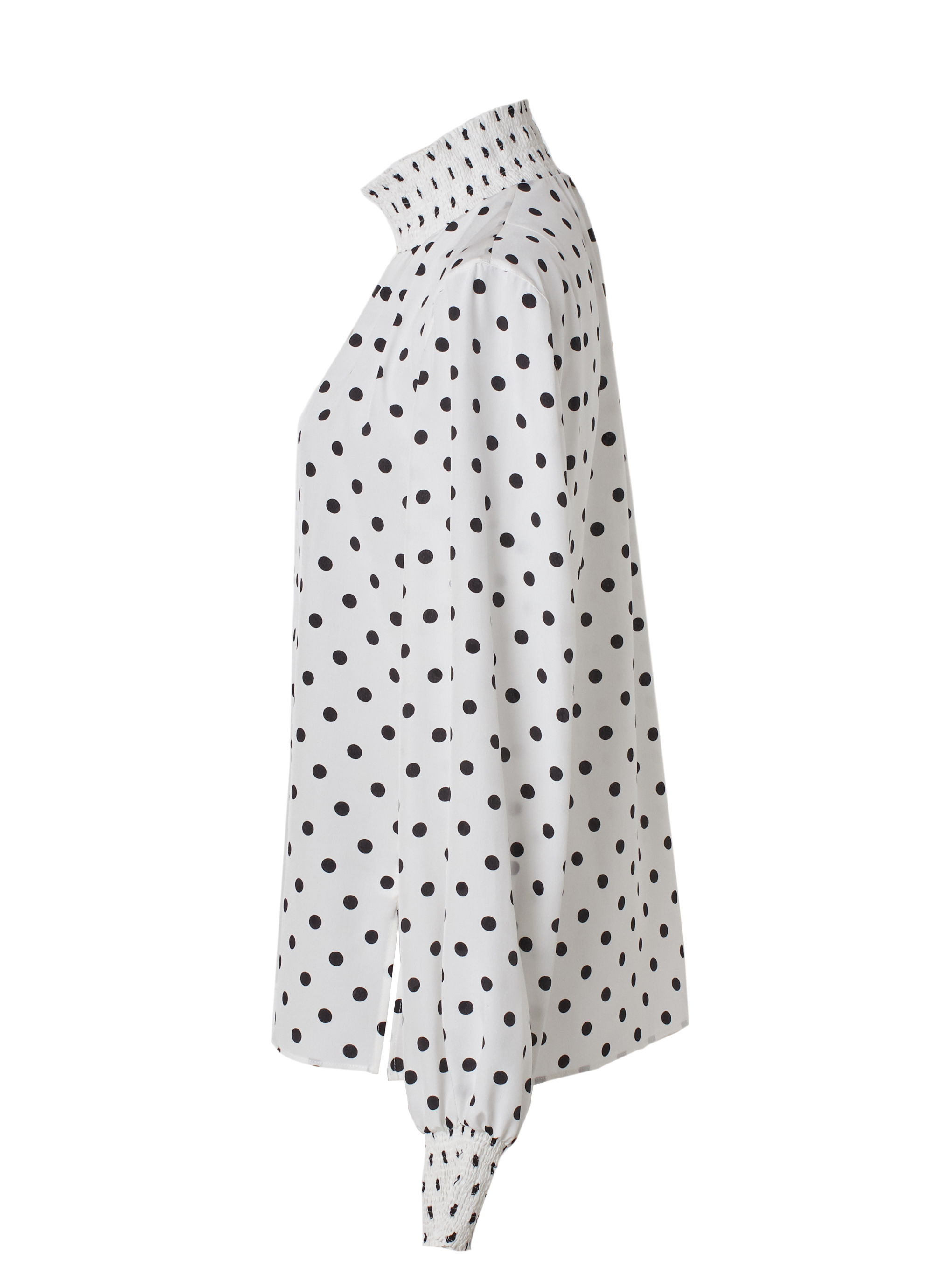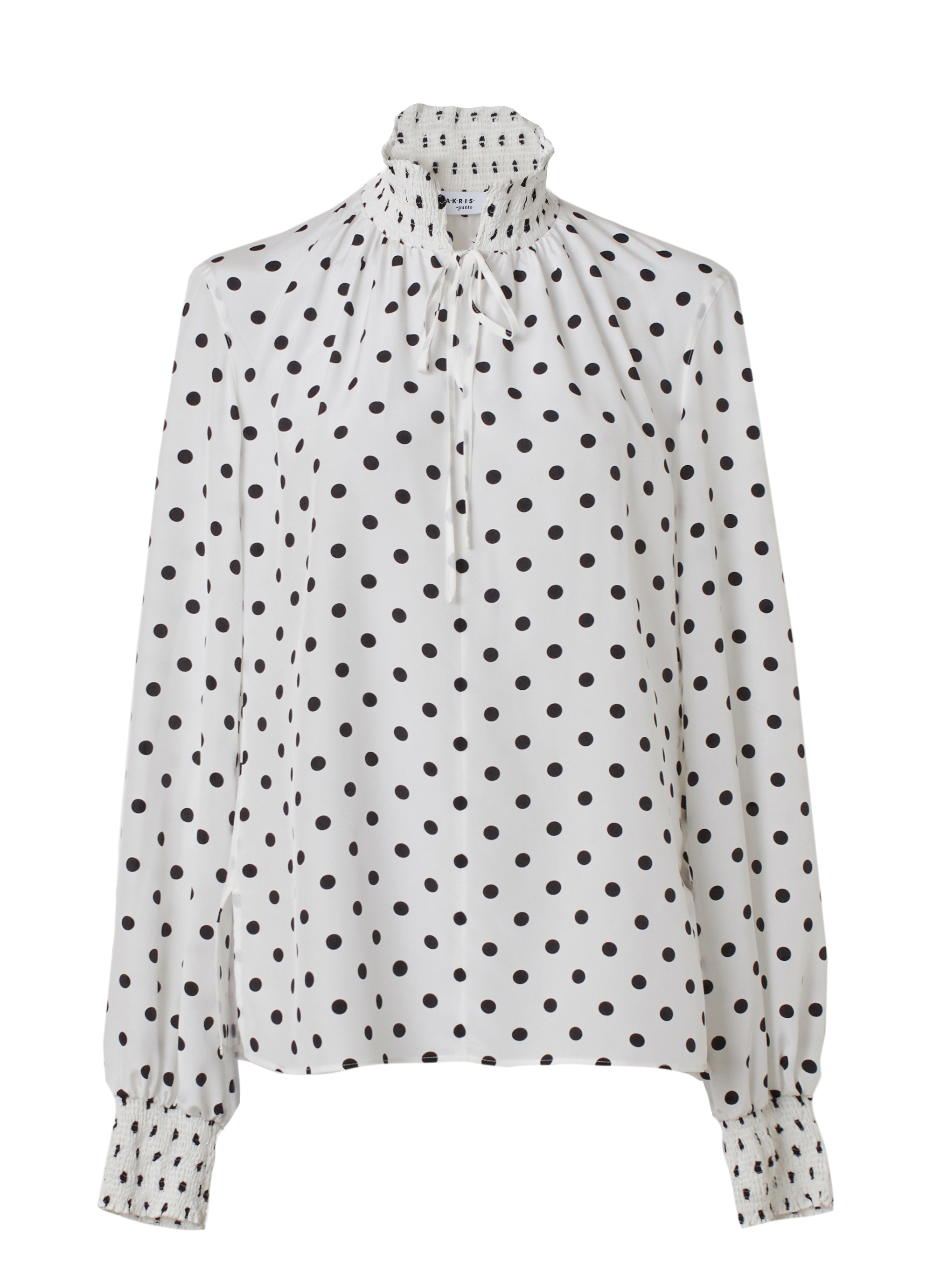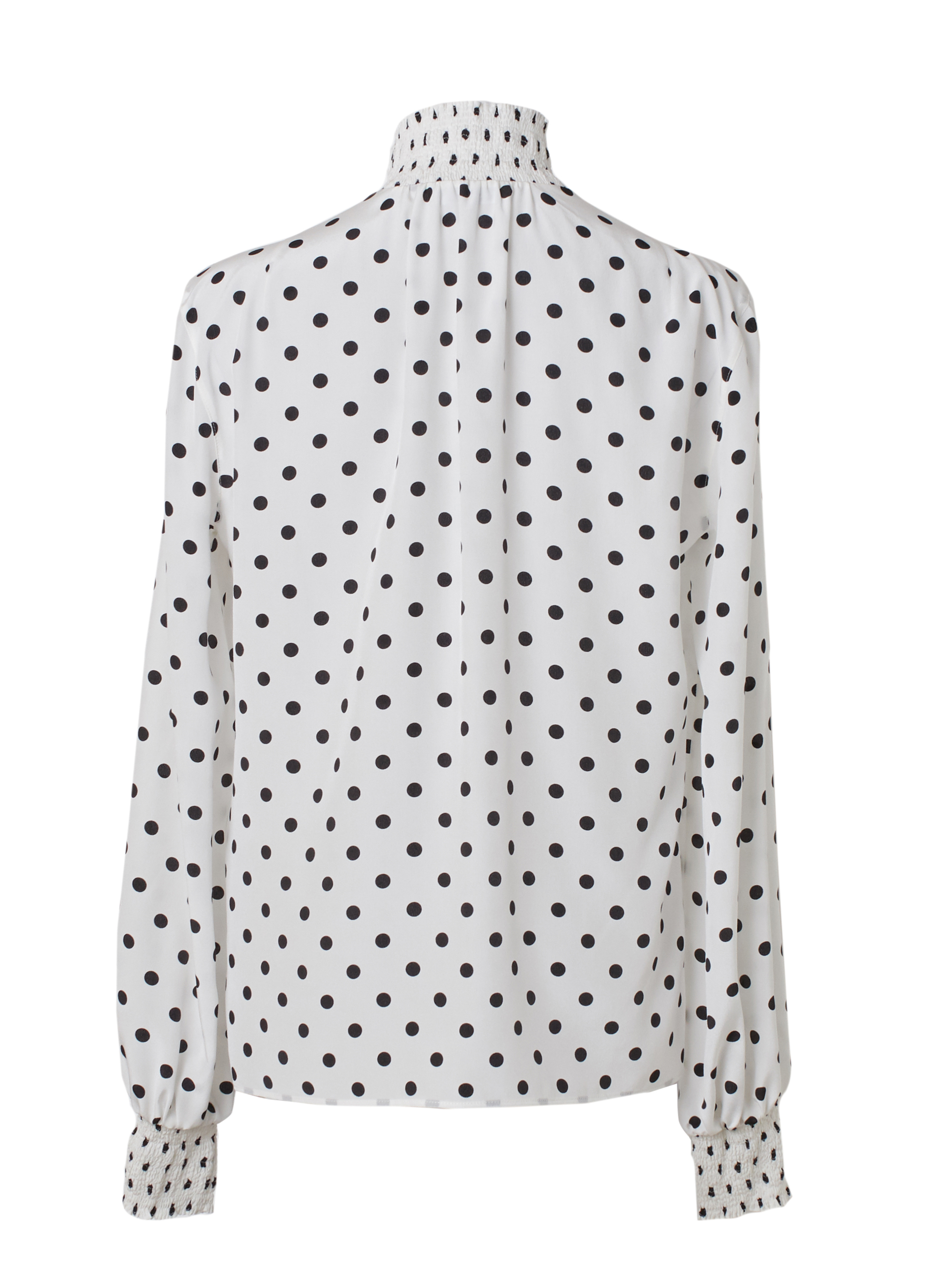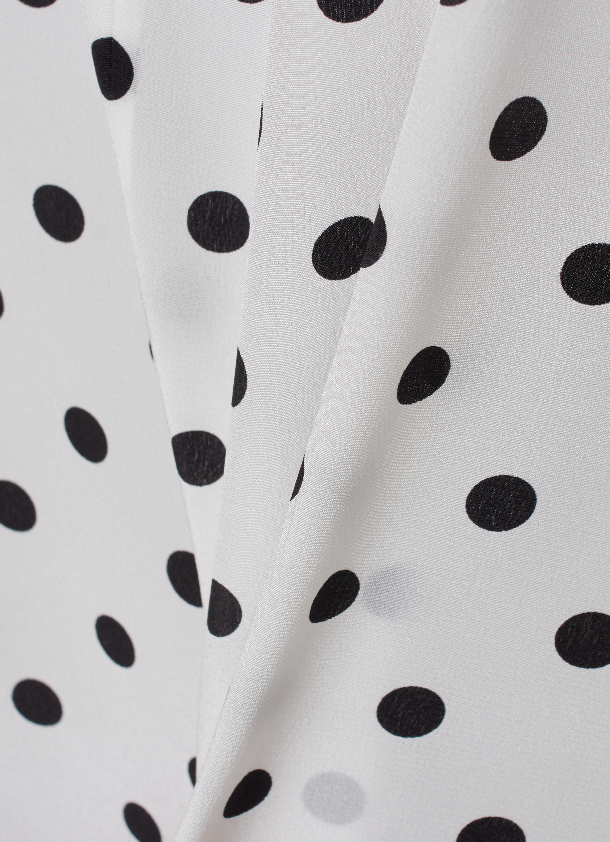 白地に黒のドット柄がクラシカルな雰囲気を演出し、襟元のリボンタイが上品なアクセントに。