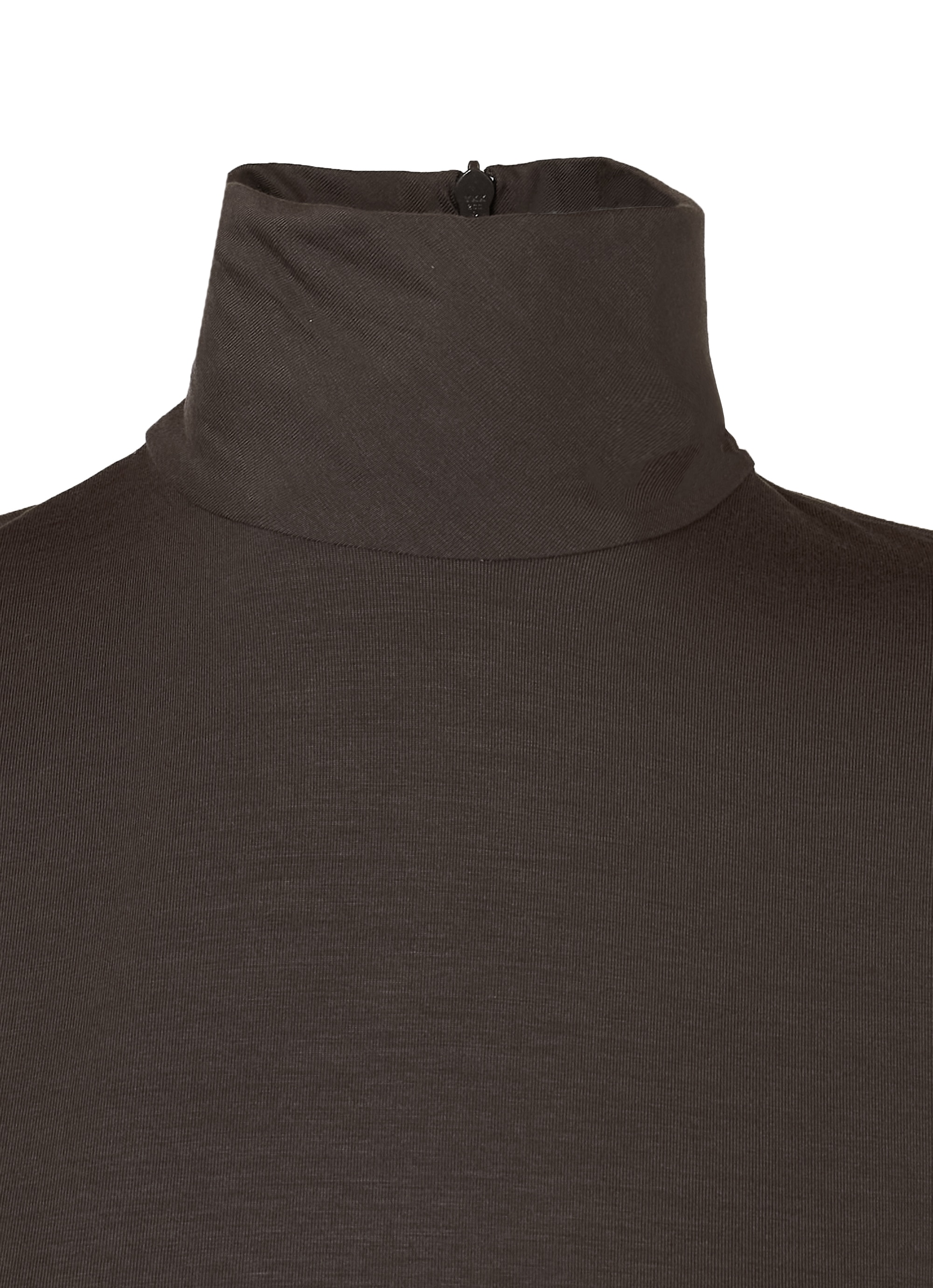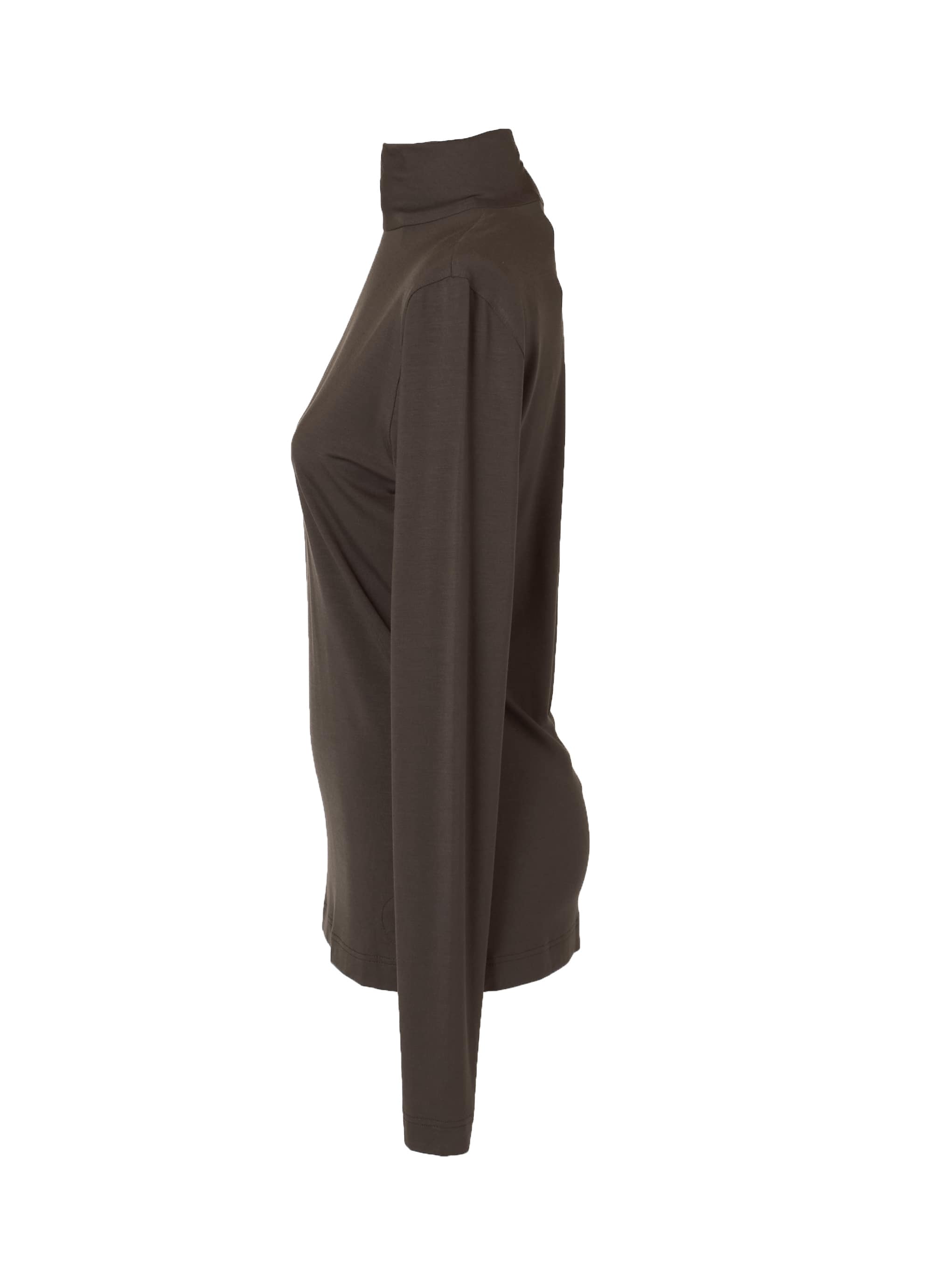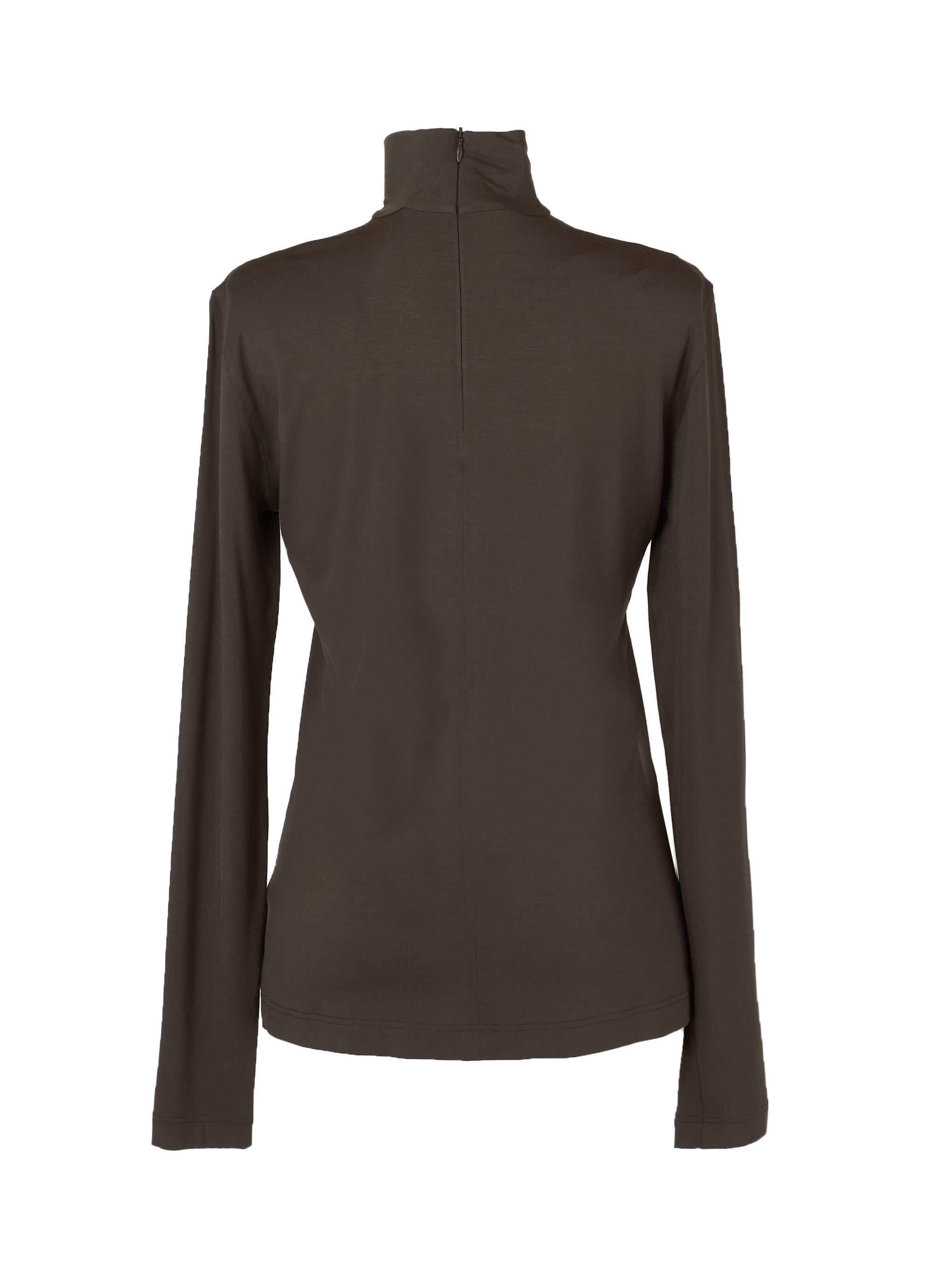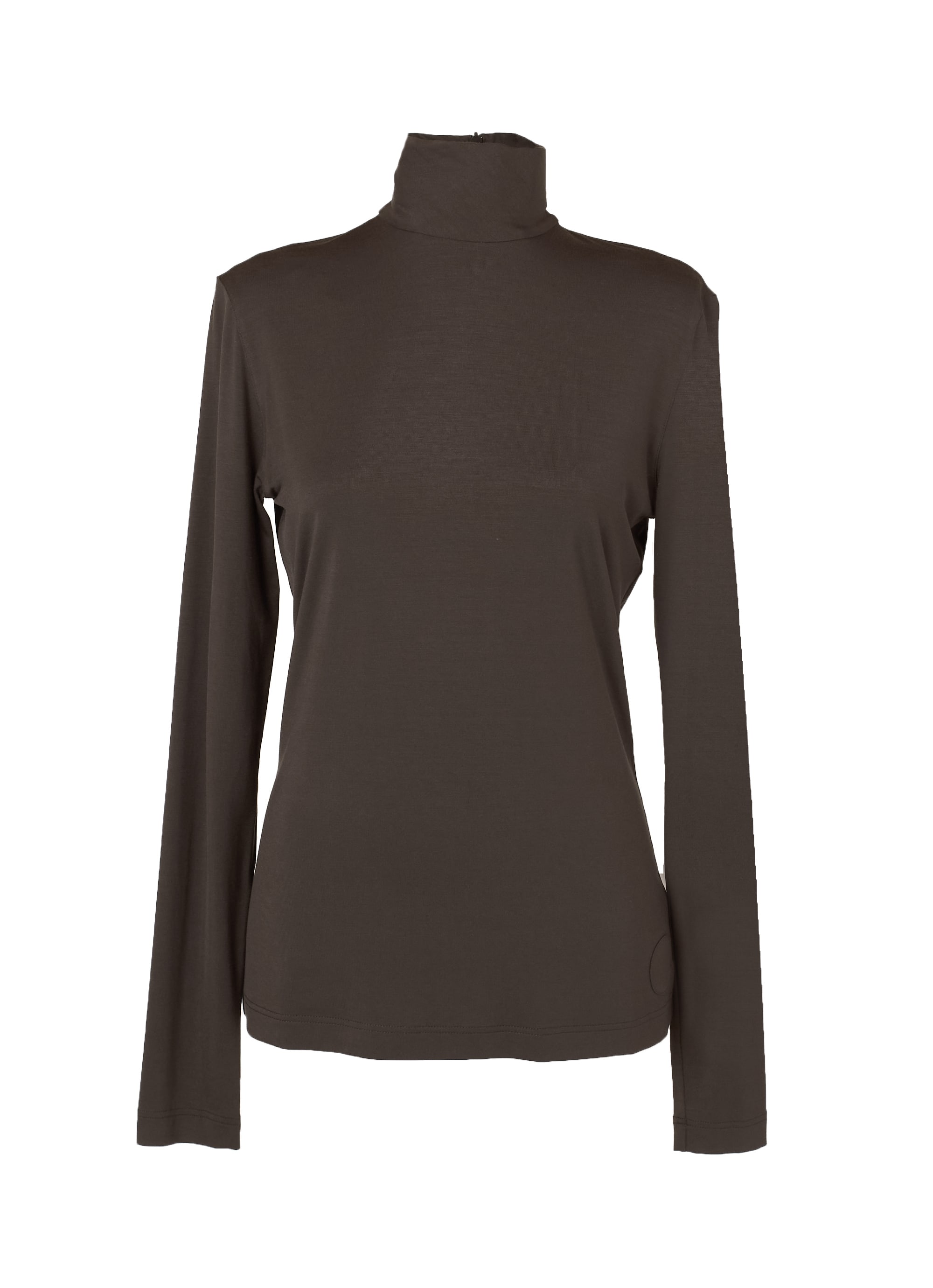 しなやかで肌触りの良いレーヨンにポリウレタンを加えた、ストレッチ素材のタートルネックトップス。