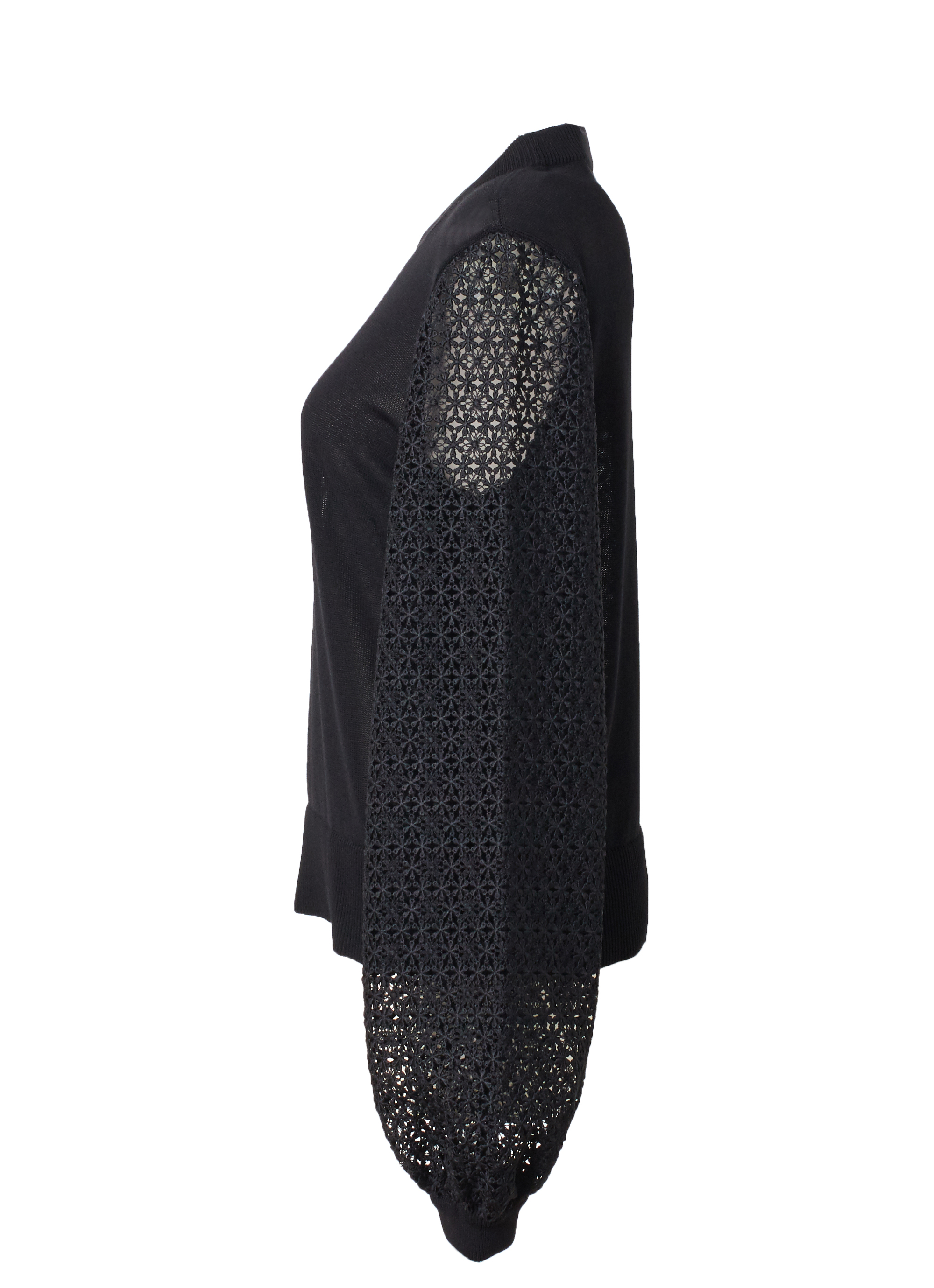 身頃は落ち感のある美しいシルエットを演出し、袖部分には繊細なレースを使用することで軽やかで華やかな印象に。