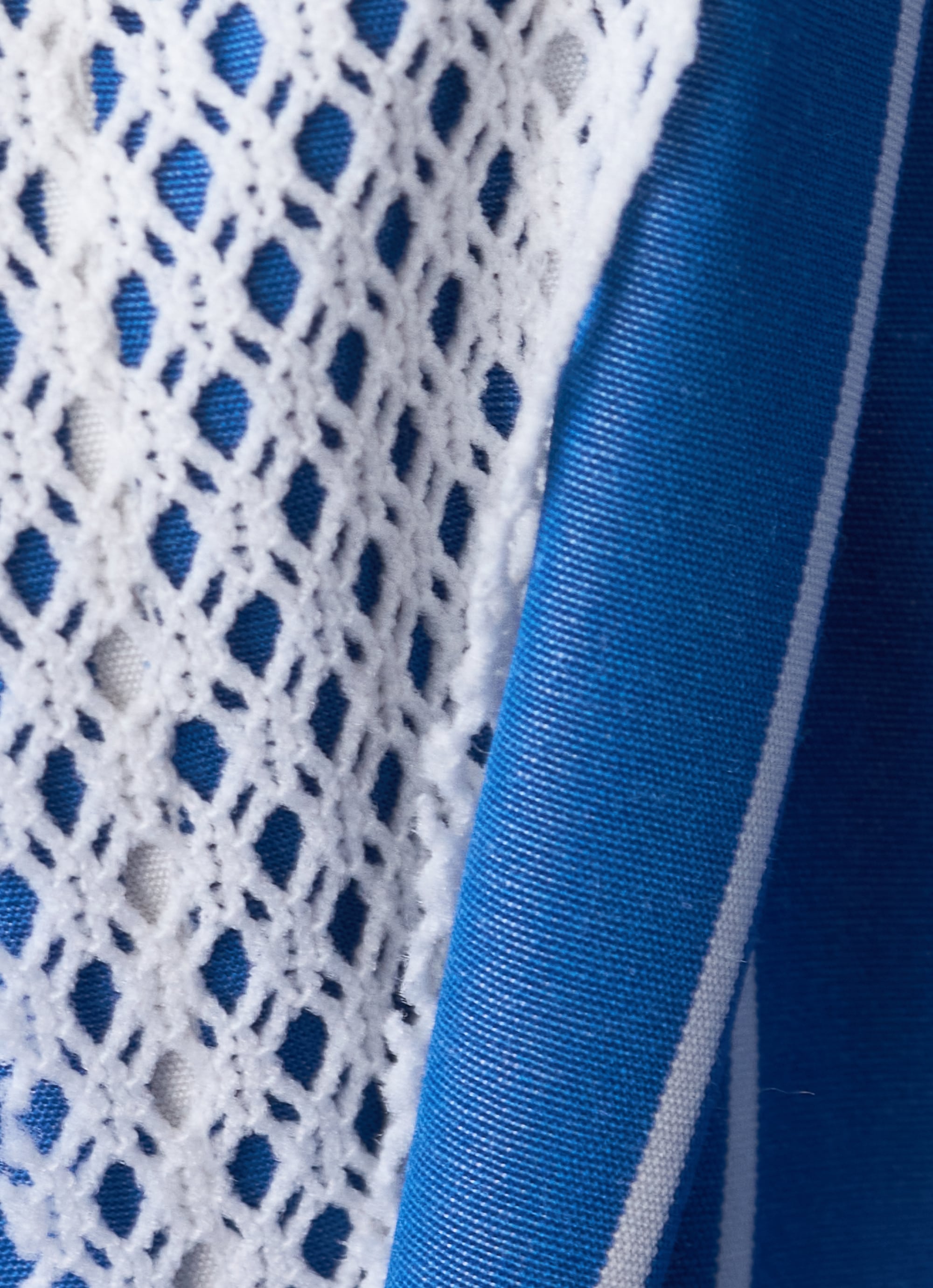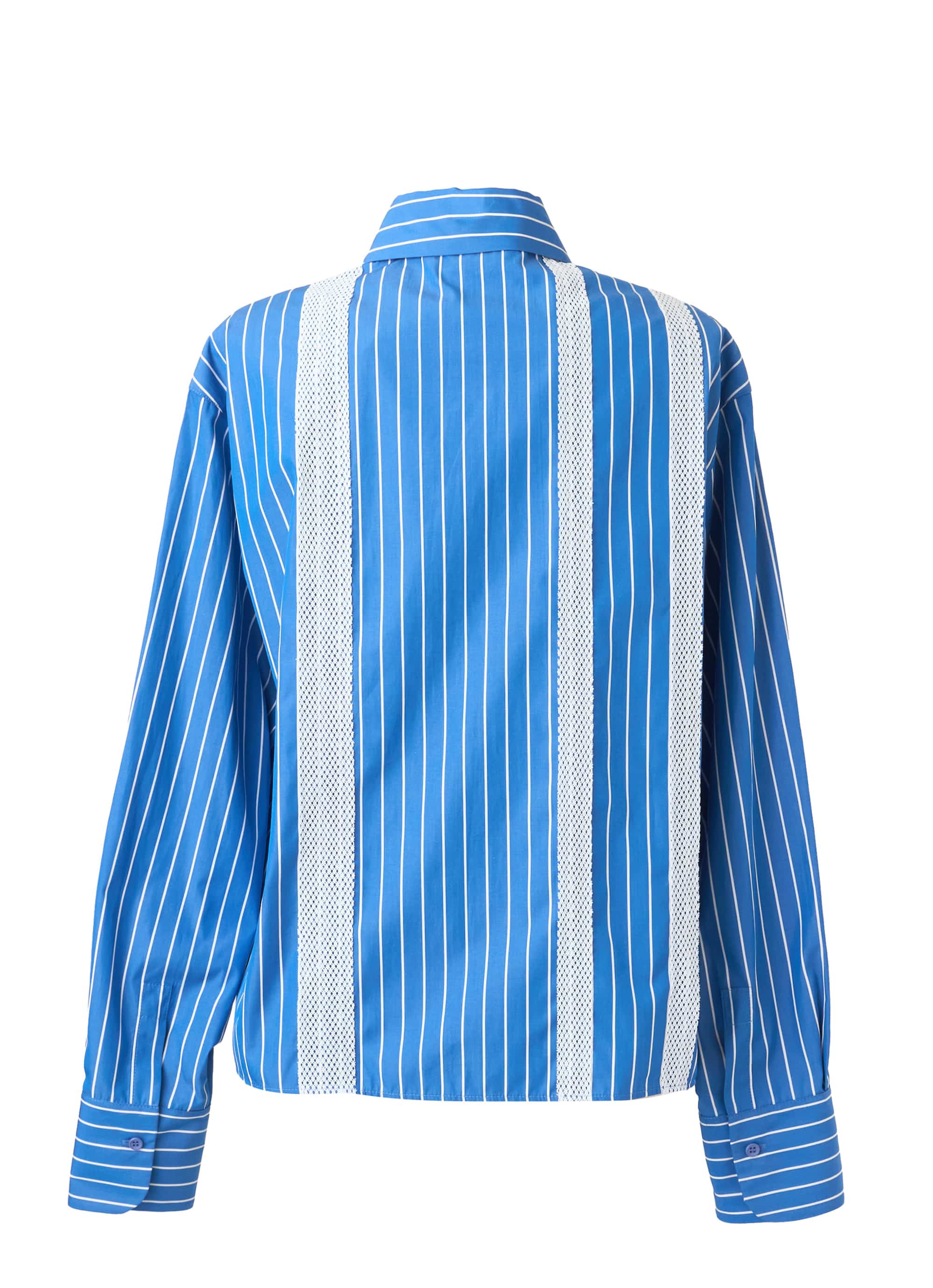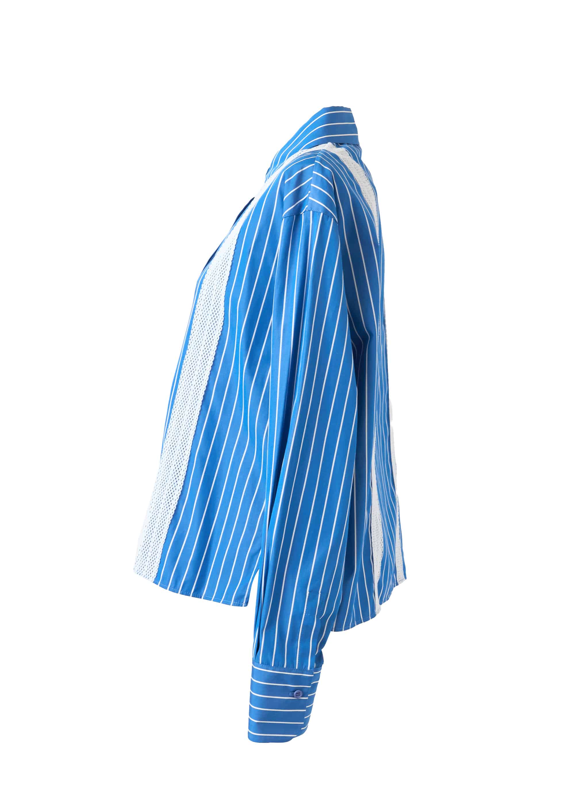 直線的なボクシーシルエットに、短めの着丈を組み合わせることで、抜け感のあるモダンなバランスに。比翼仕立てのフロントがストライプ柄をすっきりと演出し、胸元に走るメッシュテープが繊細なアクセントを添えています。