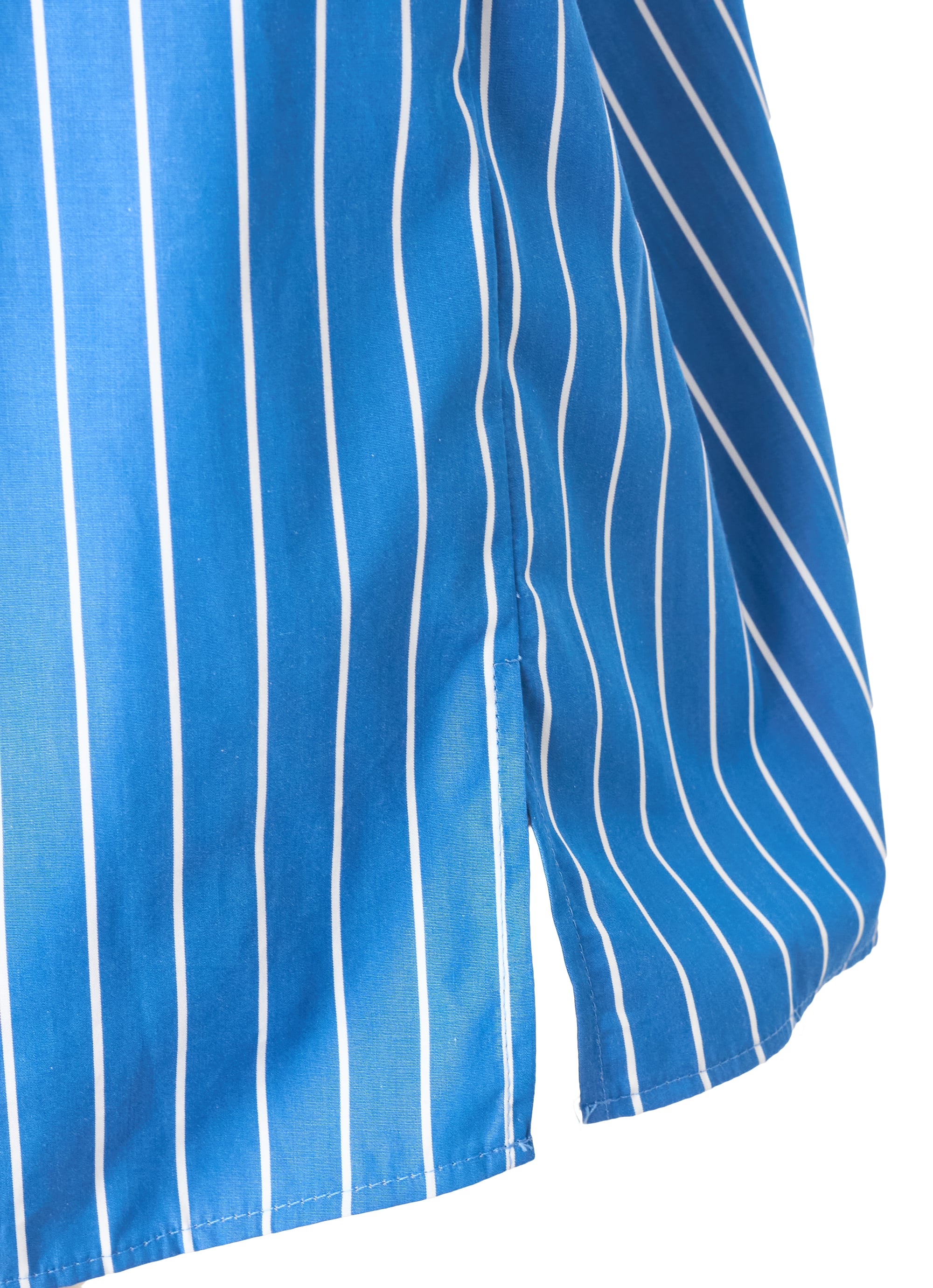 綿とポリエステルをブレンドした軽やかな素材は、クリーンなハリと快適な肌触りを兼ね備え、リラックス感のあるストライプ柄をより上品に引き立てます。