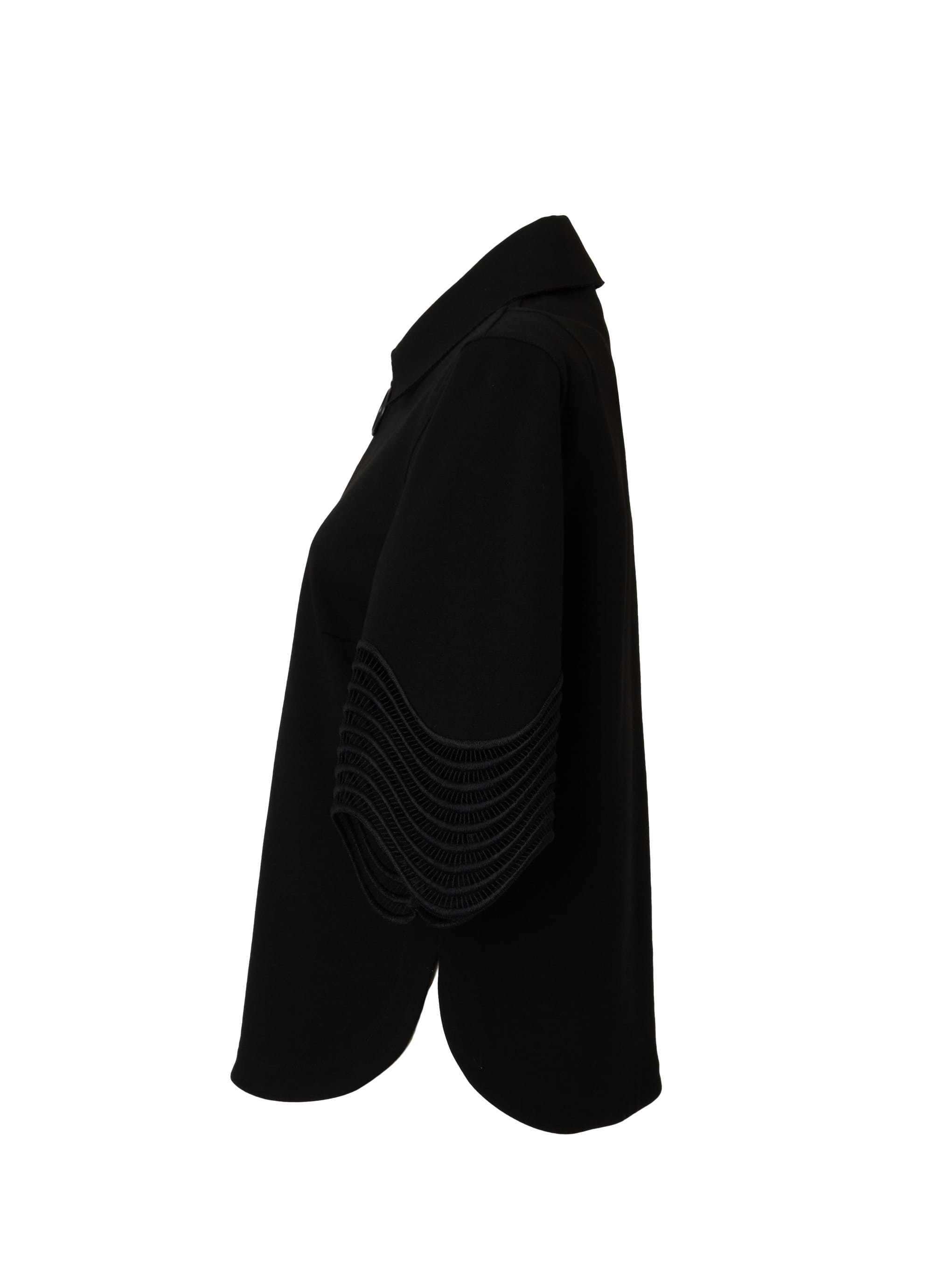 丸みのあるヘムラインが軽やかなバランスを生み、パンツにもスカートにも合わせやすい一枚です。