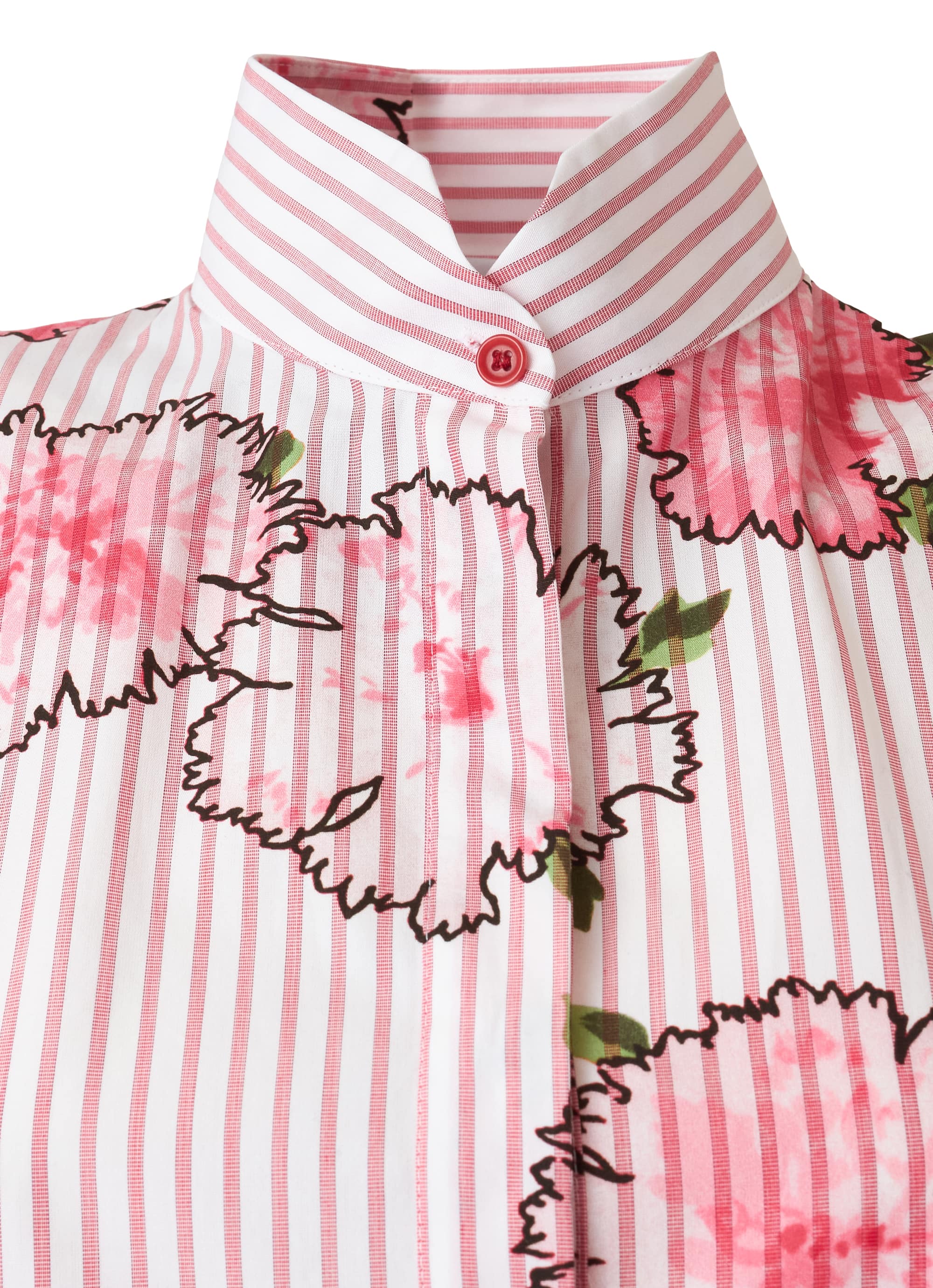 水彩タッチで描かれたカーネーション柄は、コレクションテーマ「花のエネルギーとしなやかさ」を象徴するモチーフ。シャツカラーと比翼仕立てのフロントが、可憐なプリントをクリーンな印象にまとめ、AKRIS punto独自のモダンさをプラスします。