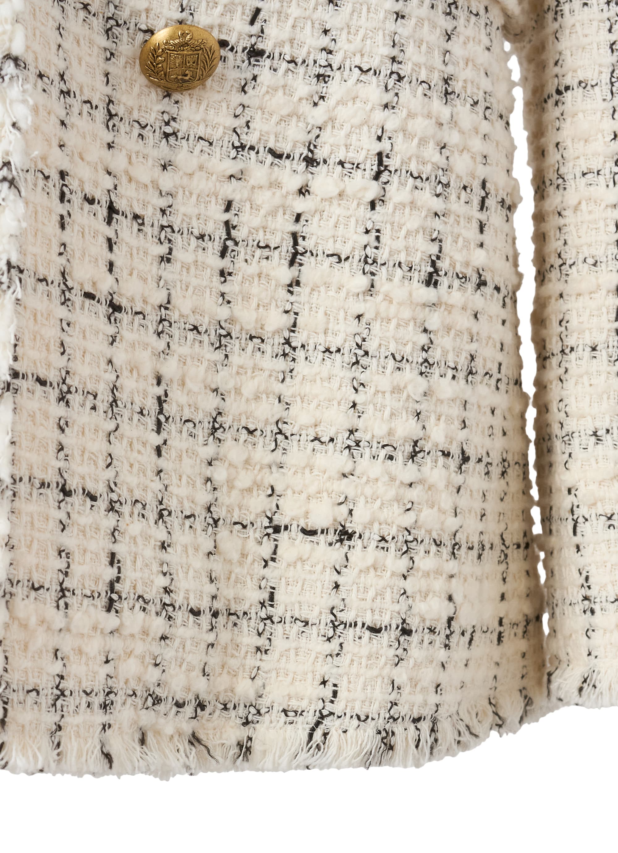 上質なツイード素材で仕立てた、ノーカラーのダブルジャケット。