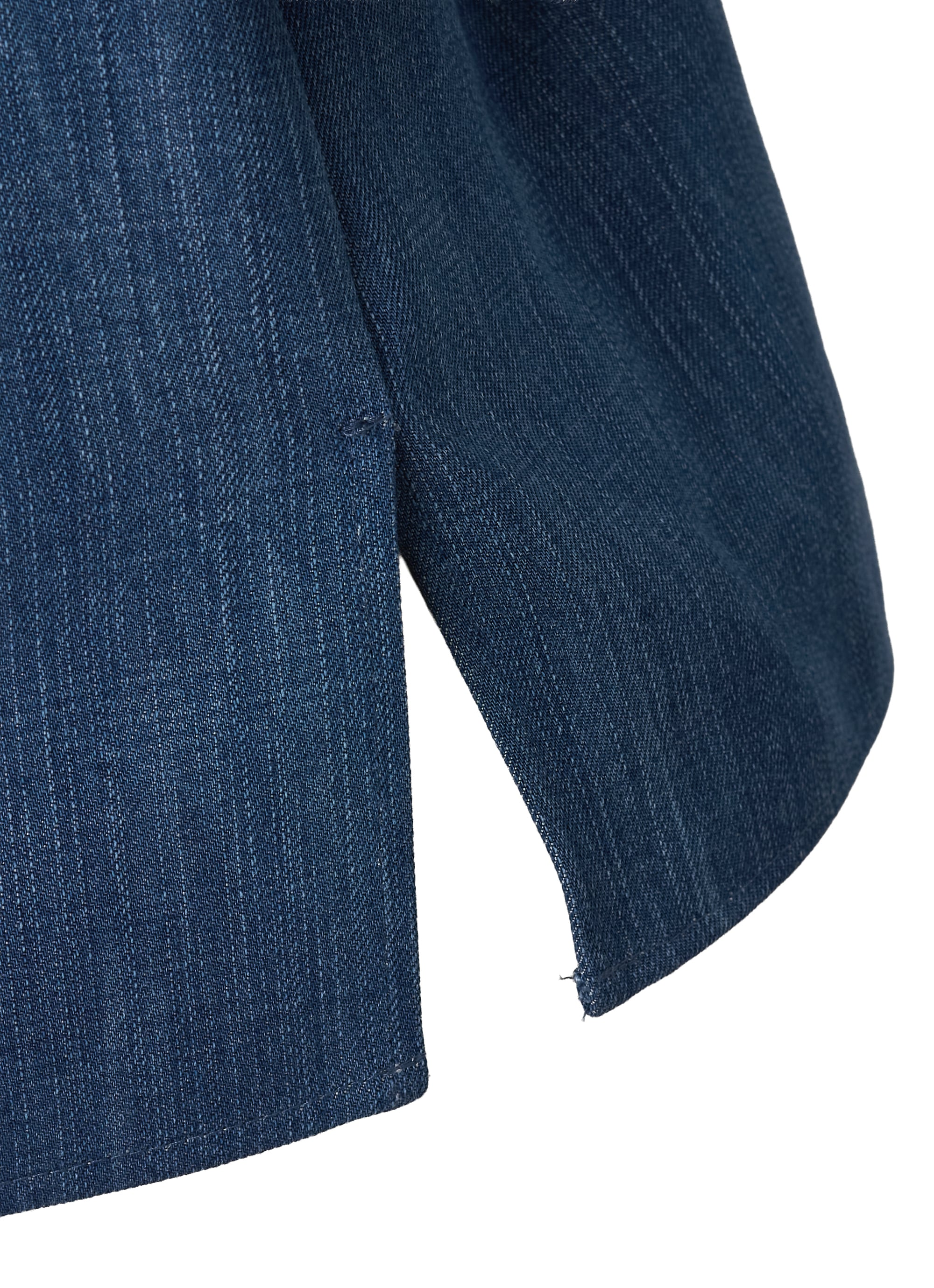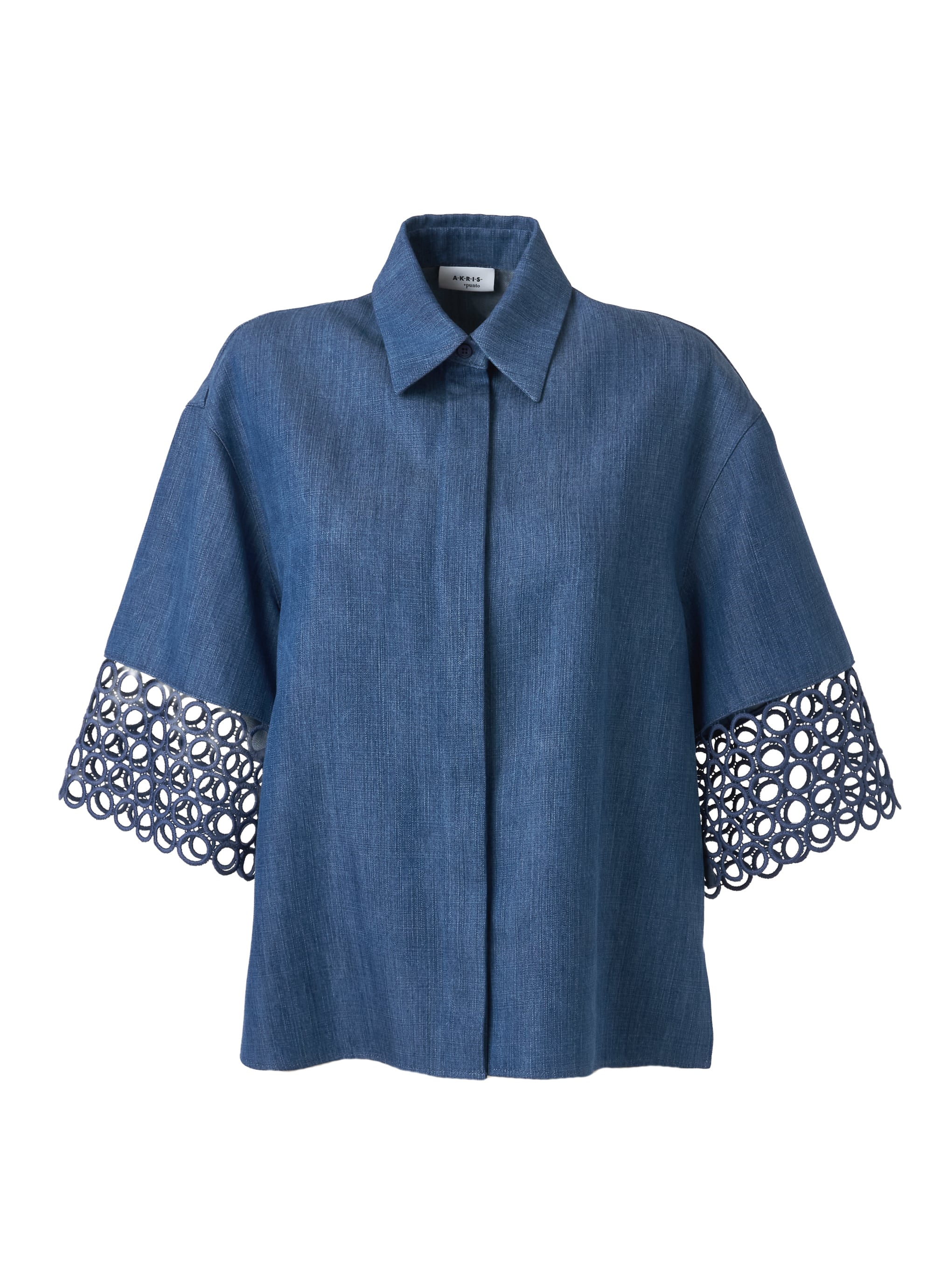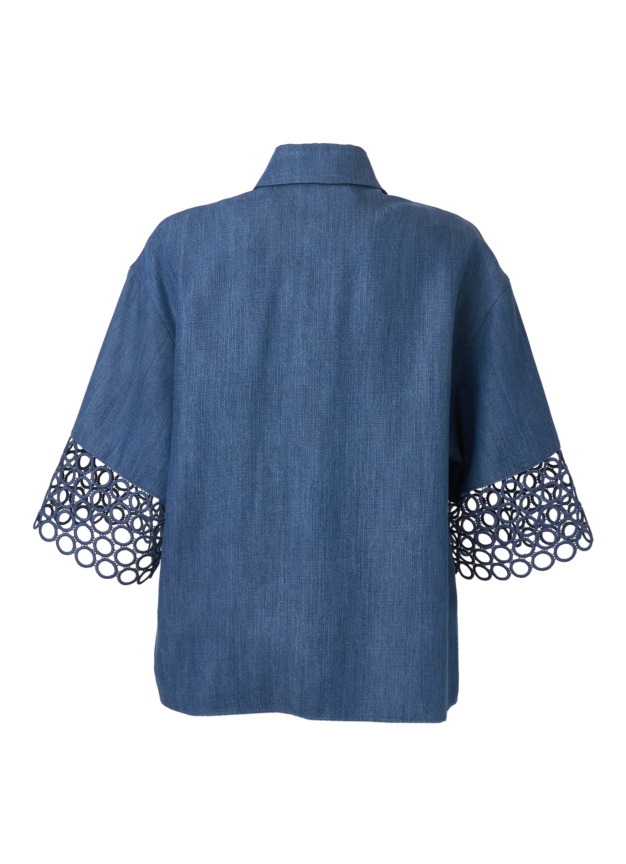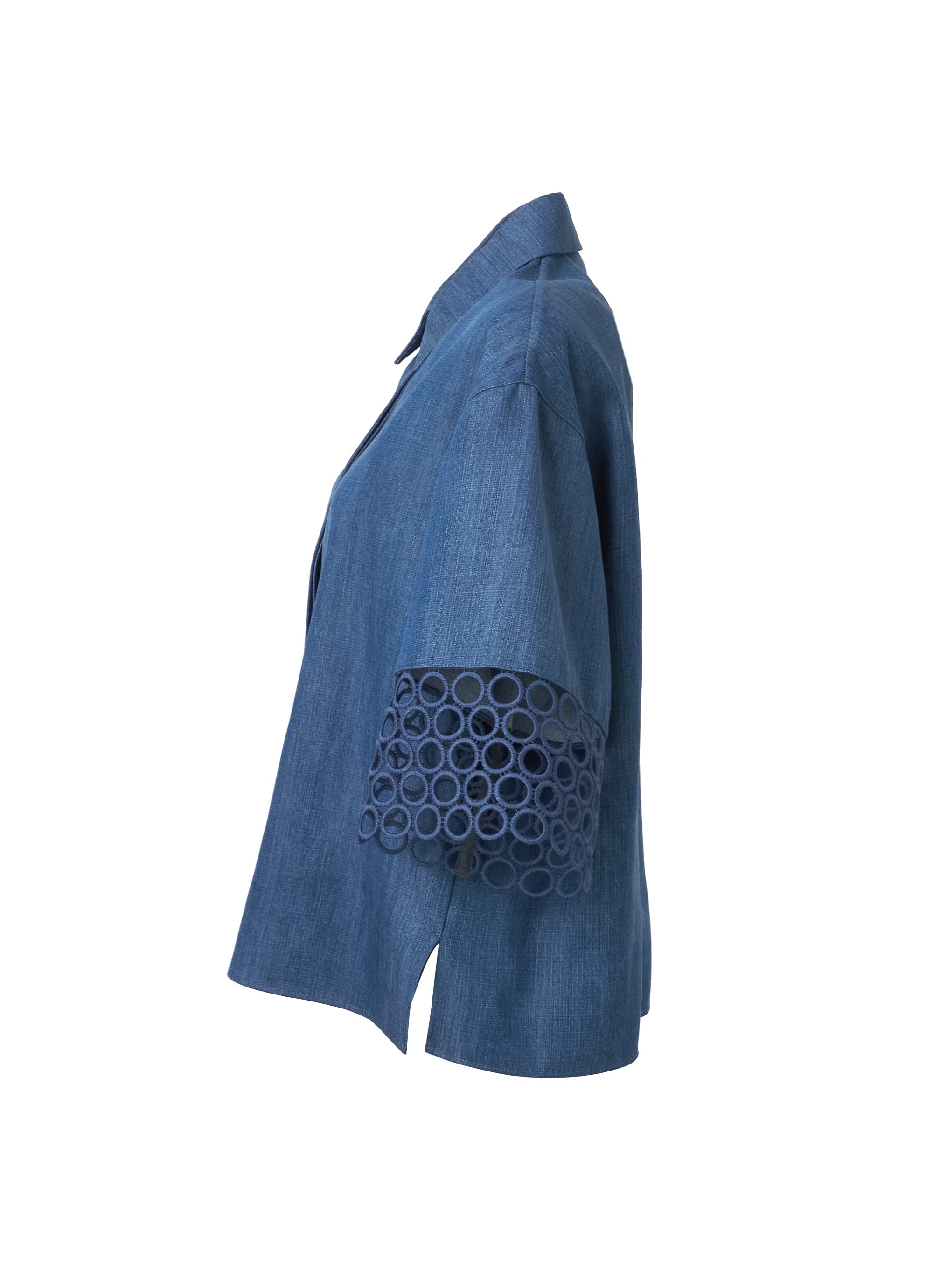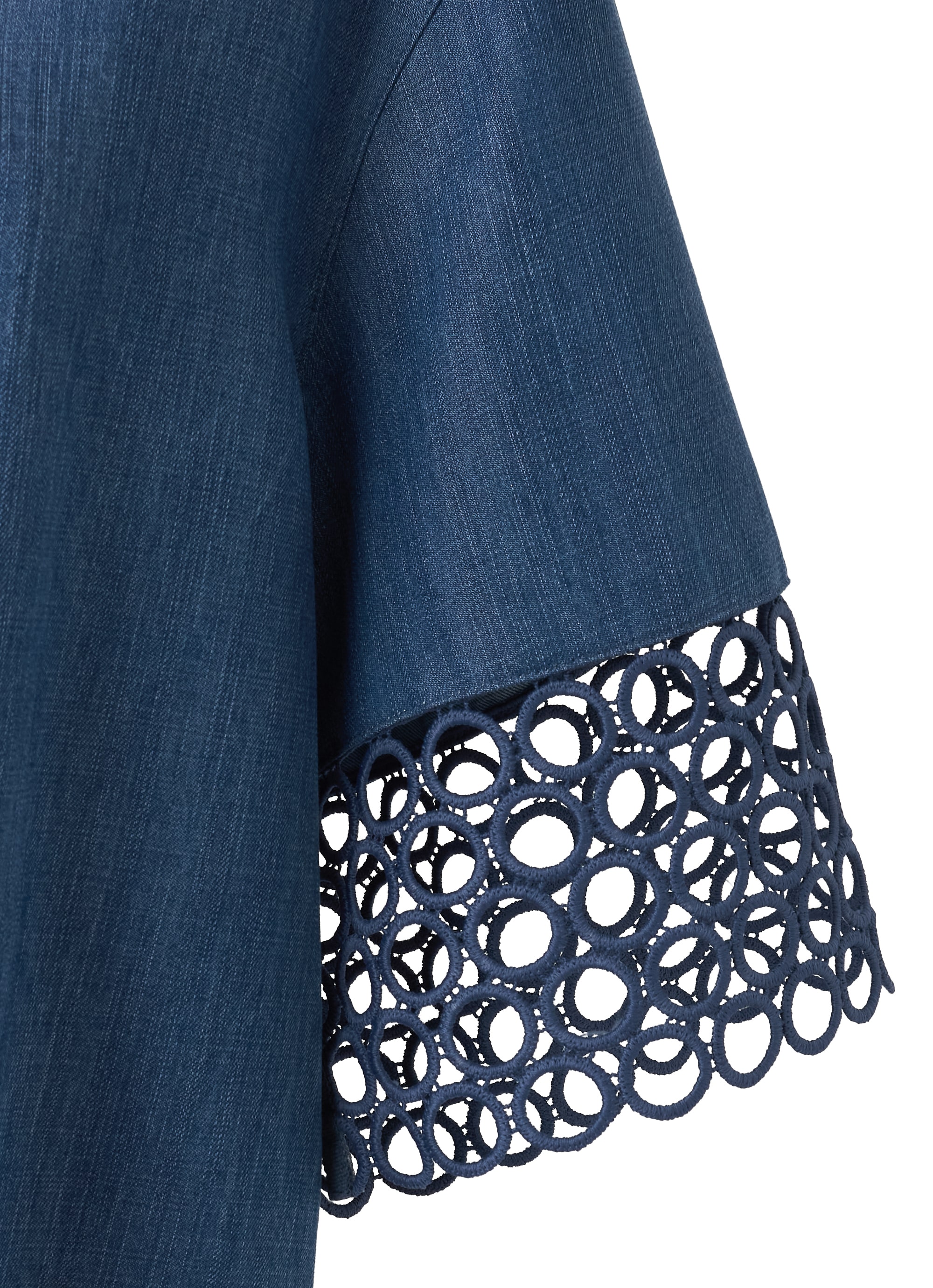 やわらかな落ち感が特徴のウォッシュドヴィスコース(レーヨン)デニムをベースに、袖口には繊細なアイレットギピュールレースを配し、上品なアクセントを加えています。