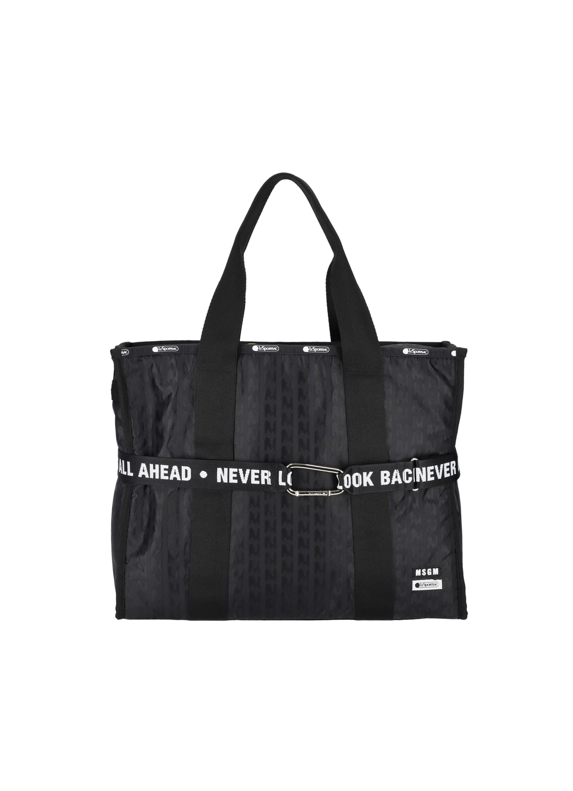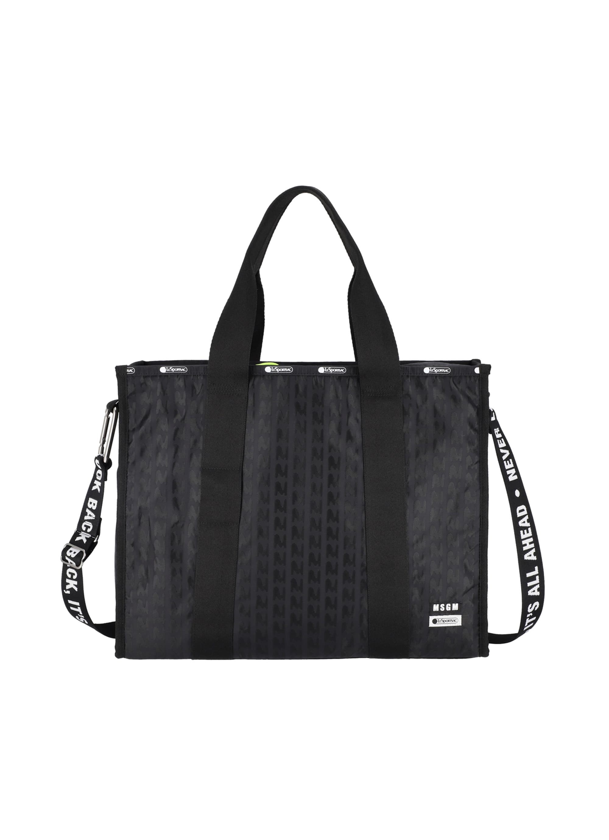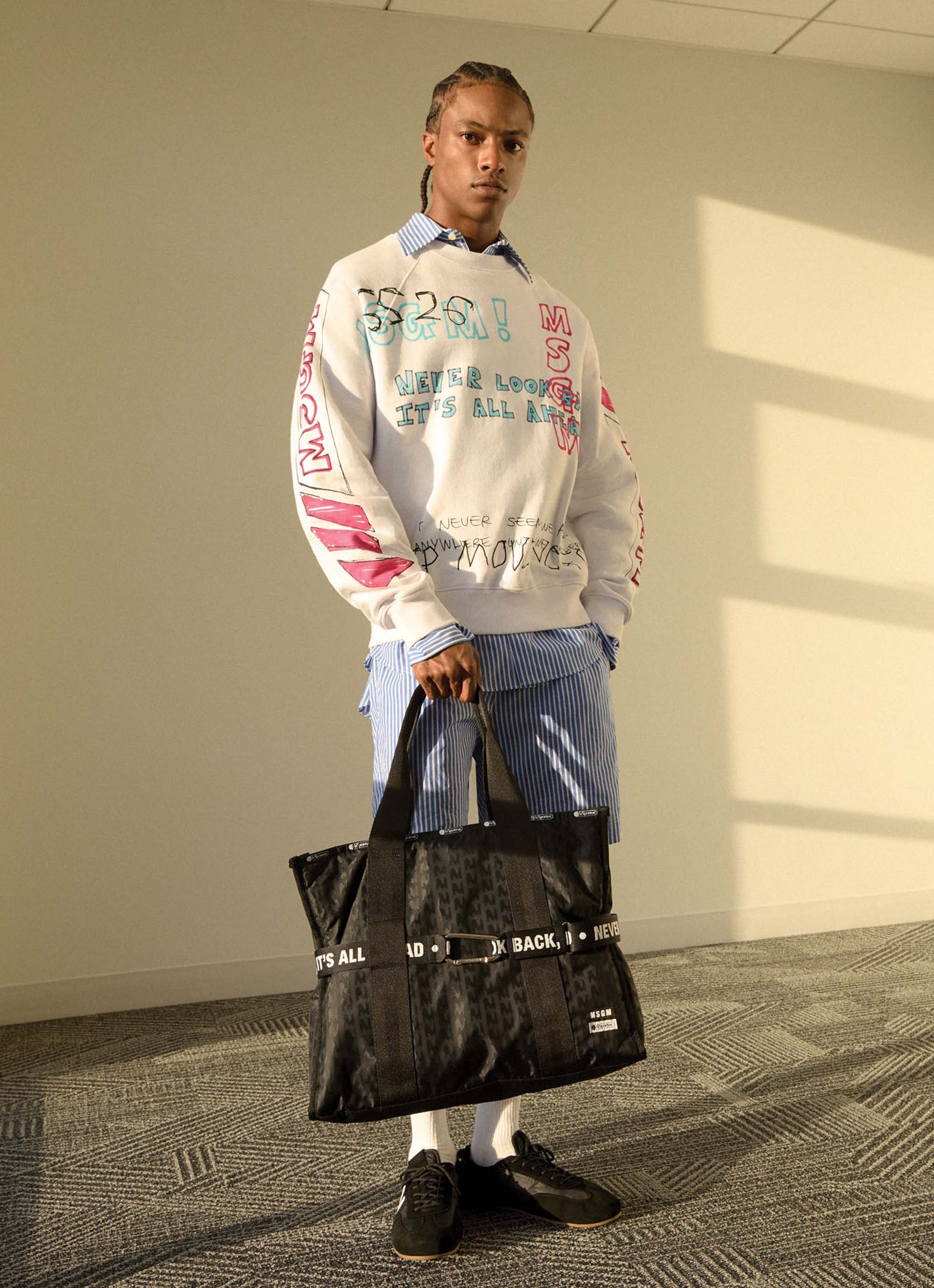 〈LeSportsac〉の軽やかな機能性に、〈MSGM〉のアイコニックな“TheMwave”モノグラムジャガードを重ねた「Large Boat Tote」。