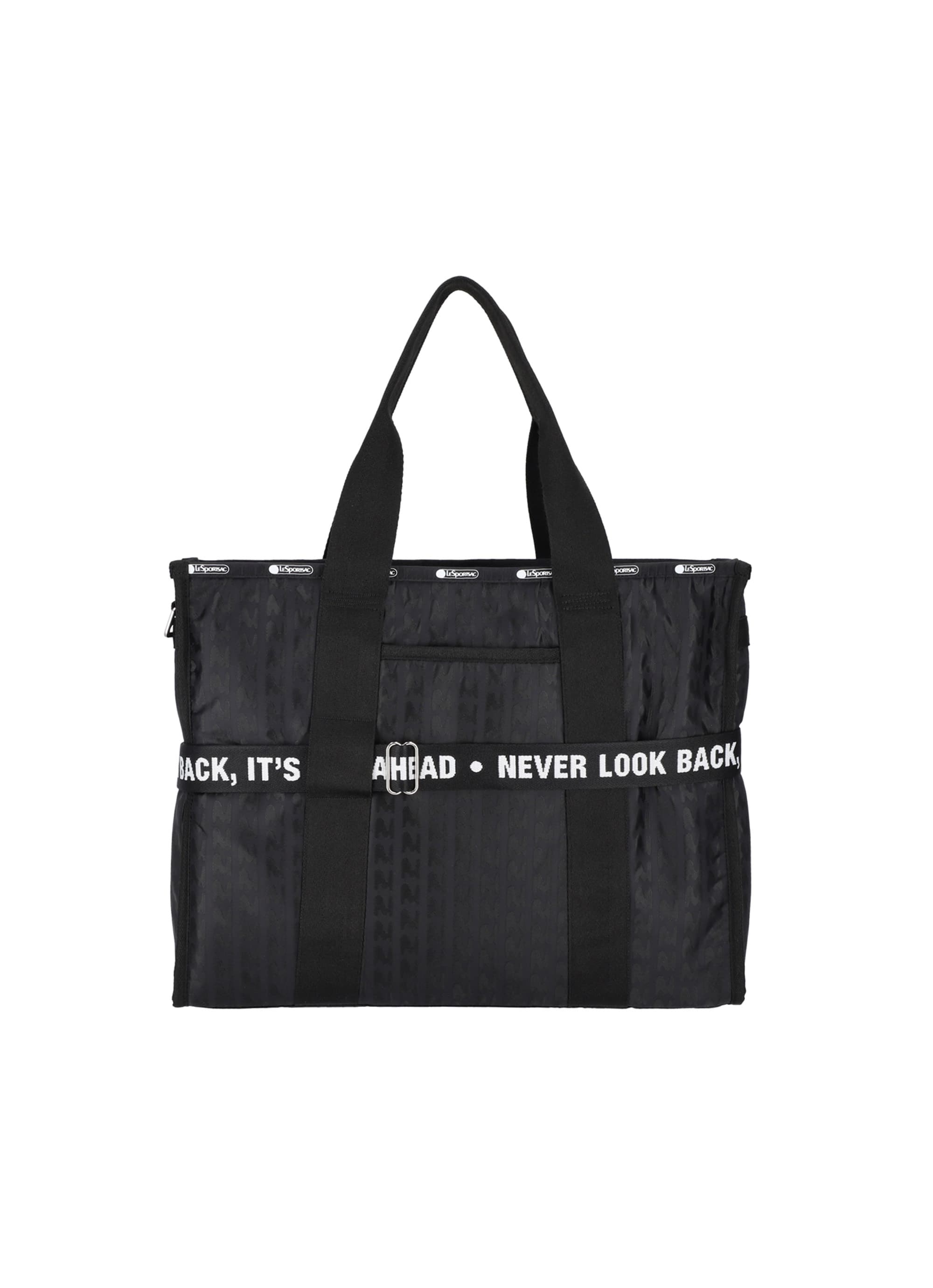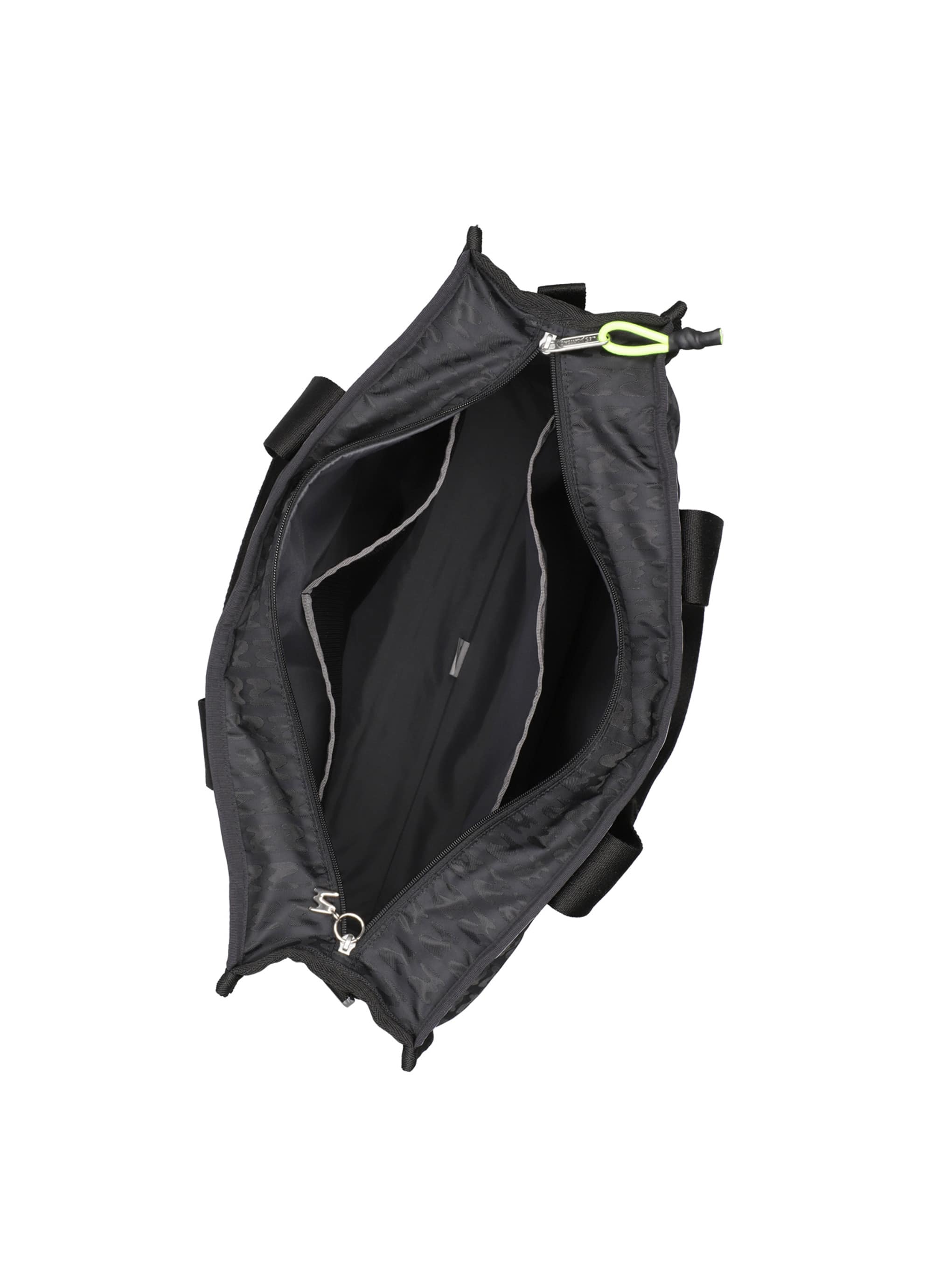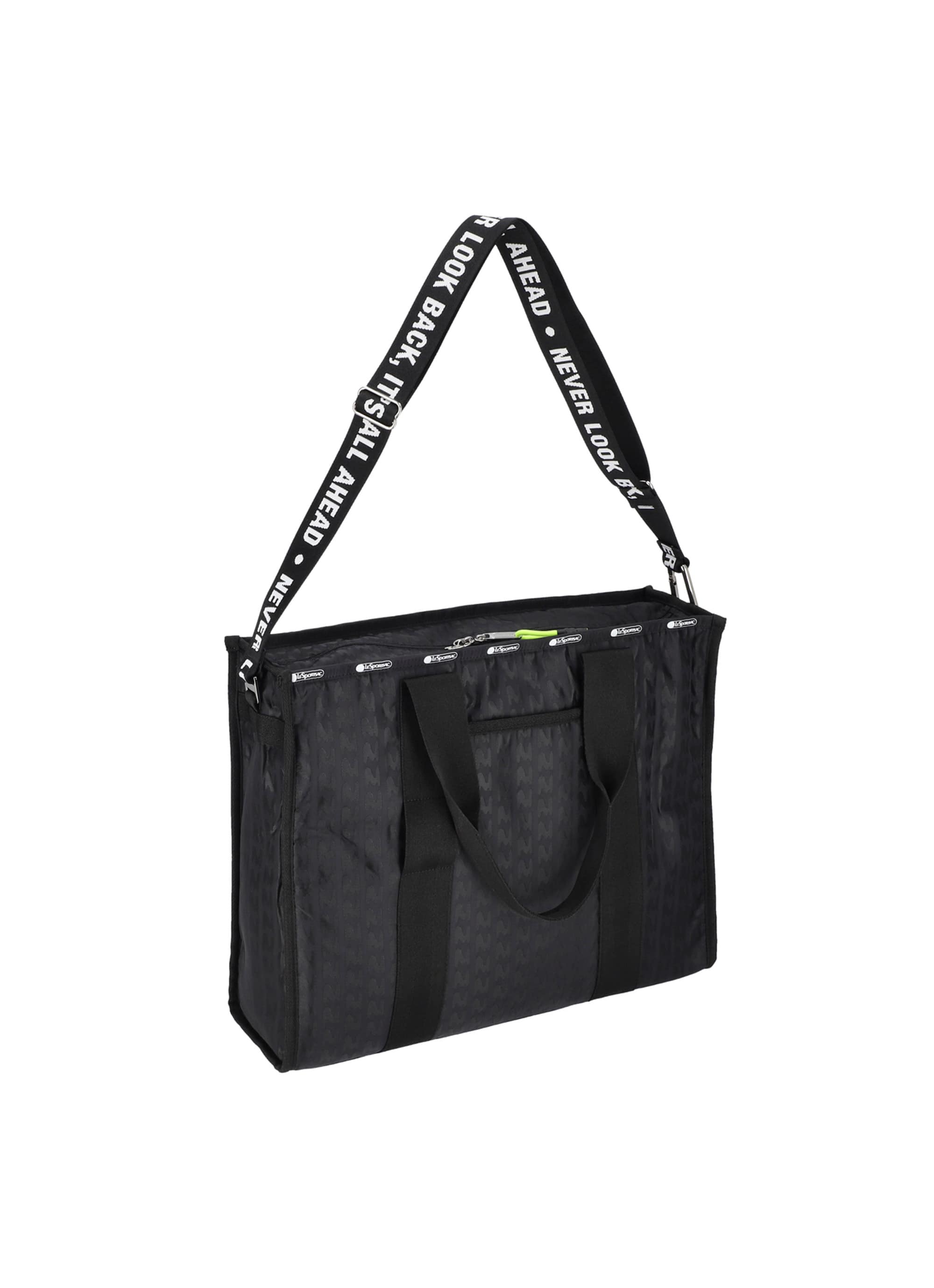 〈LeSportsac〉の軽やかな機能性に、〈MSGM〉のアイコニックな“TheMwave”モノグラムジャガードを重ねた「Large Boat Tote」。