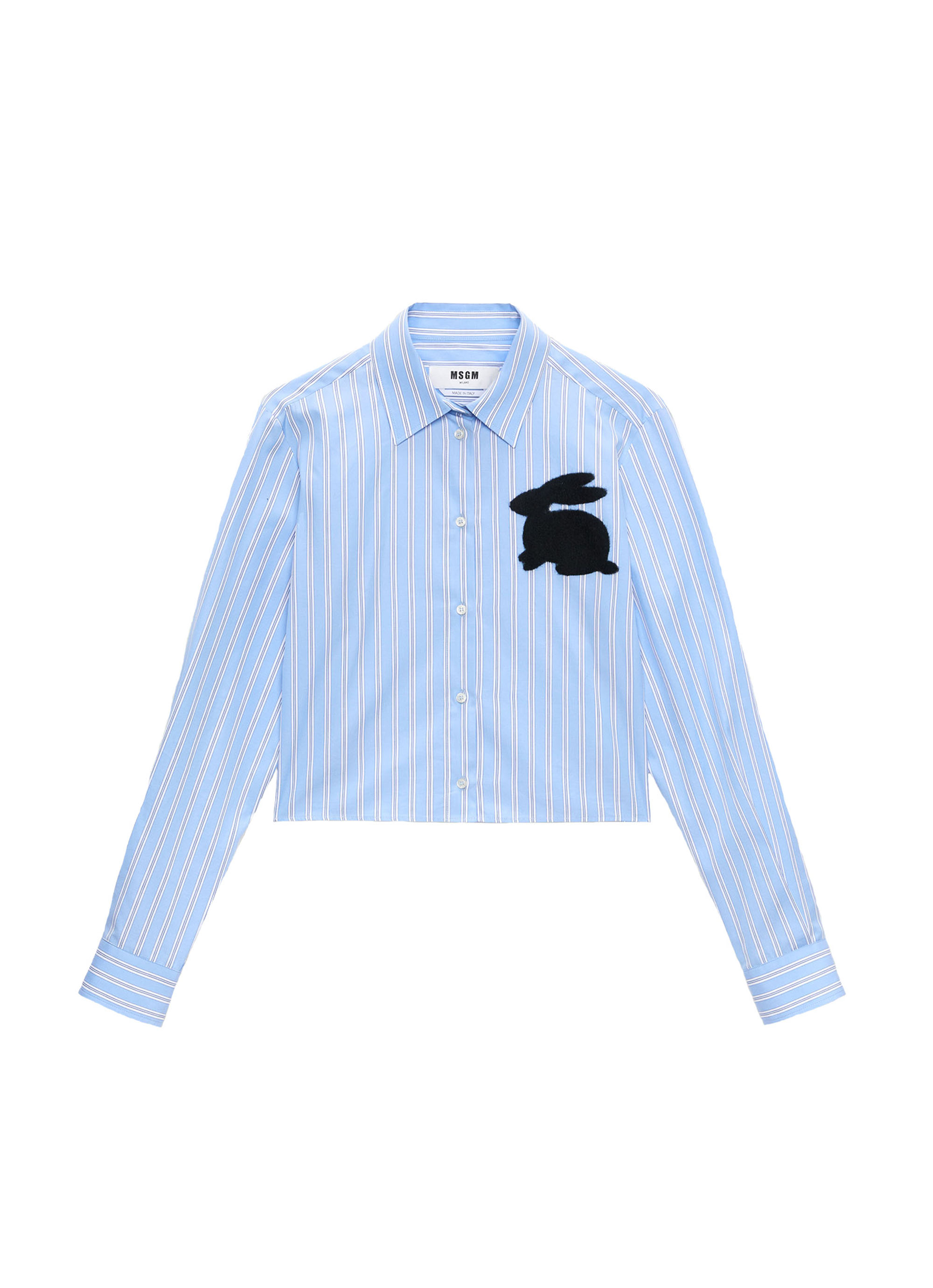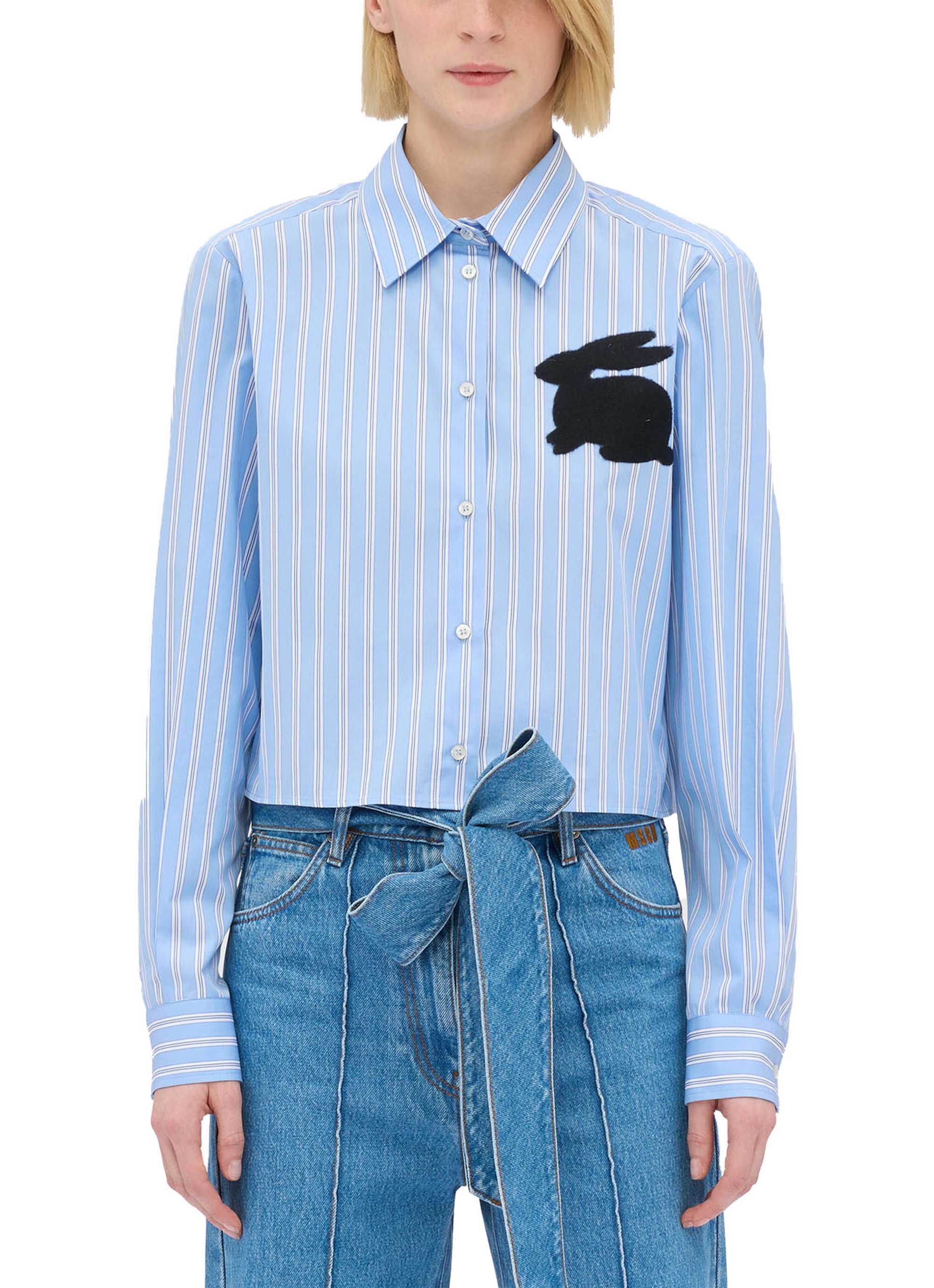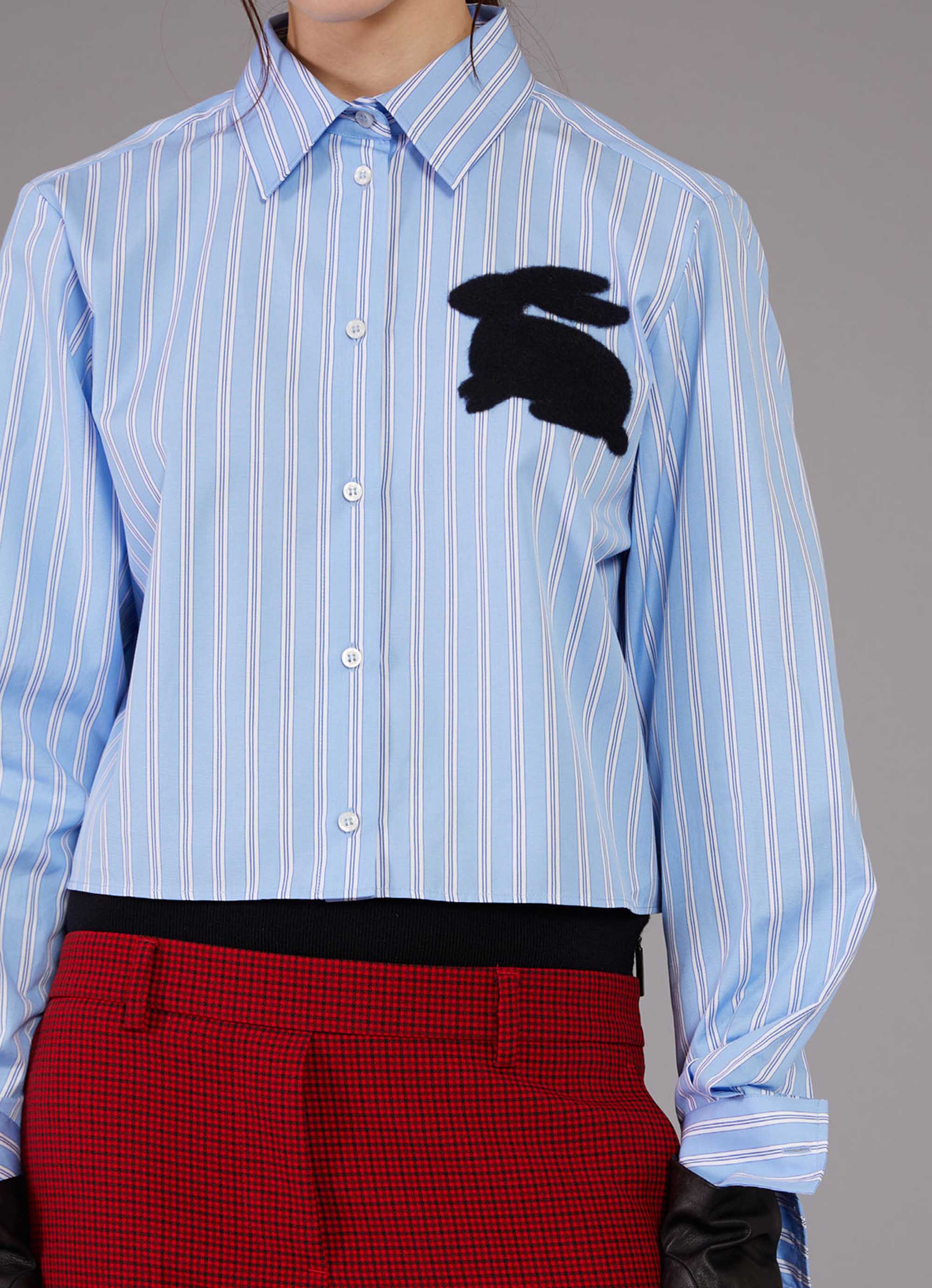 ライトブルーのストライプポプリンに、「BUNNY」モチーフのアップリケが映えるクロップドシャツ。