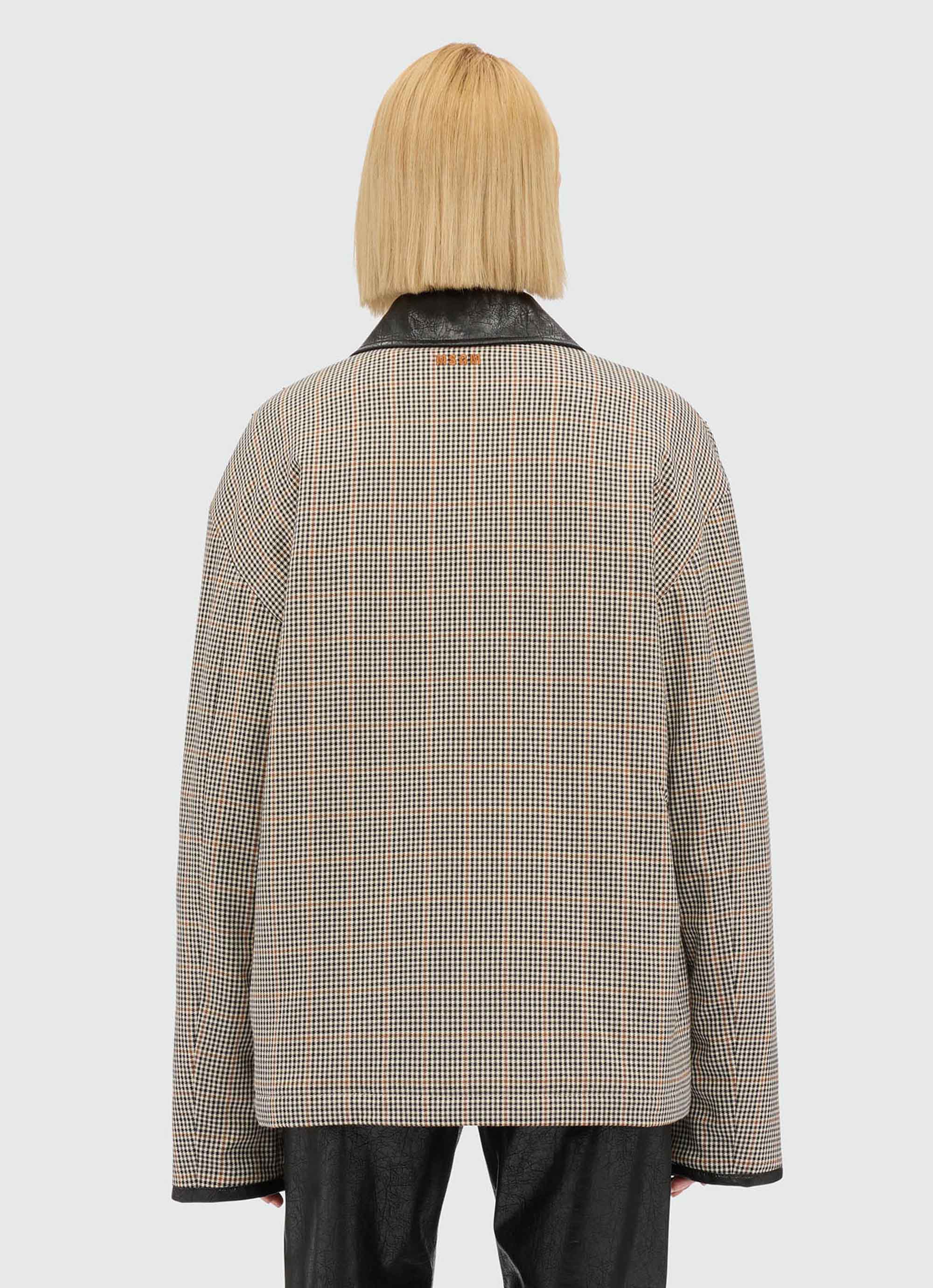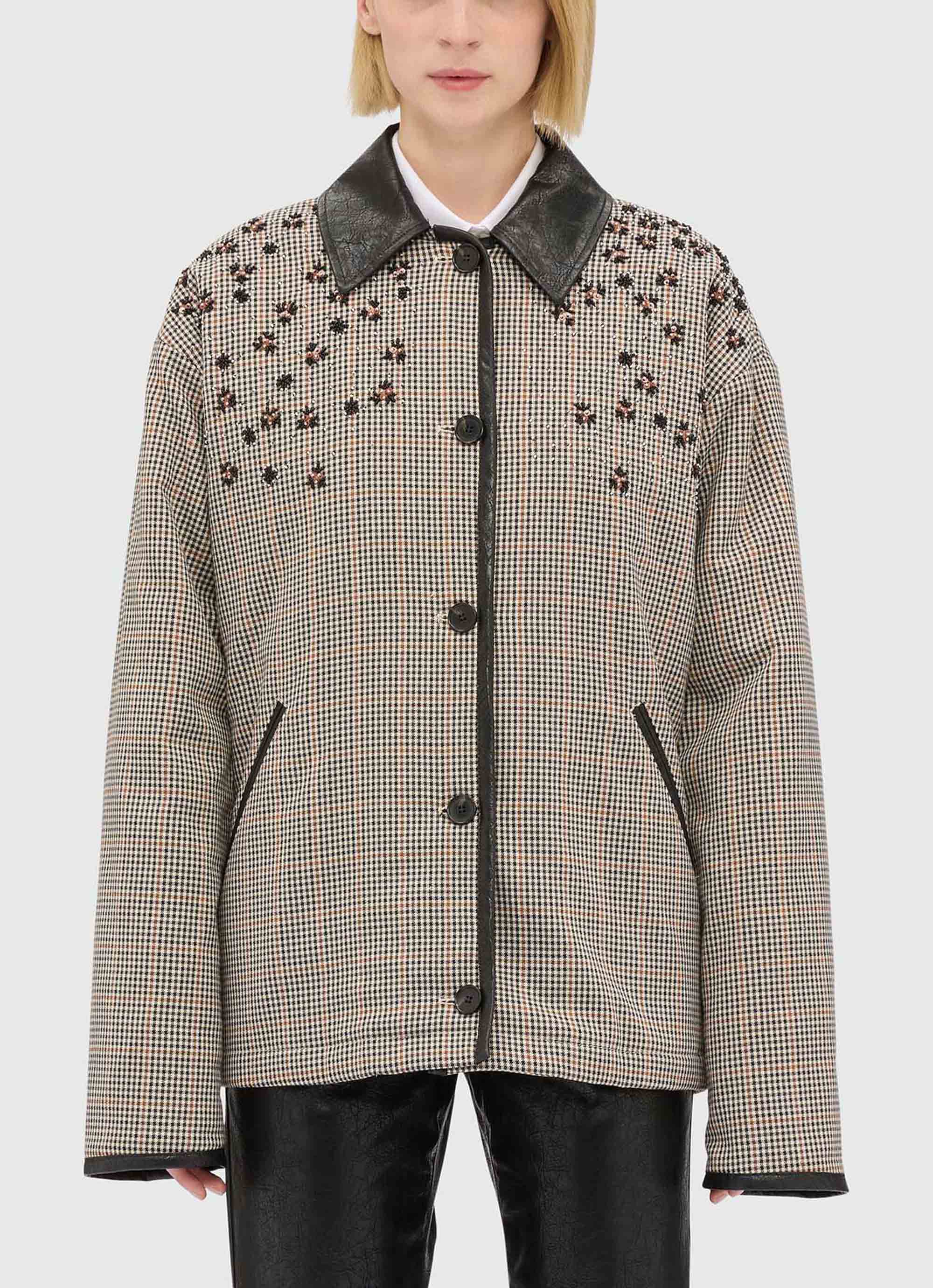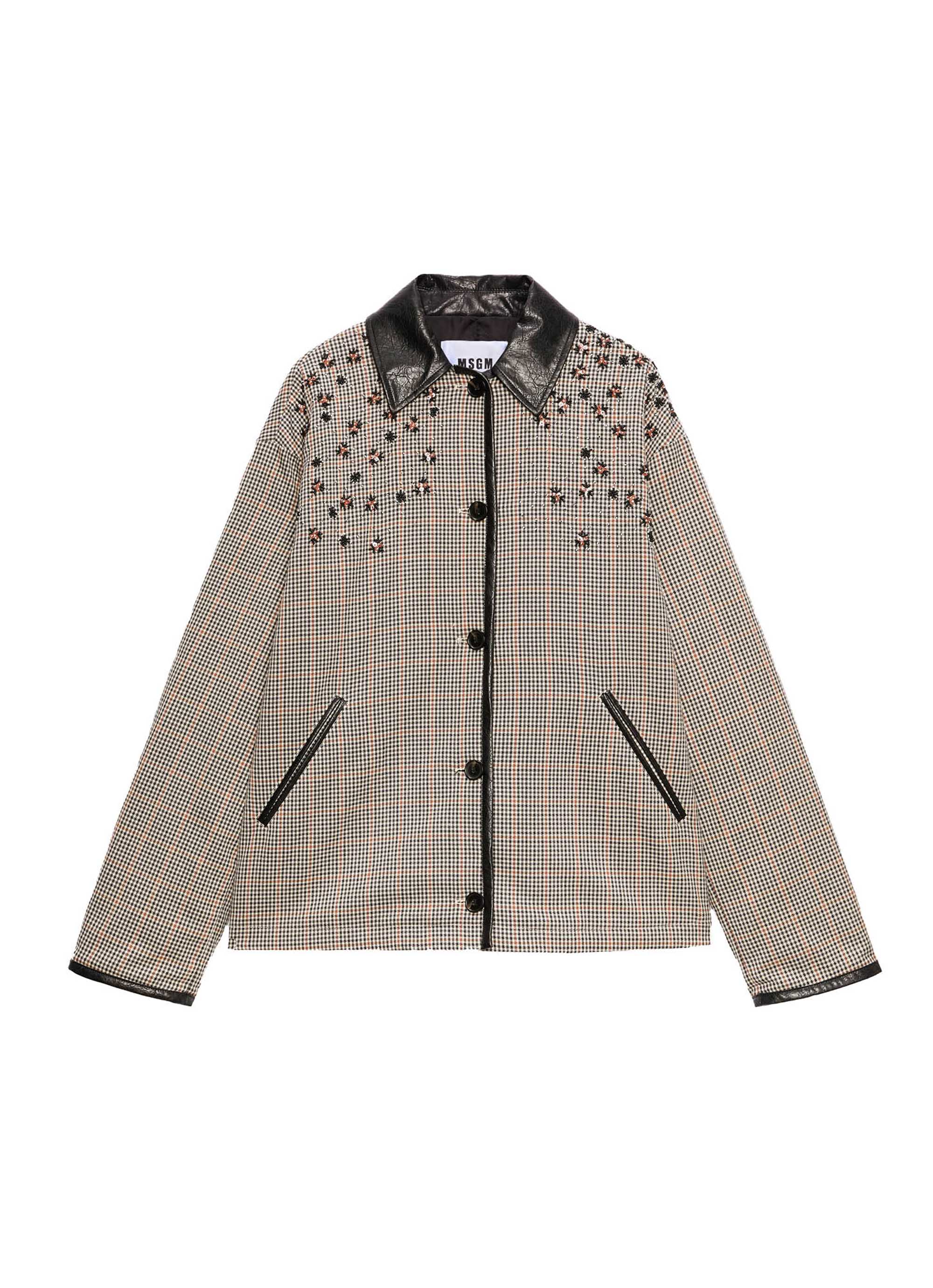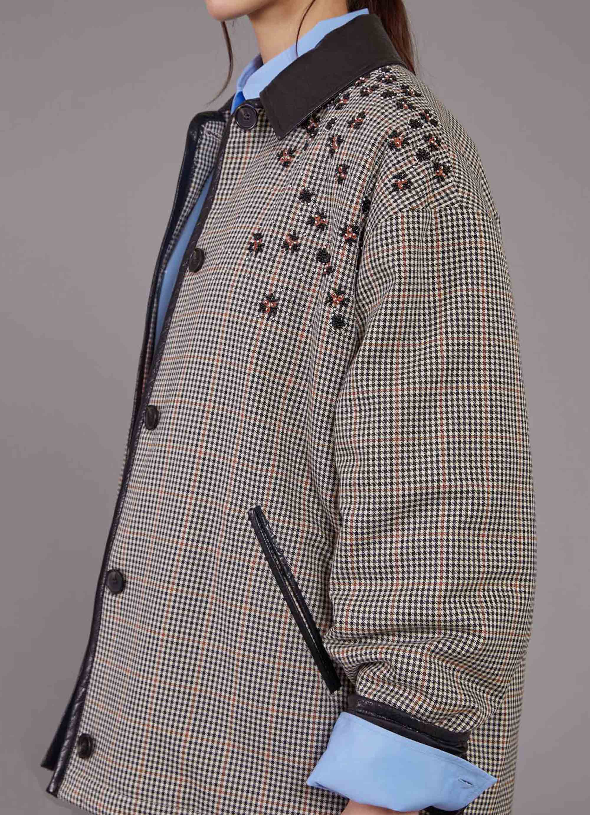 繊細な小花のビーズ装飾が目を惹く、ニュアンスベージュのミックスチェックジャケット。