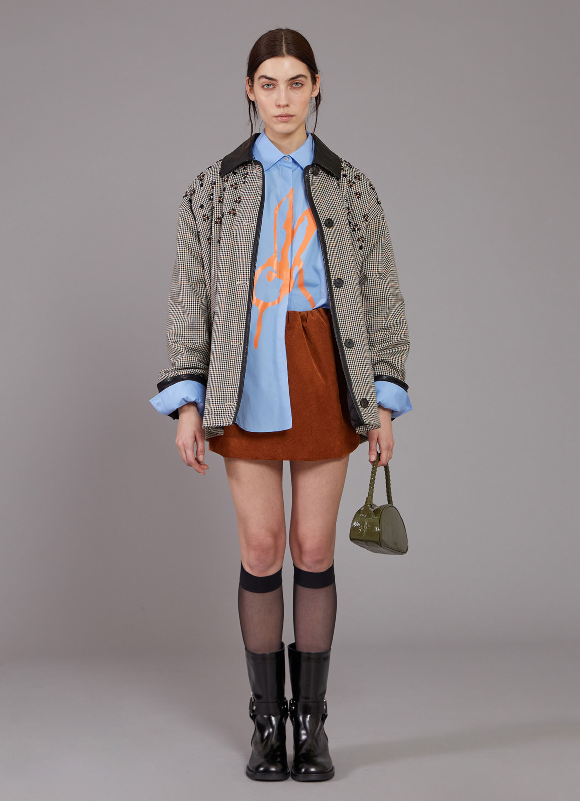 フェイクレザーの襟とトリムが甘さを抑え、スタイルにモードなニュアンスをプラス。
