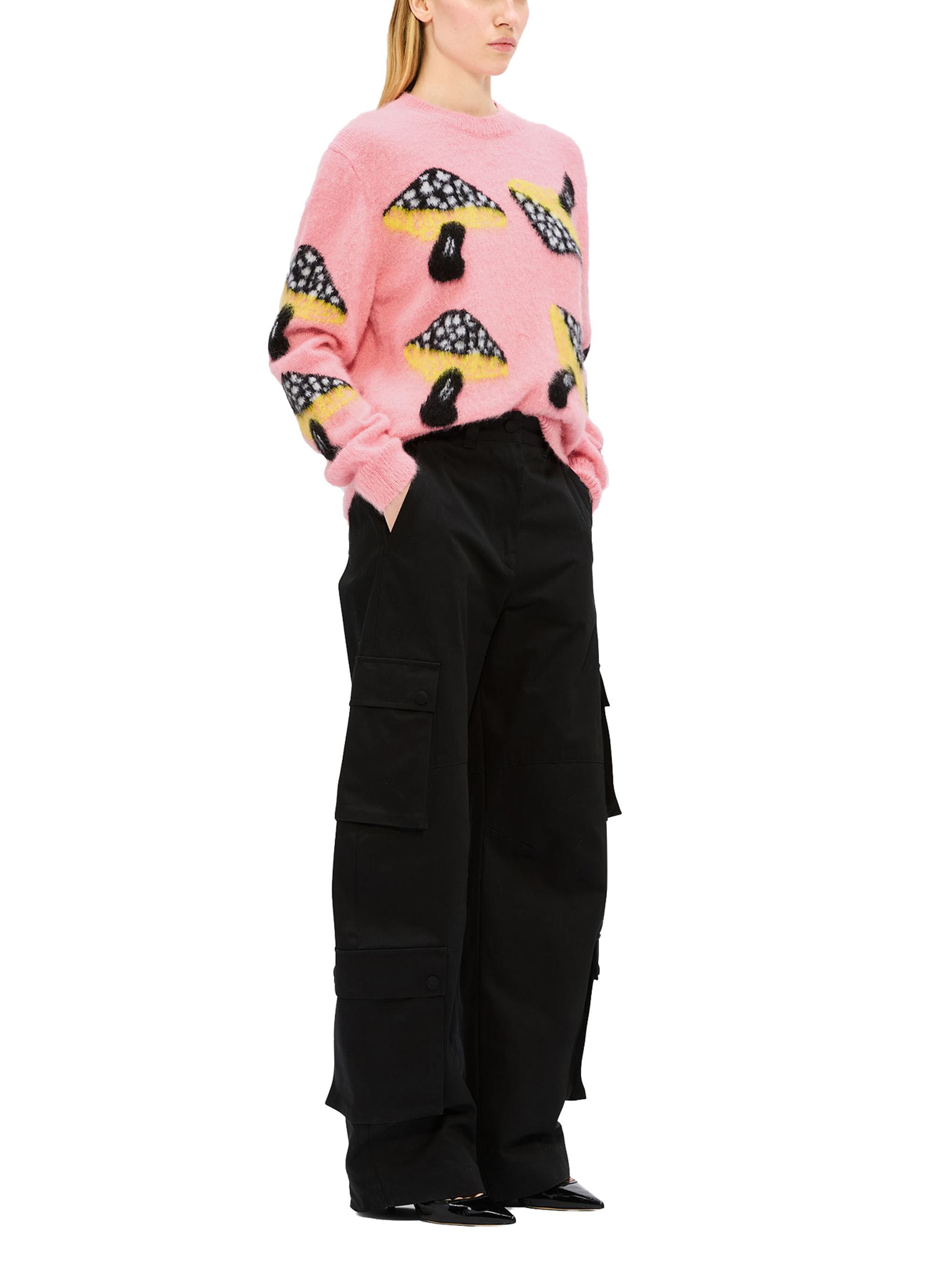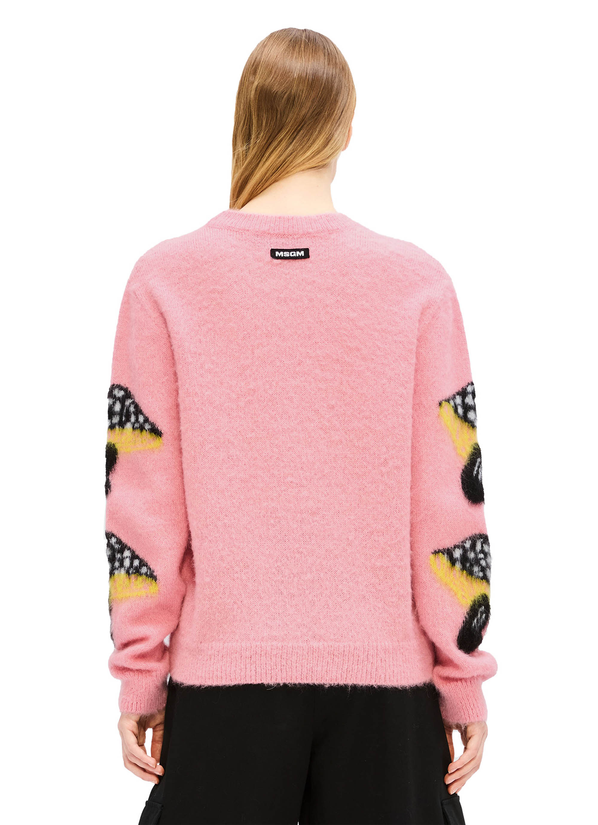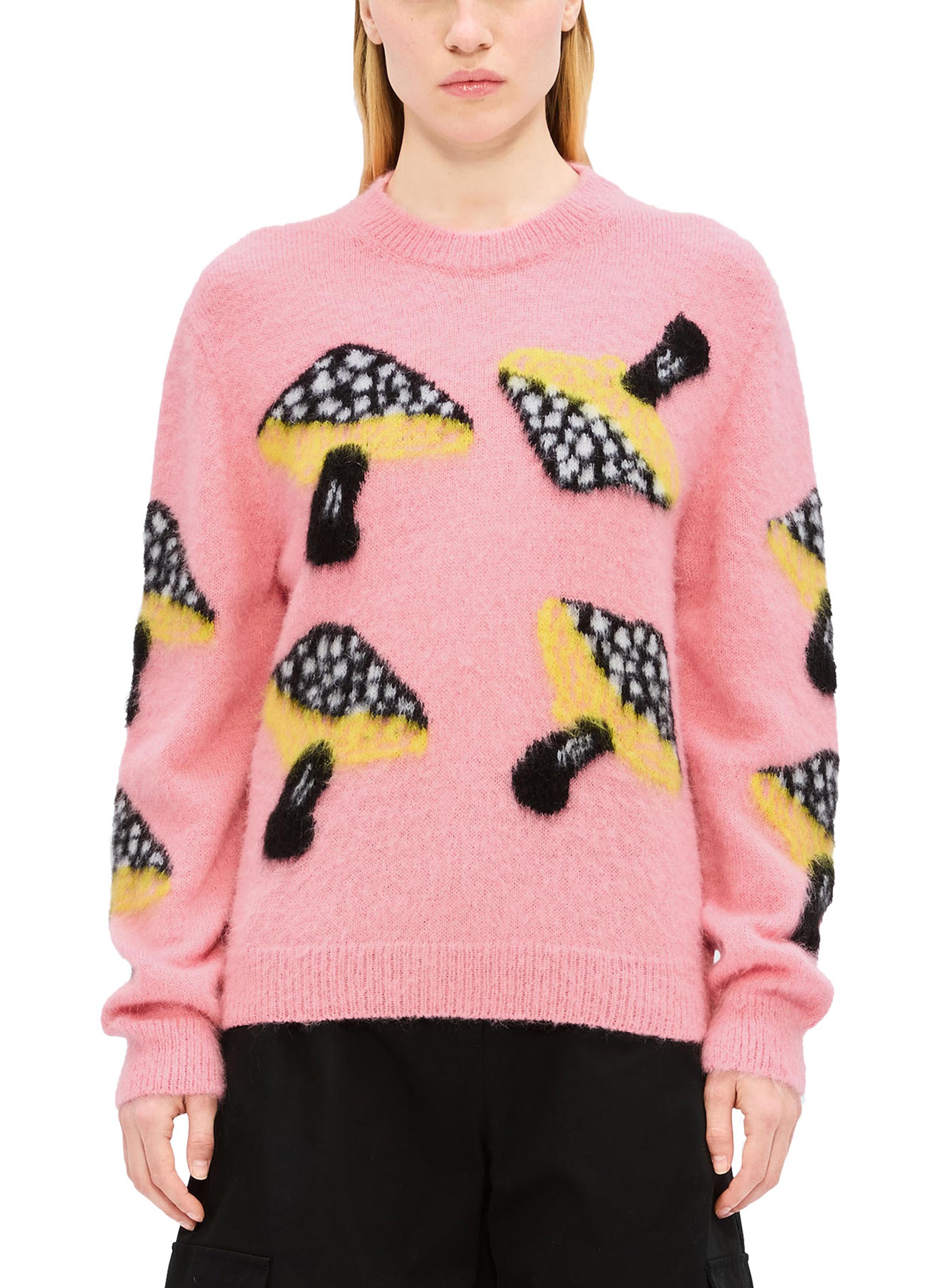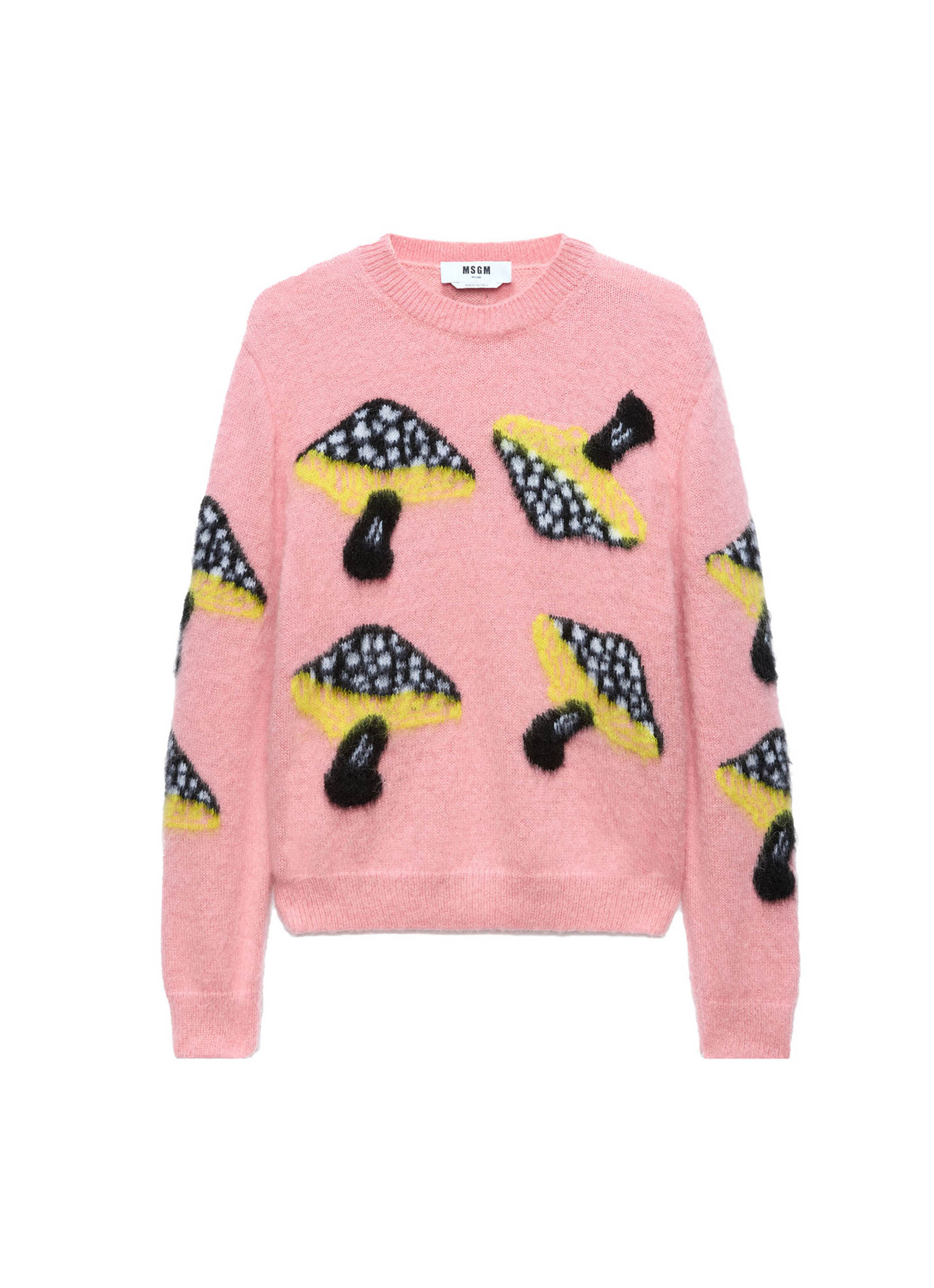 柔らかなピンクにポップなマッシュルーム柄が映える、プレイフルなマルチジャガードニットセーター。