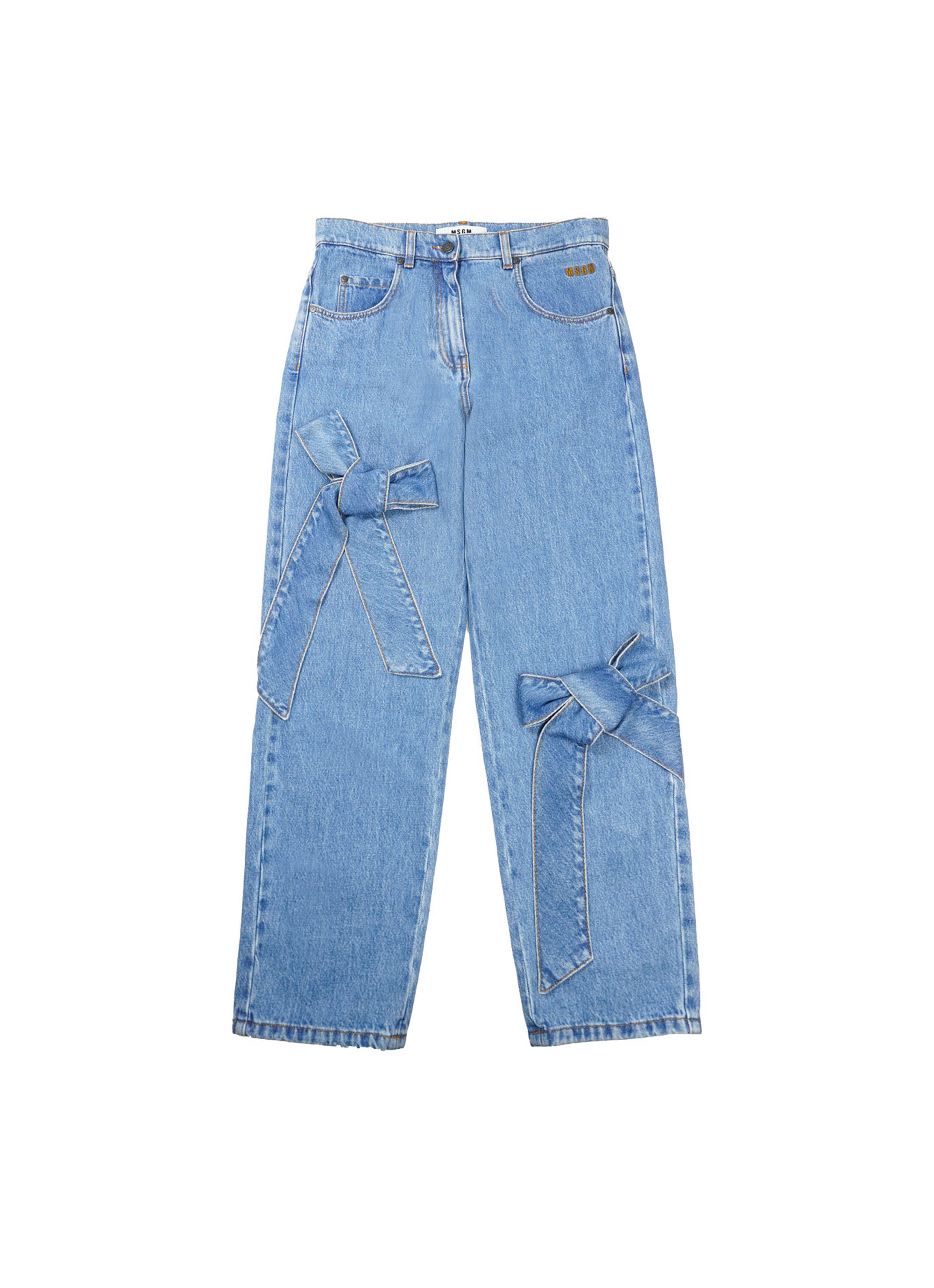 フロントにあしらわれたアシンメトリーなリボンが印象的な、遊び心と品の良さが共存するデニムパンツ。