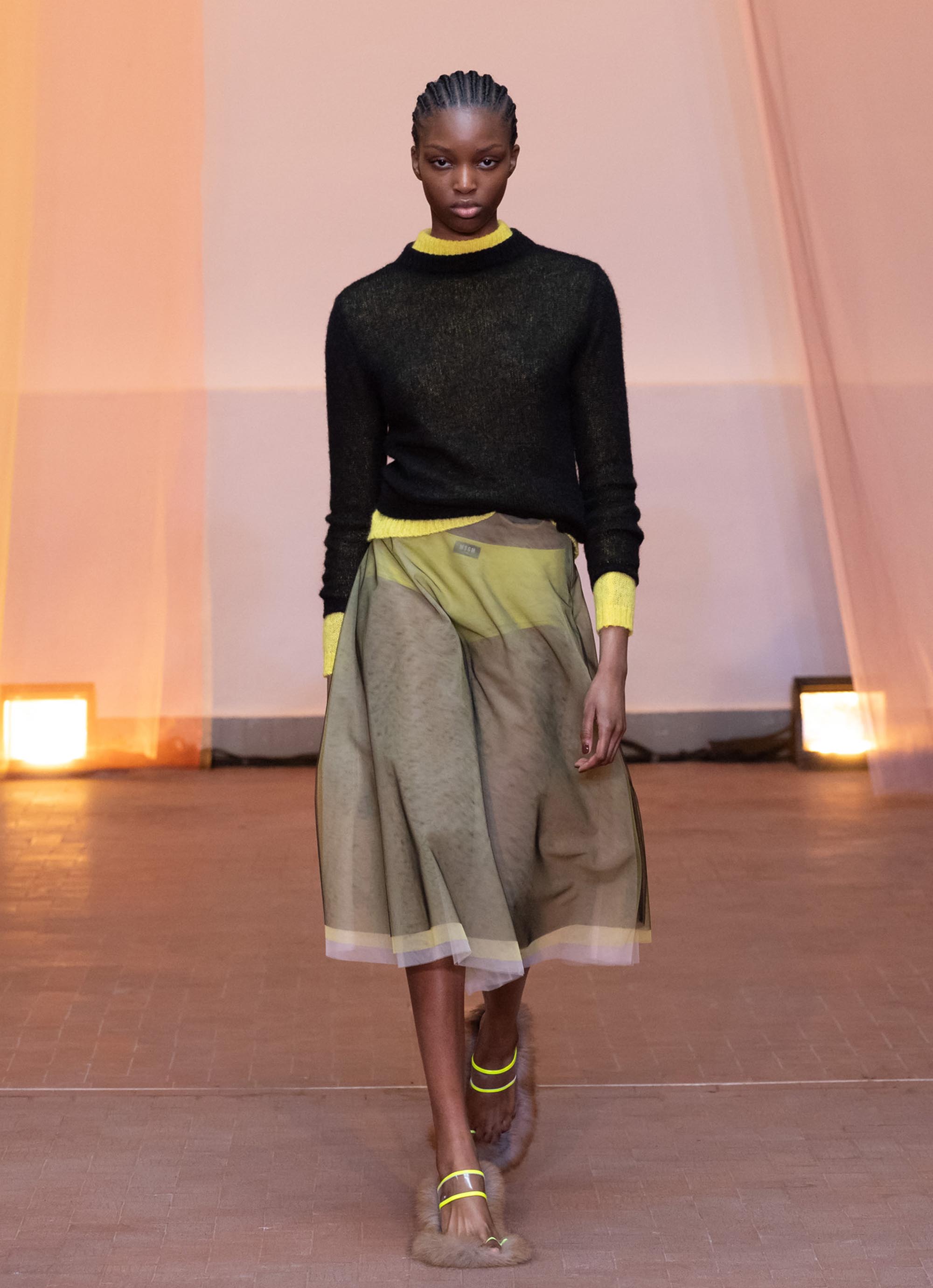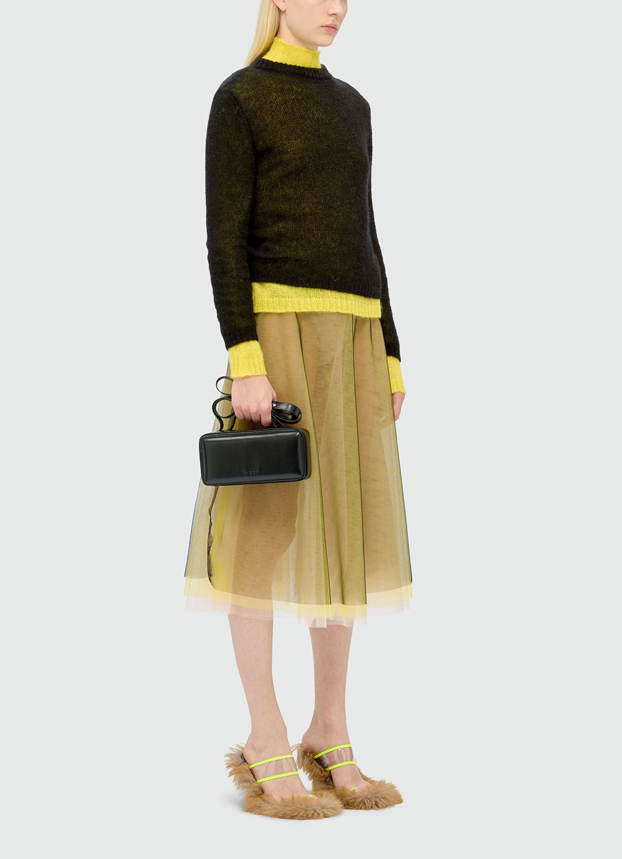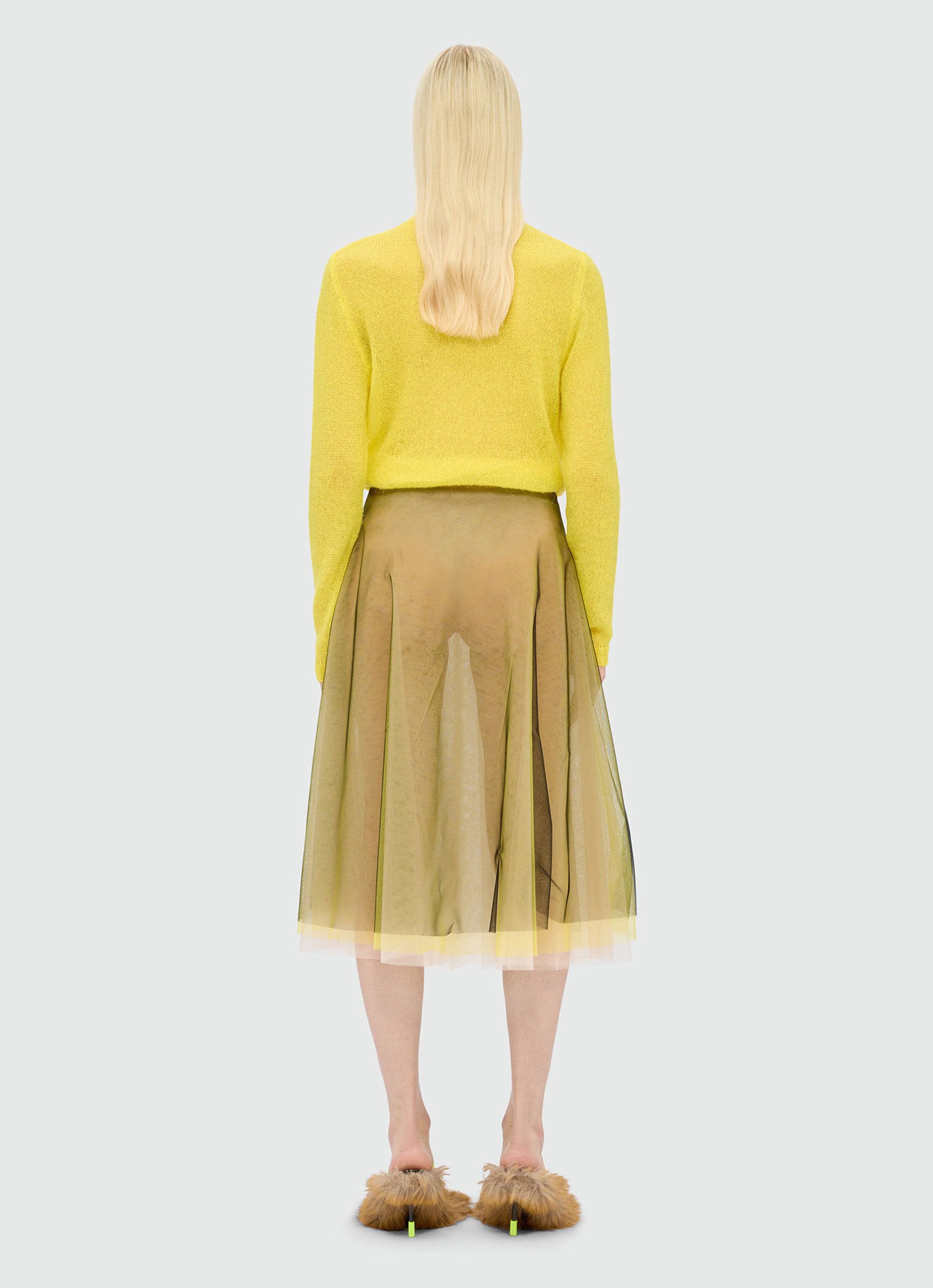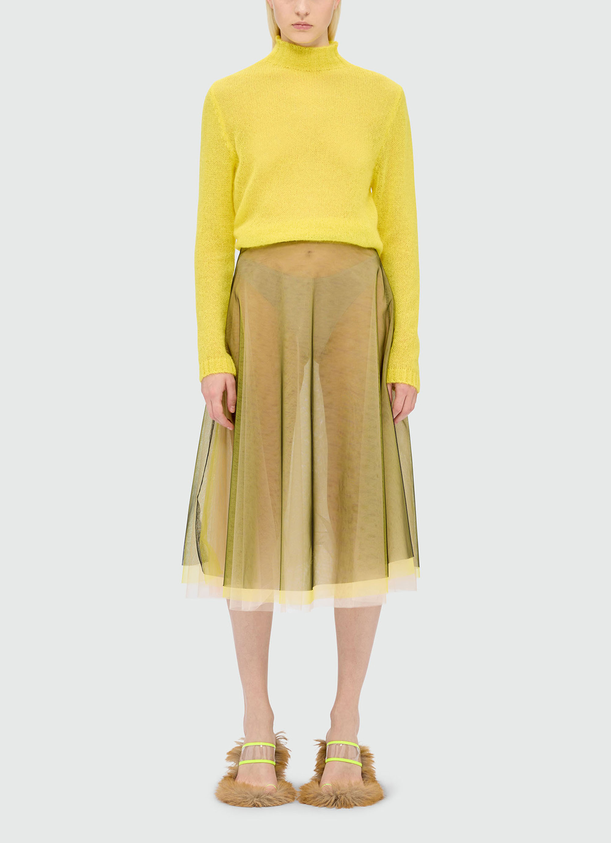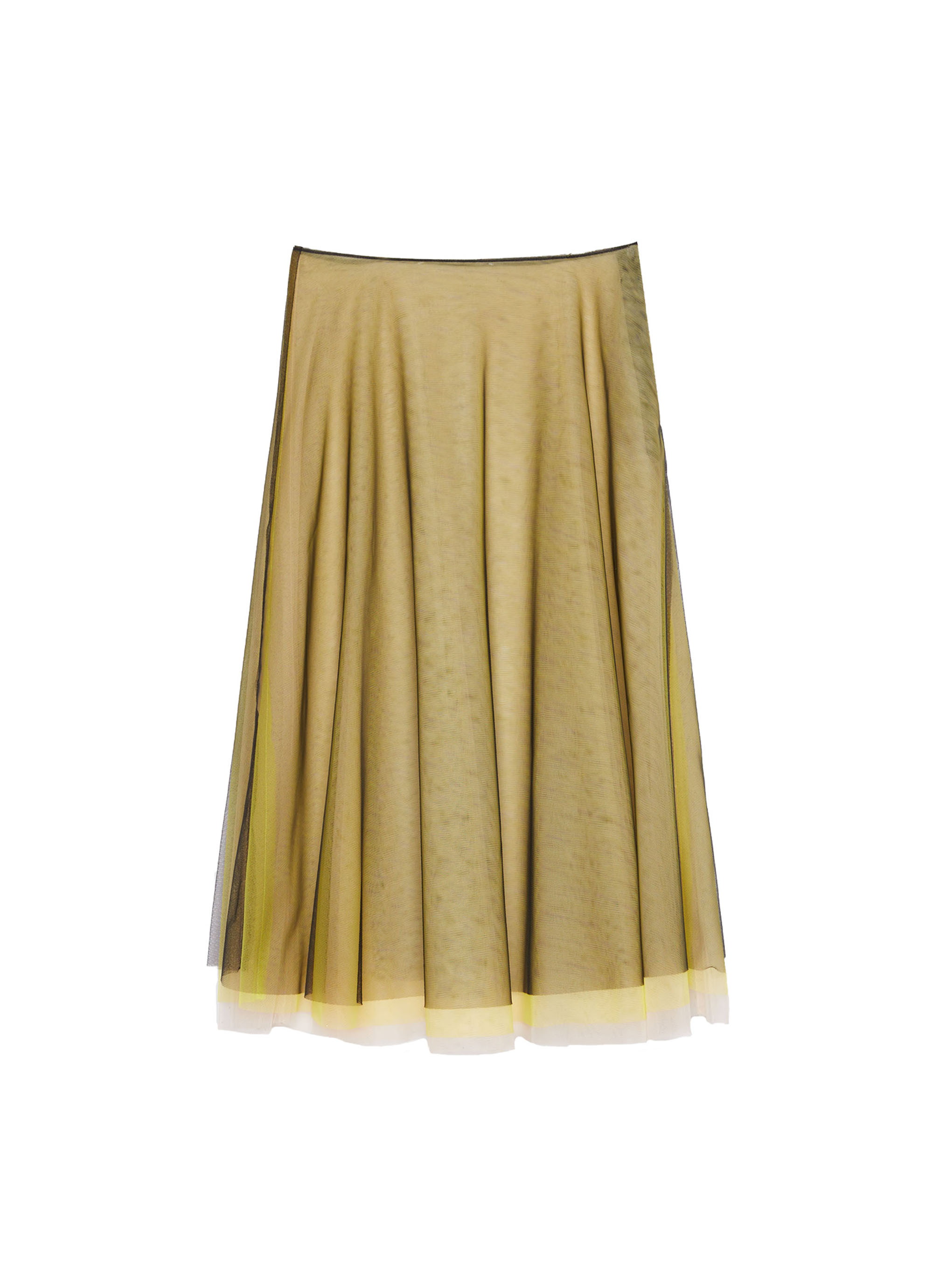 軽やかなチュールに、コントラストカラーのレイヤードが映えるミディ丈スカート。
