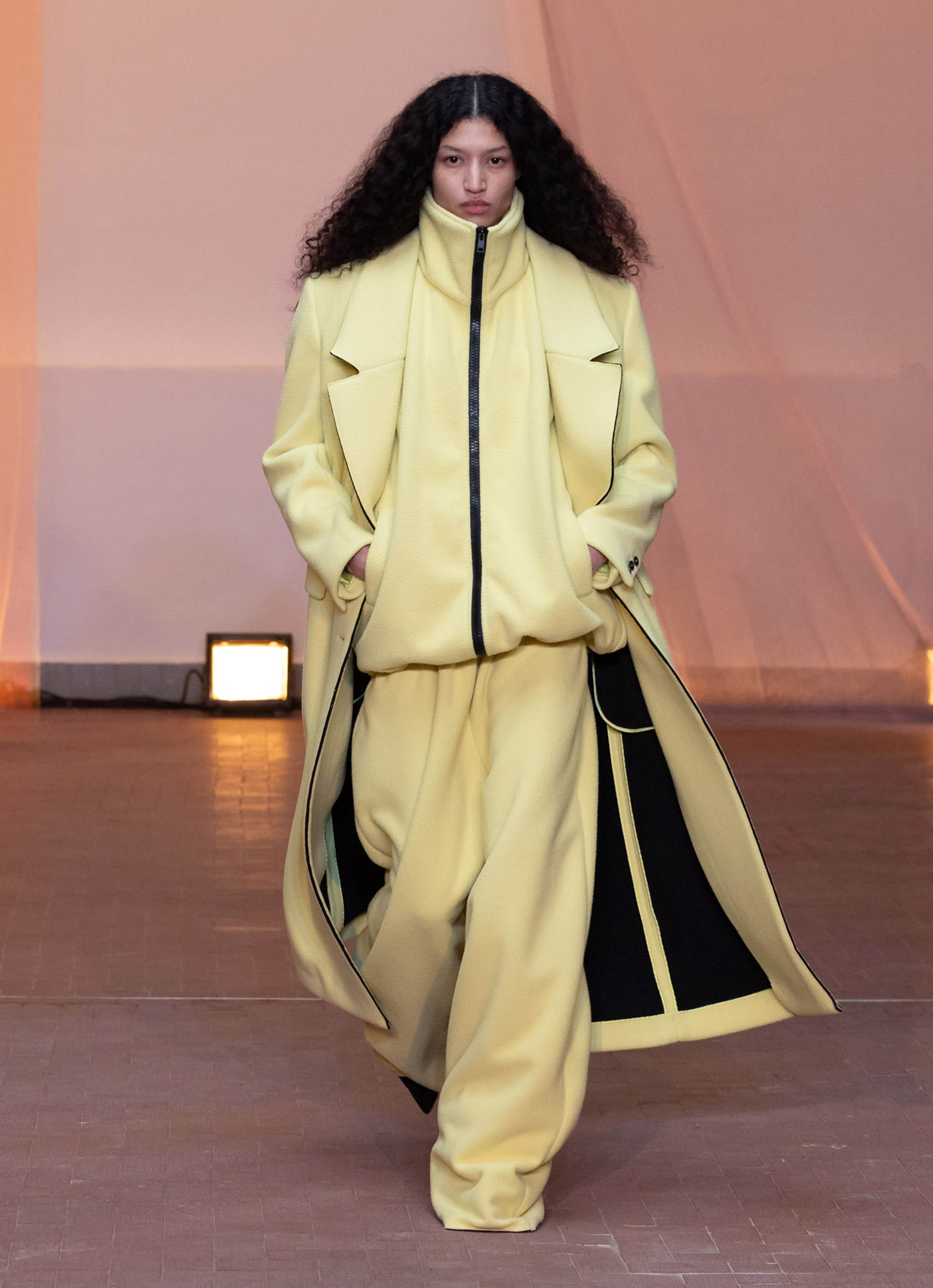 フロントジップとサイドポケットを備え、裾のドローストリングでシルエットの調整も可能。