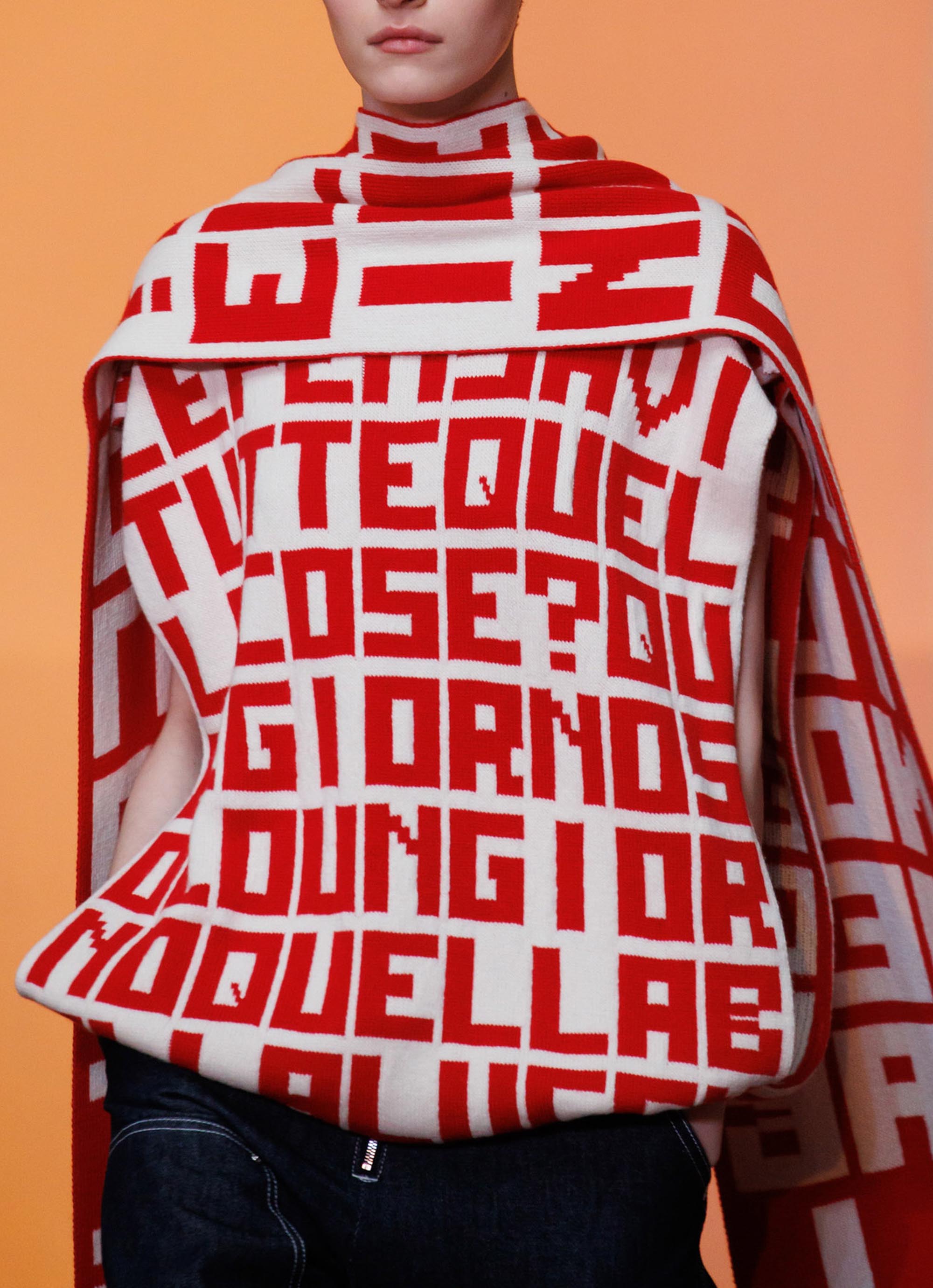 ウール・アクリルブレンドのニット素材に、詩的なメッセージをジャガードで大胆に表現。