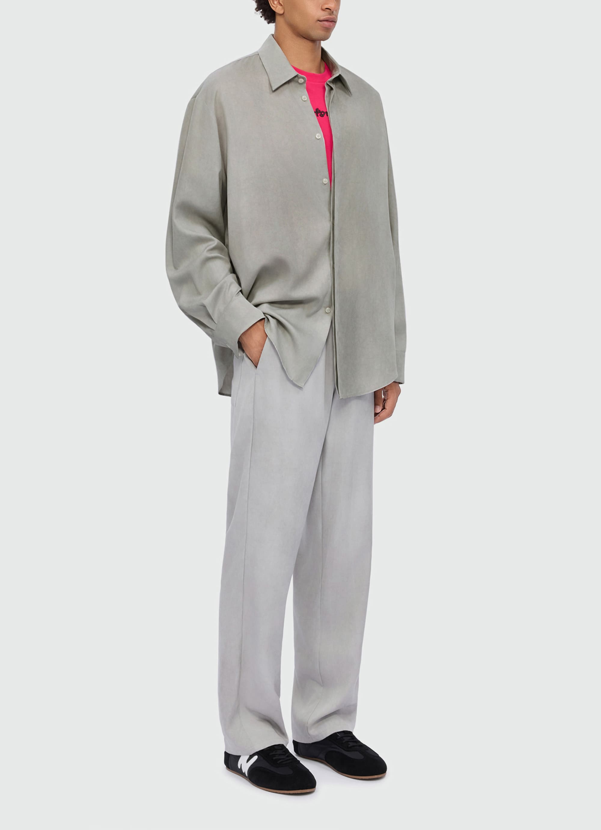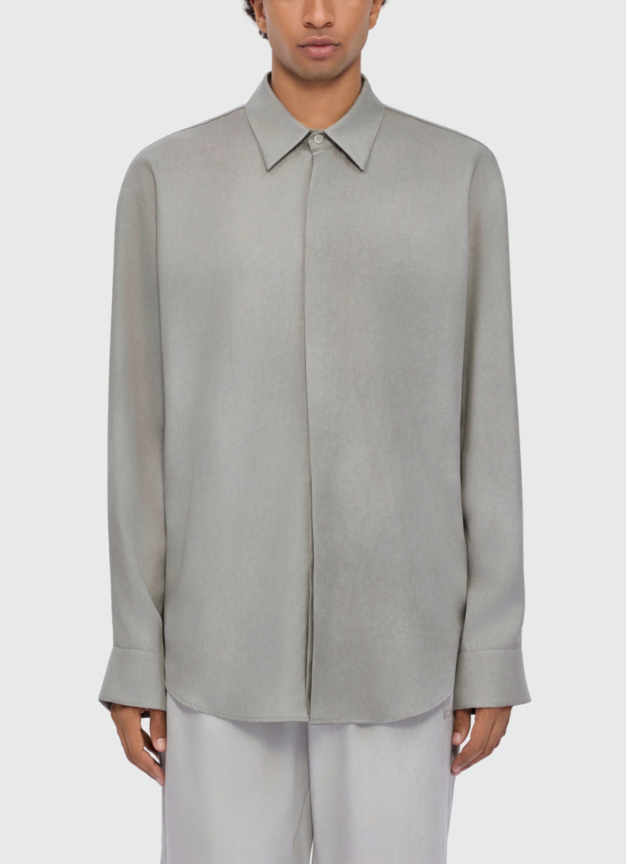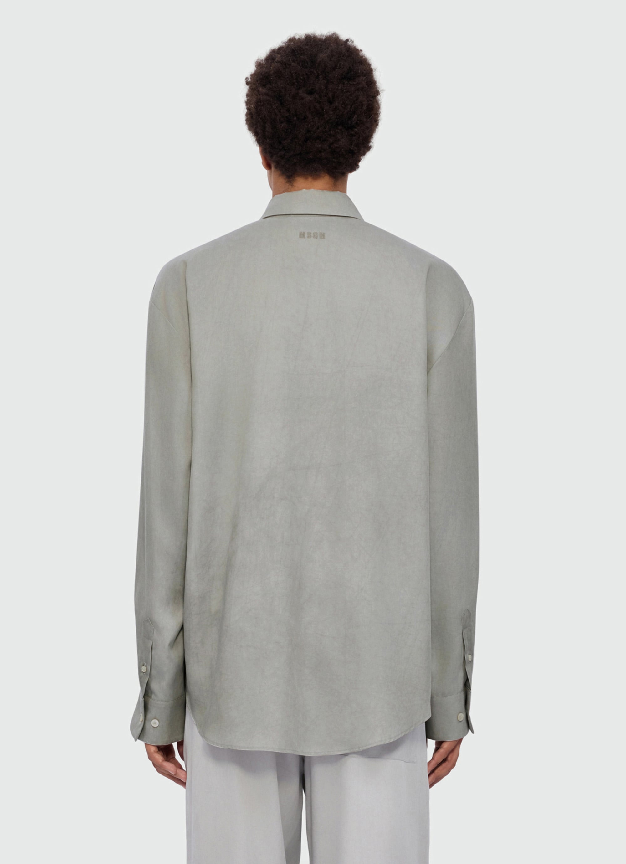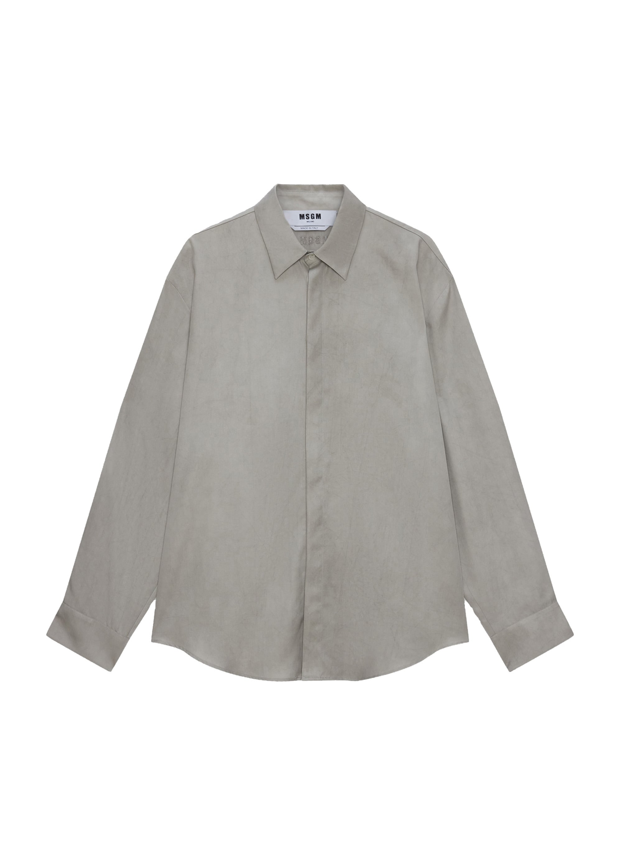 アイスグレーの柔らかなトーンと繊細なグラデーションが、静かな存在感を放つ。リラックスした肩線と美しいドレープが、ミニマルな表情に上品な抜け感を添え、MSGMらしい夏のモード感を演出。