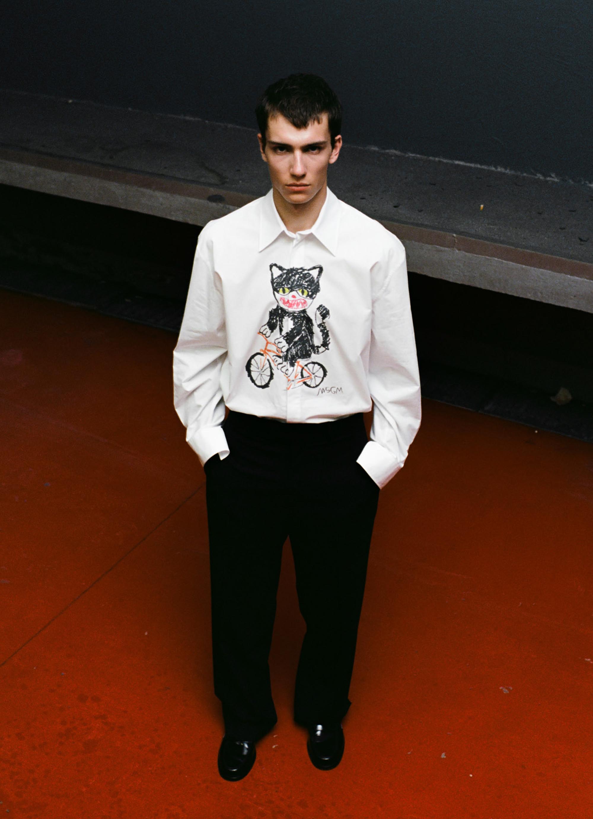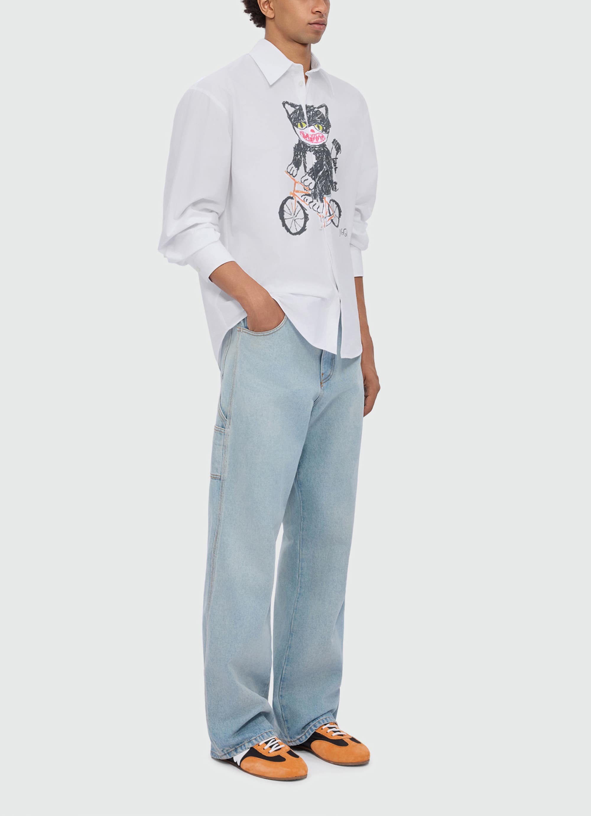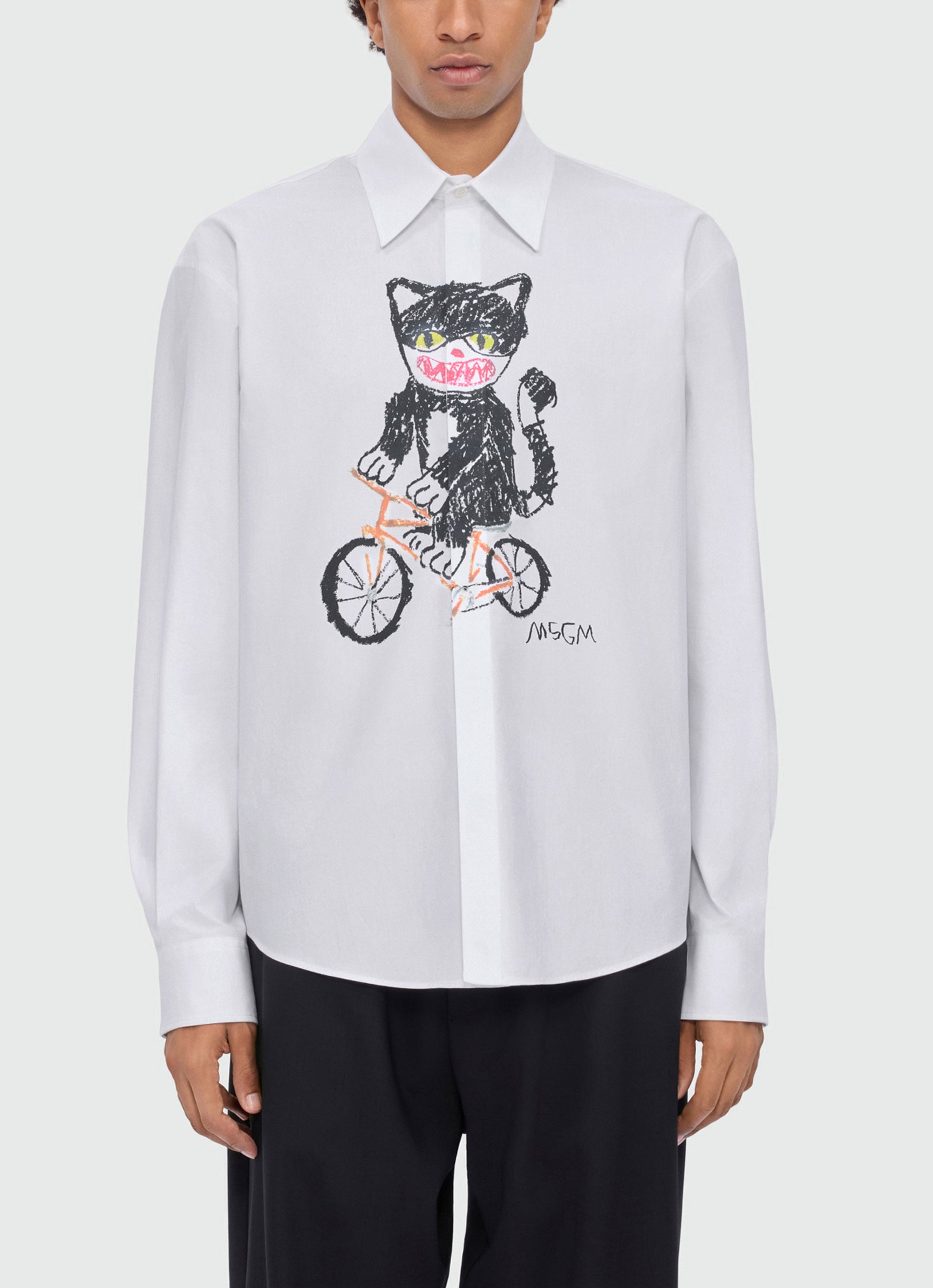 Bike Lifeの自由なムードから着想を得た、遊び心あふれるグラフィックシャツ。コットンポプリンのクリーンな生地に、落書きタッチの“自転車に乗る猫”を大胆にプリント。
