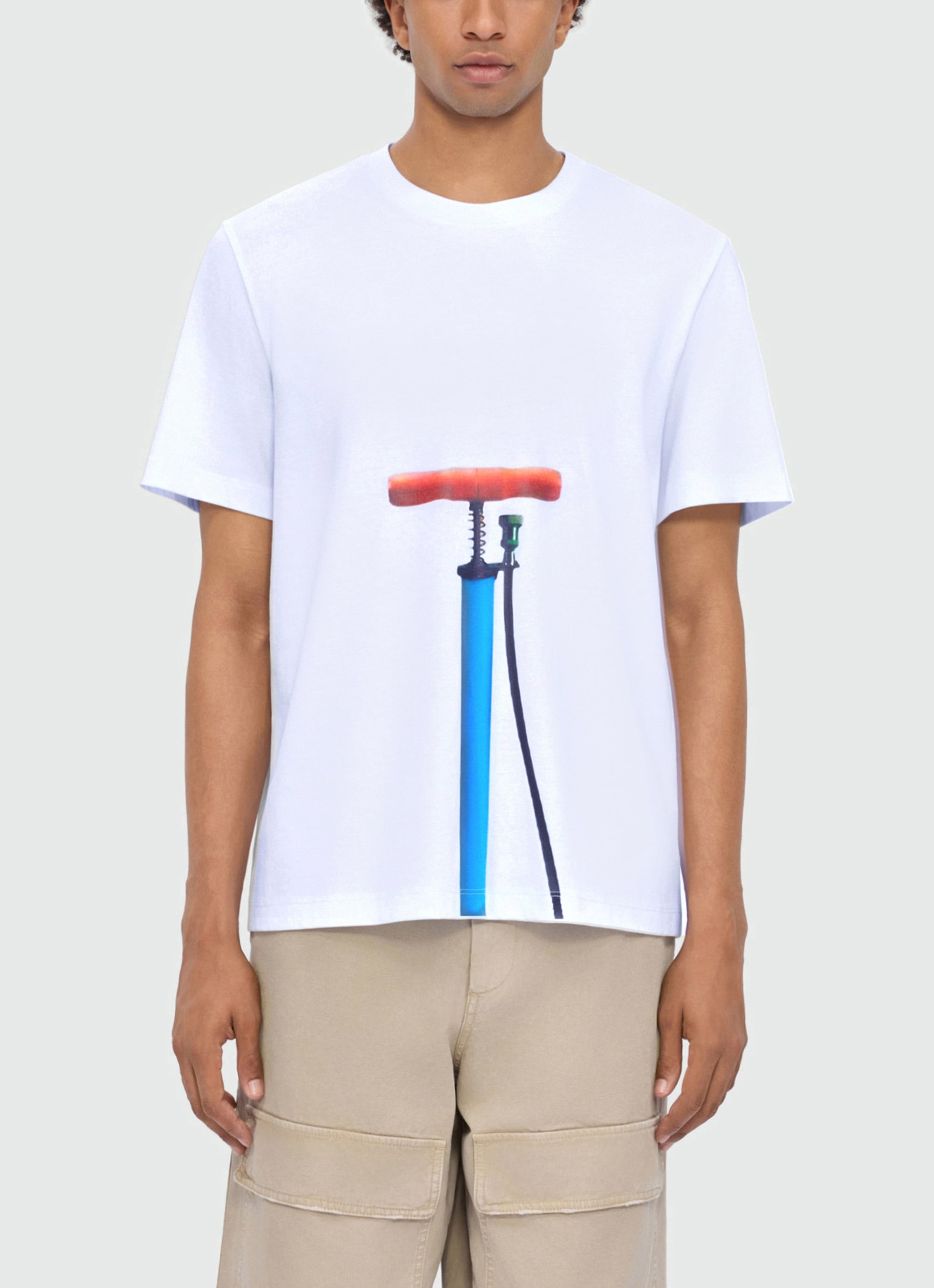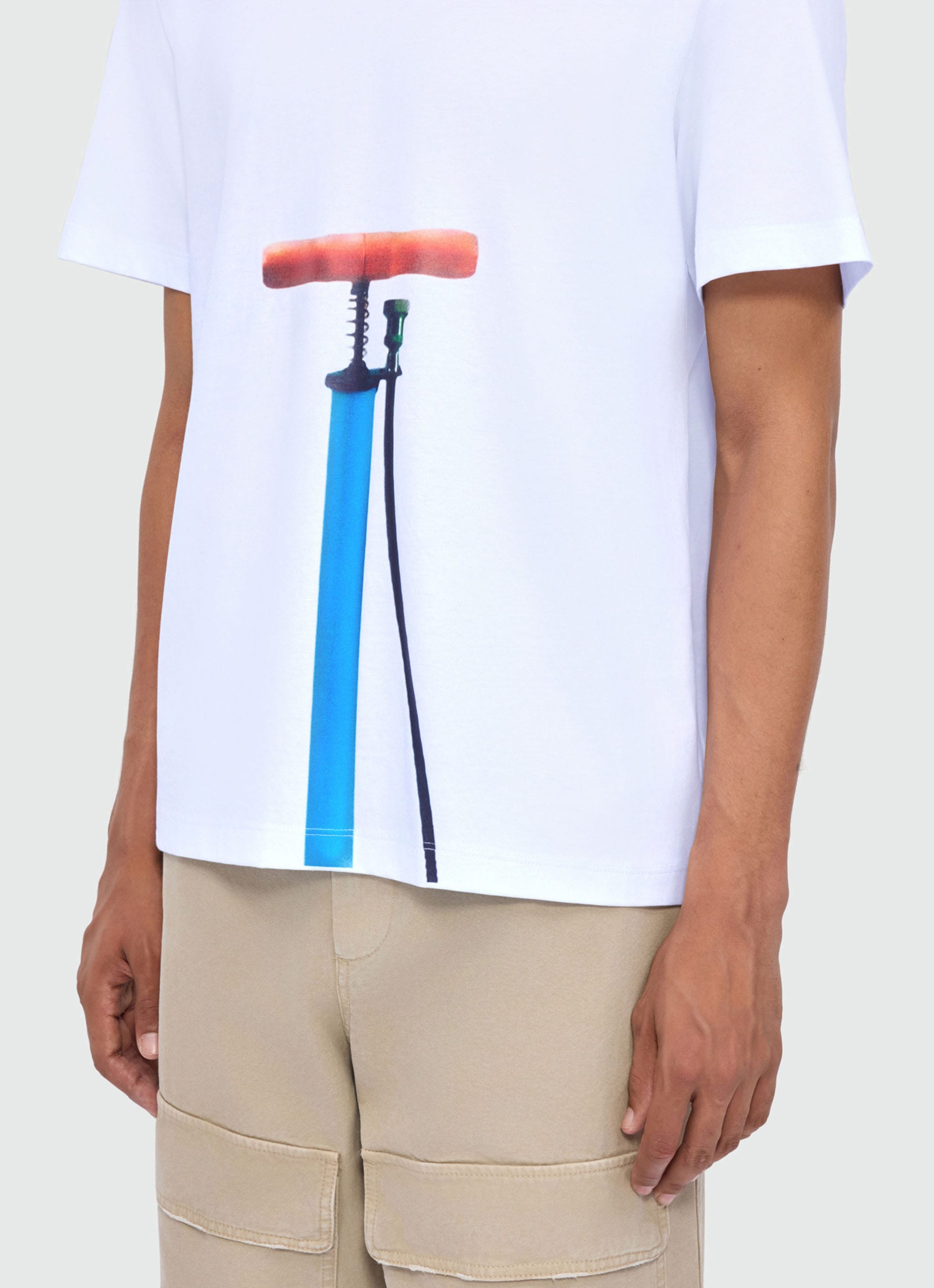 自転車の空気入れ(FLOOR PUMP)をモチーフにしたユニークなプリントが目を引くTシャツ。