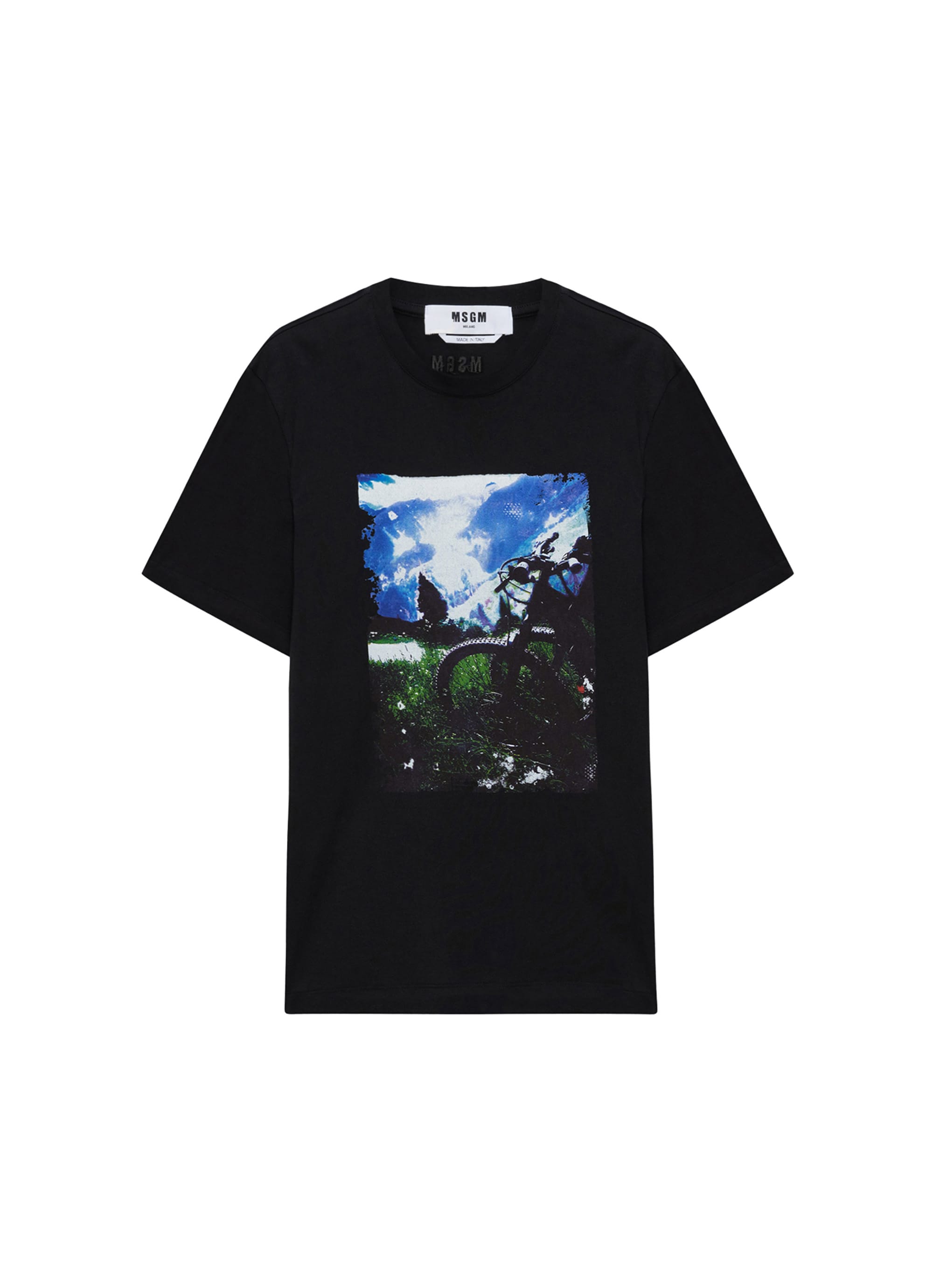 青と緑が溶け込む自然の風景と、バイクが刻むスピードの軌跡。その一瞬を切り取ったアートワークが、MSGMらしいコンテンポラリーなムードを漂わせるデザイン。