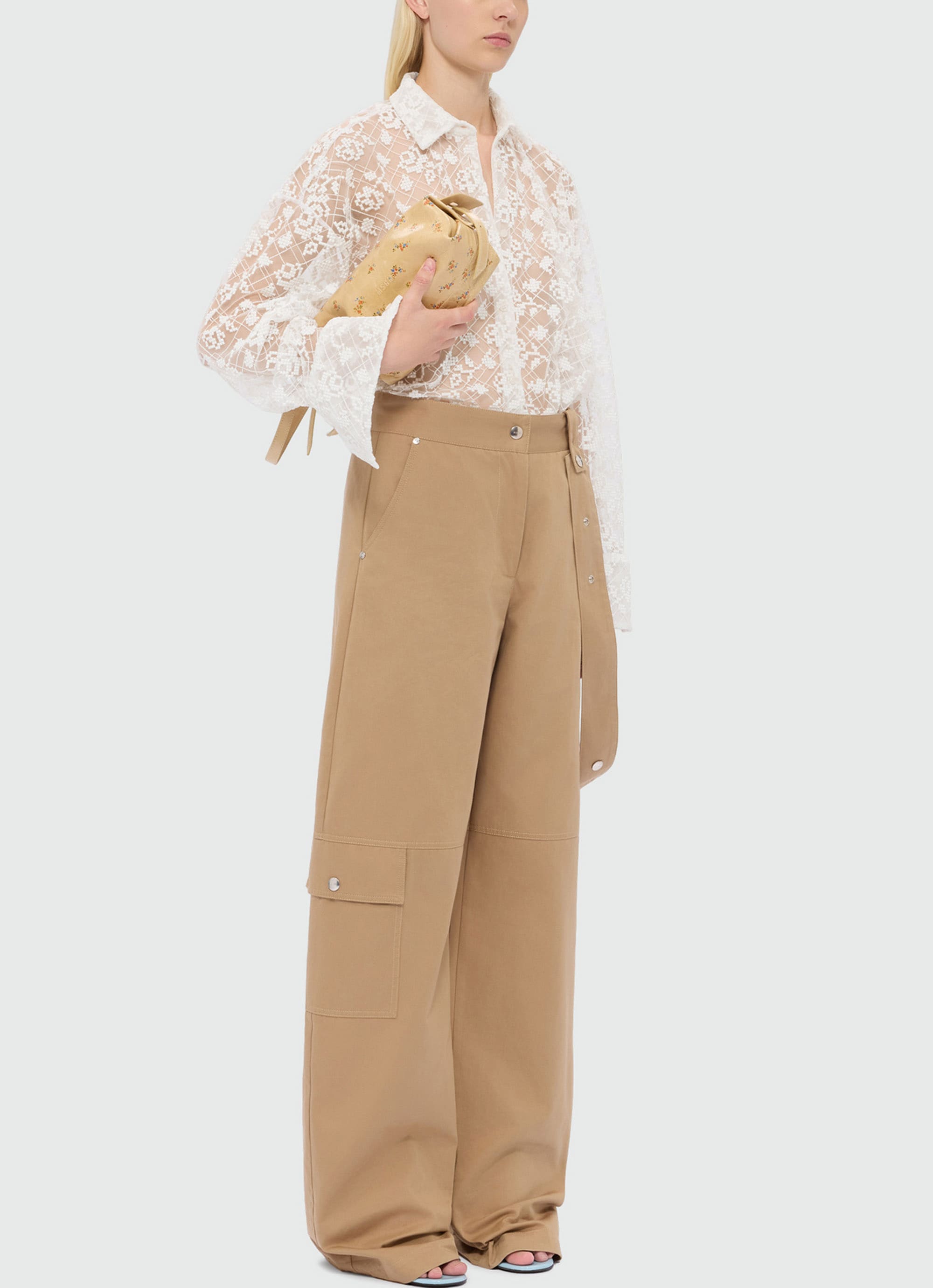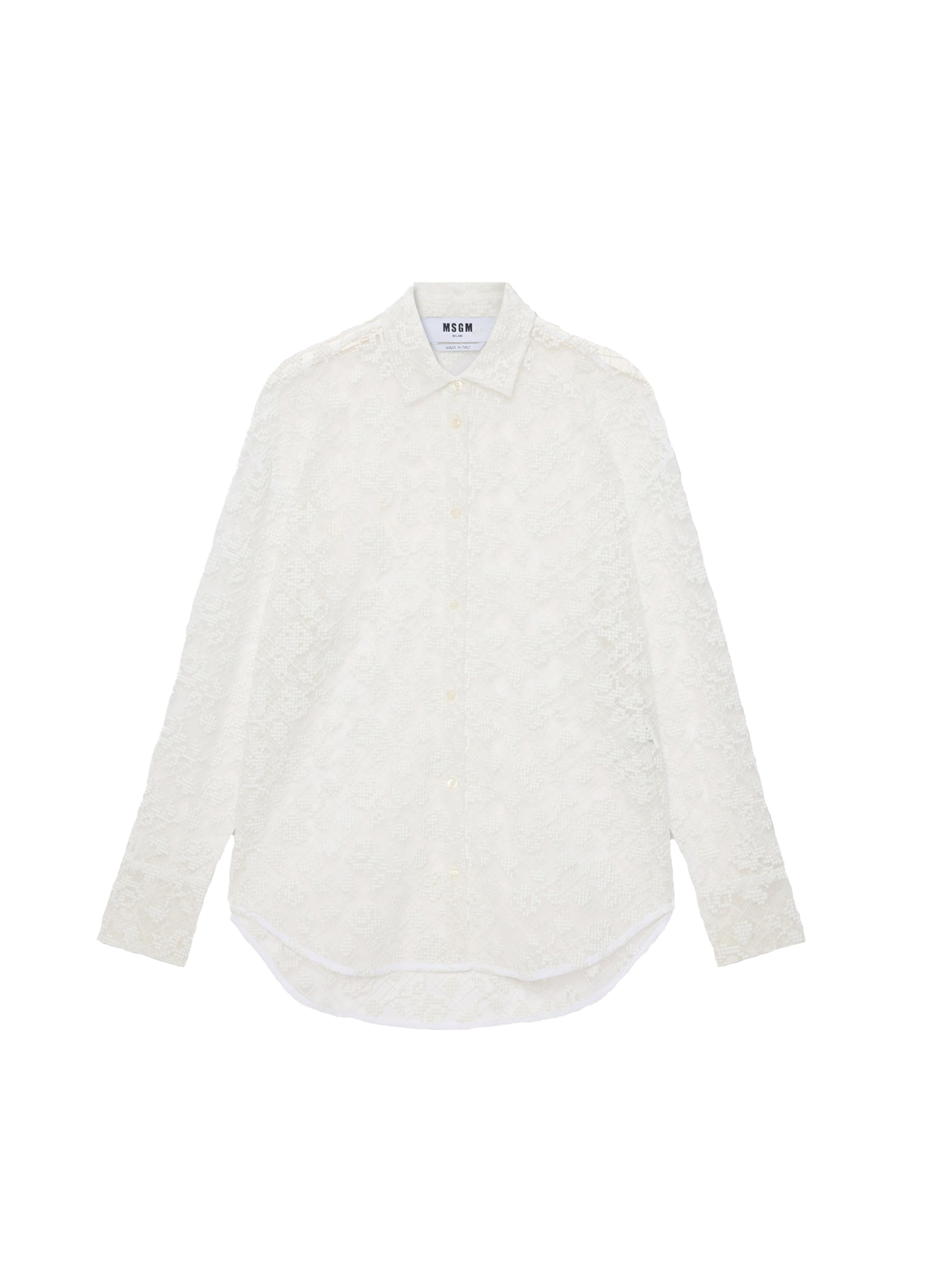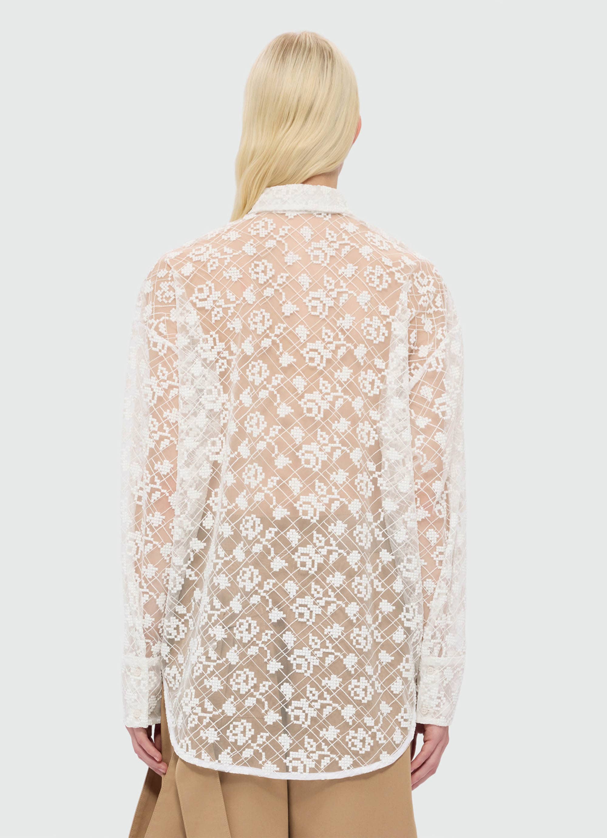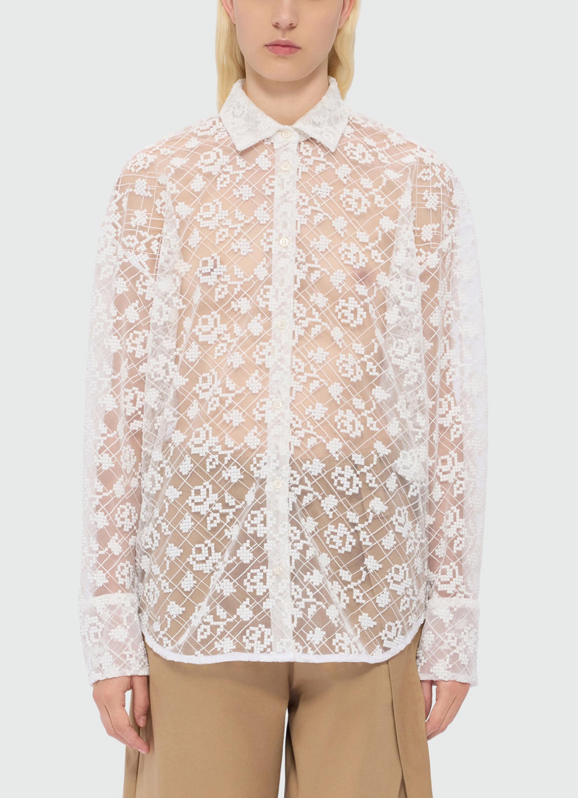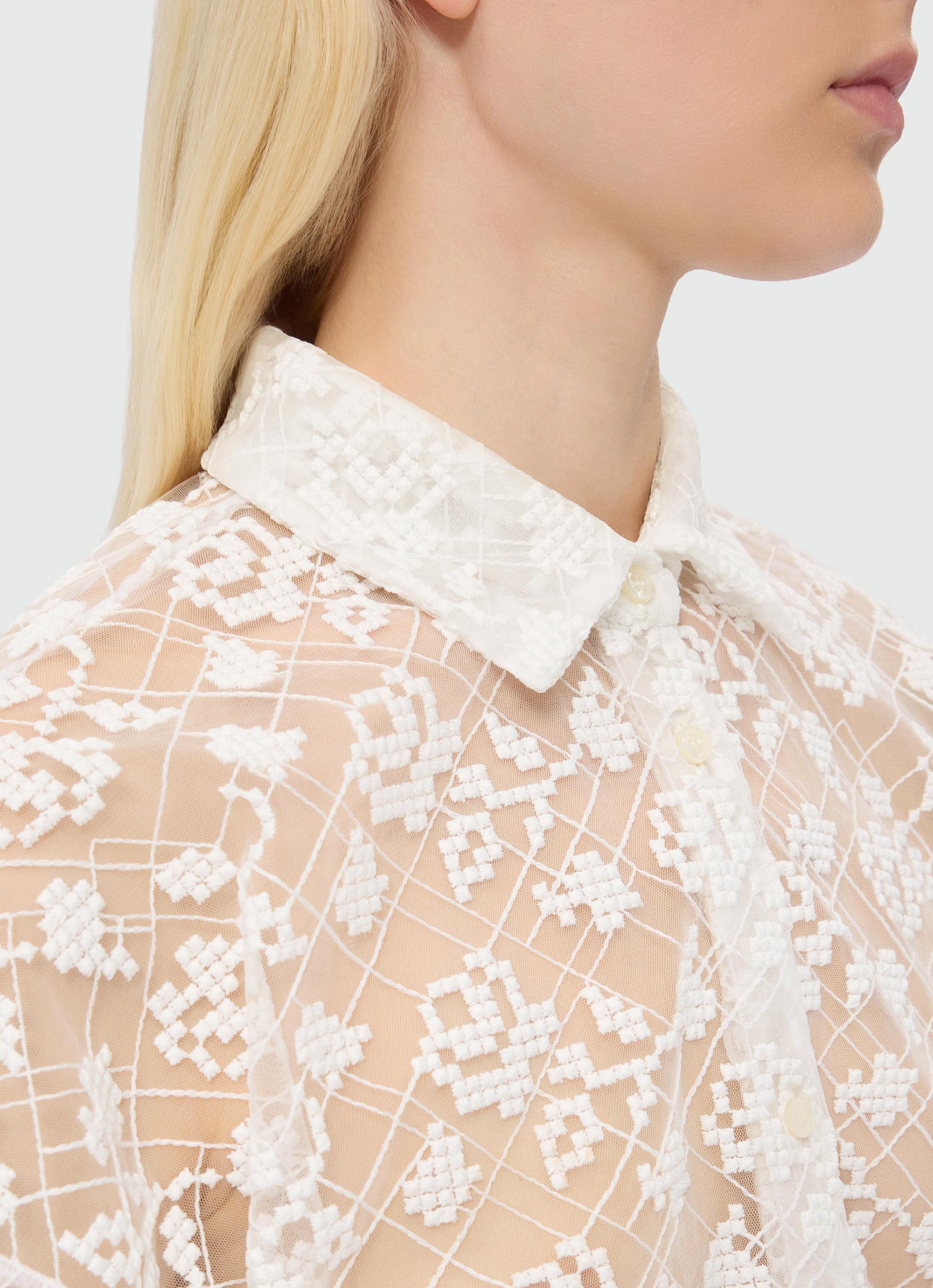 繊細なチュールに咲くローズ刺繍が、軽やかな透け感の中に陰影とコントラストを描くシャツ。
