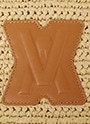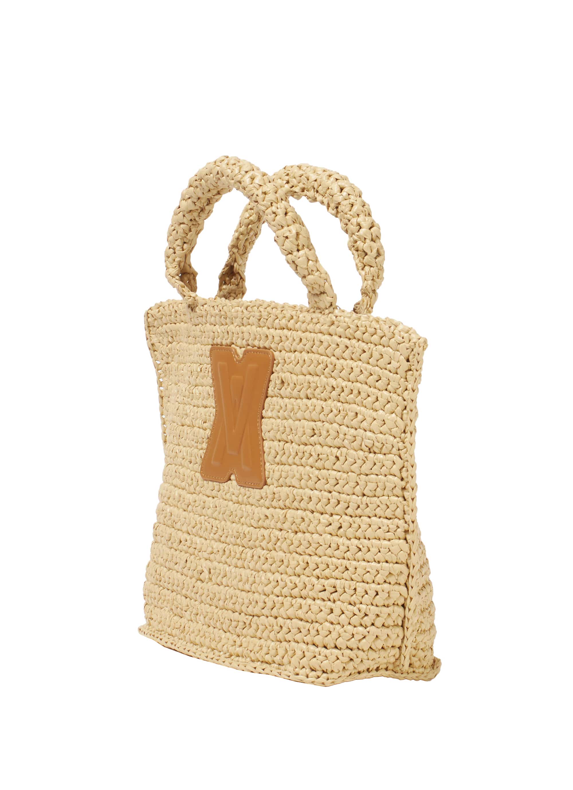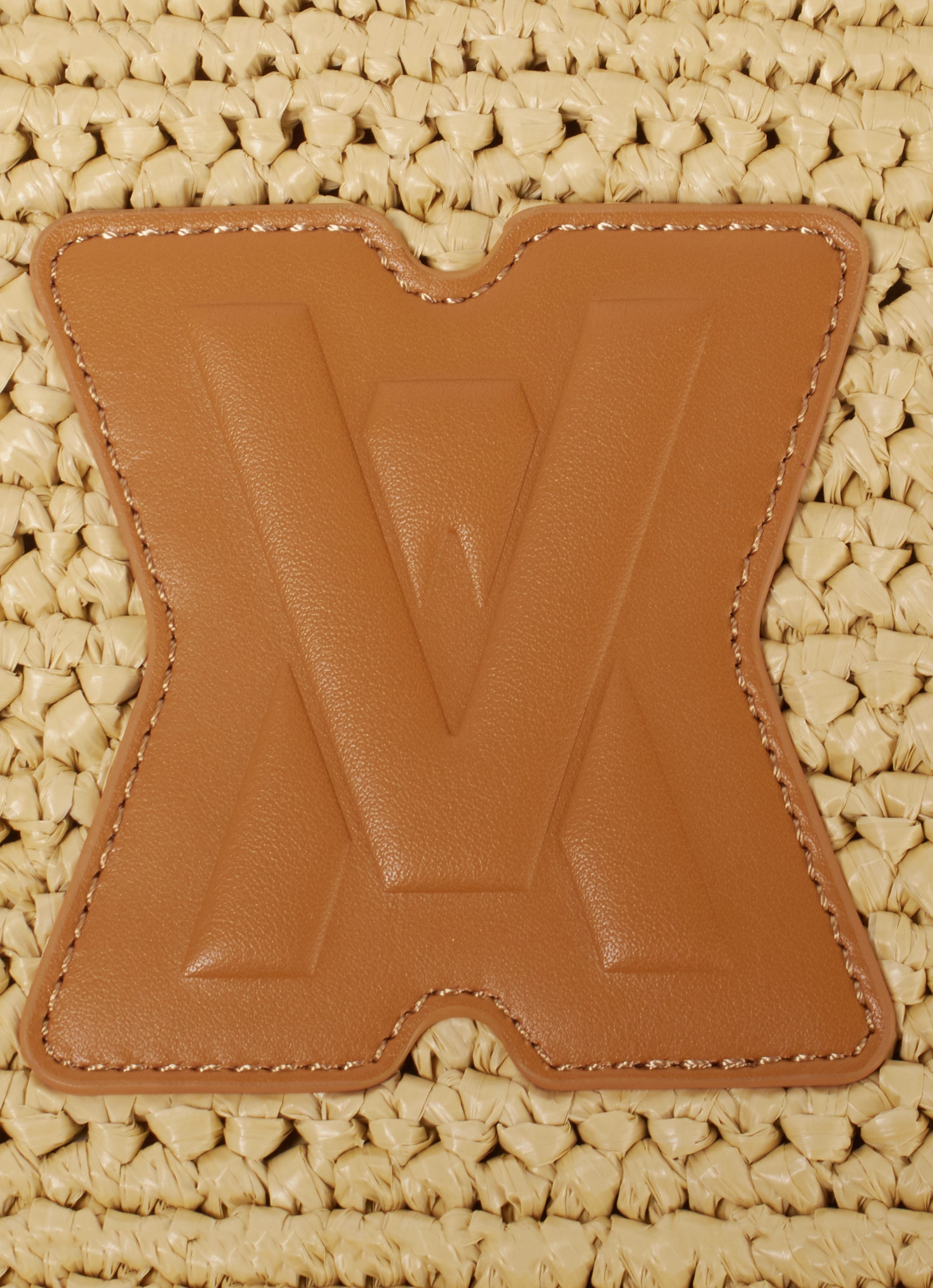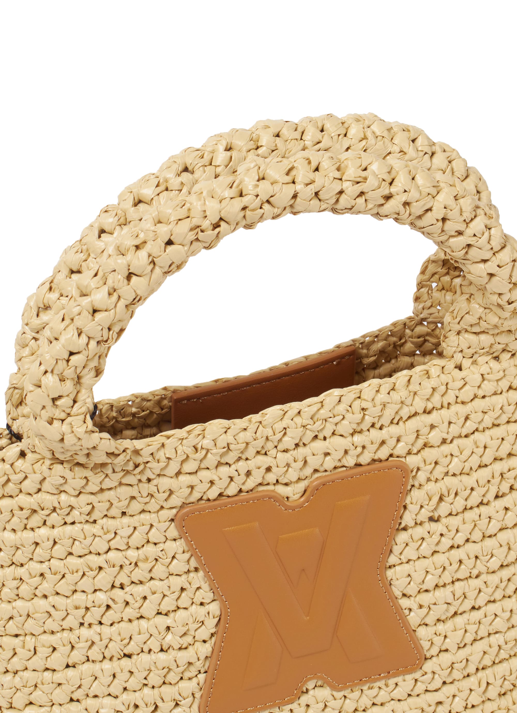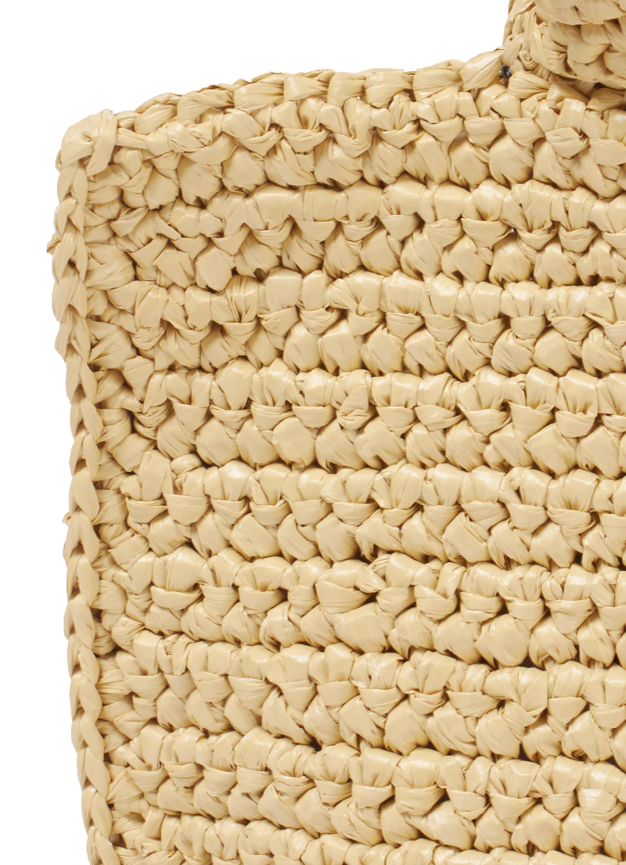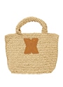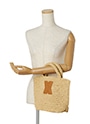 中心にブランドロゴが施されたラフィア風トートバッグ。