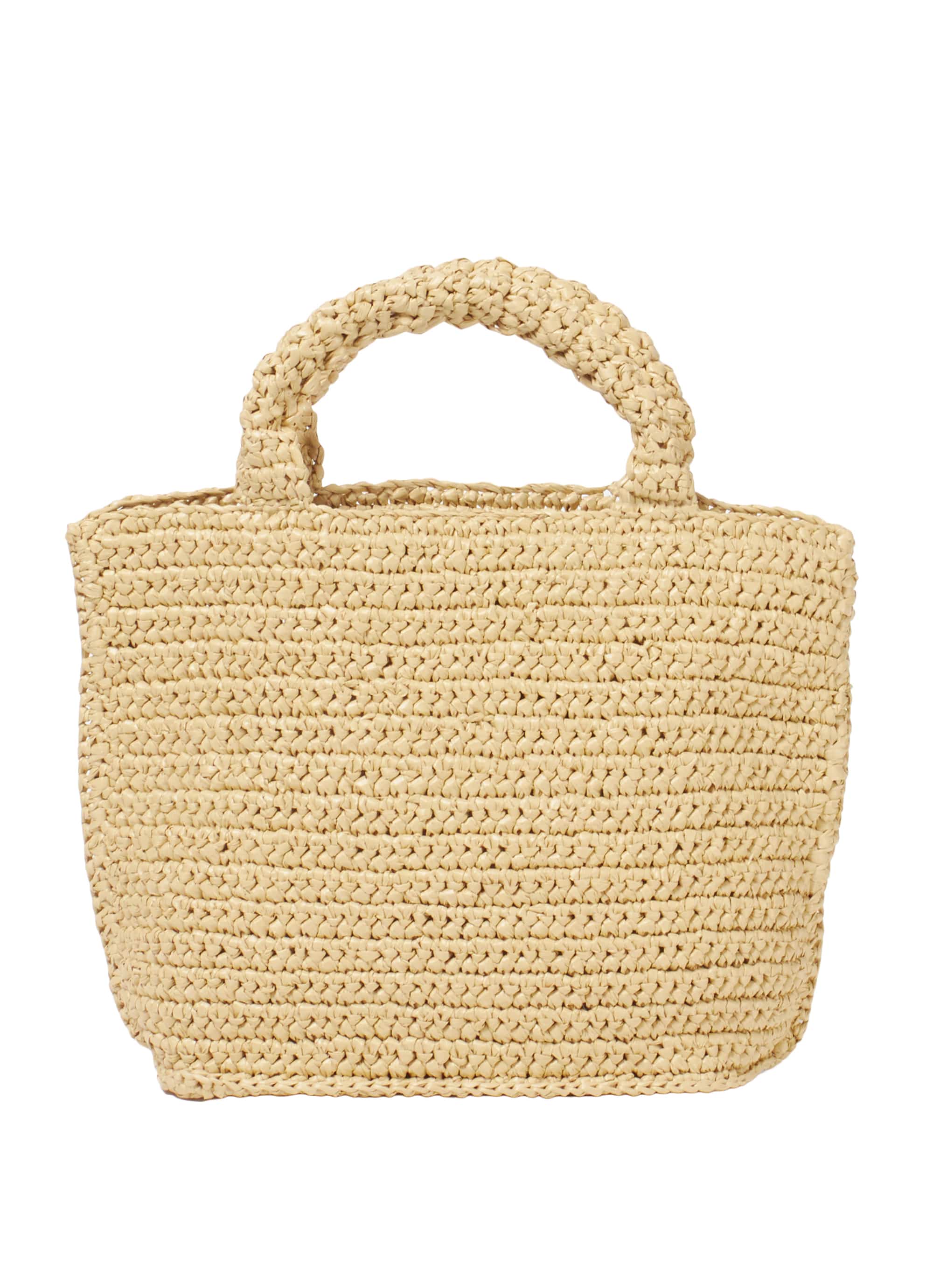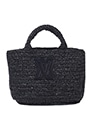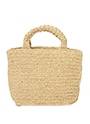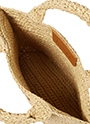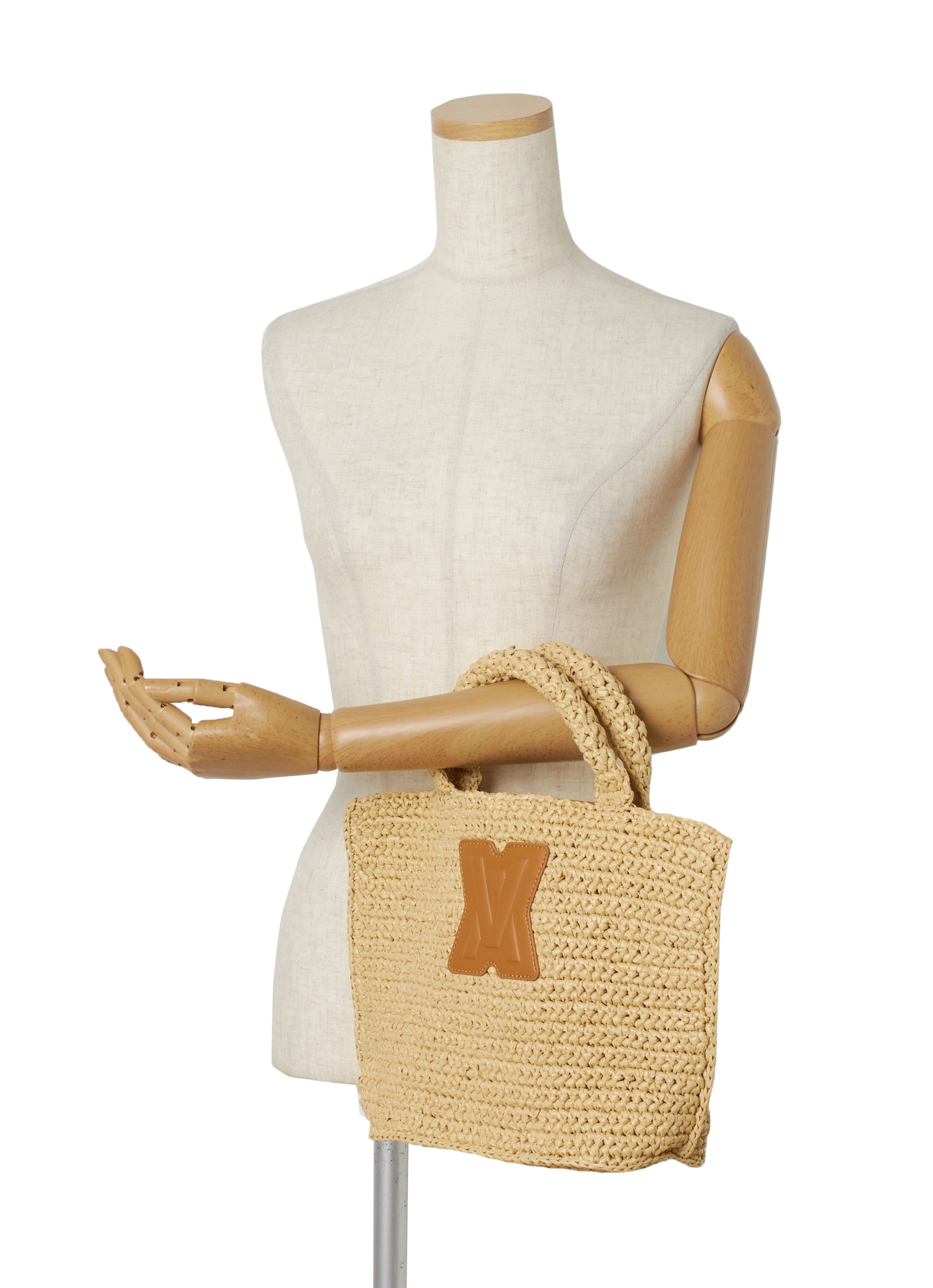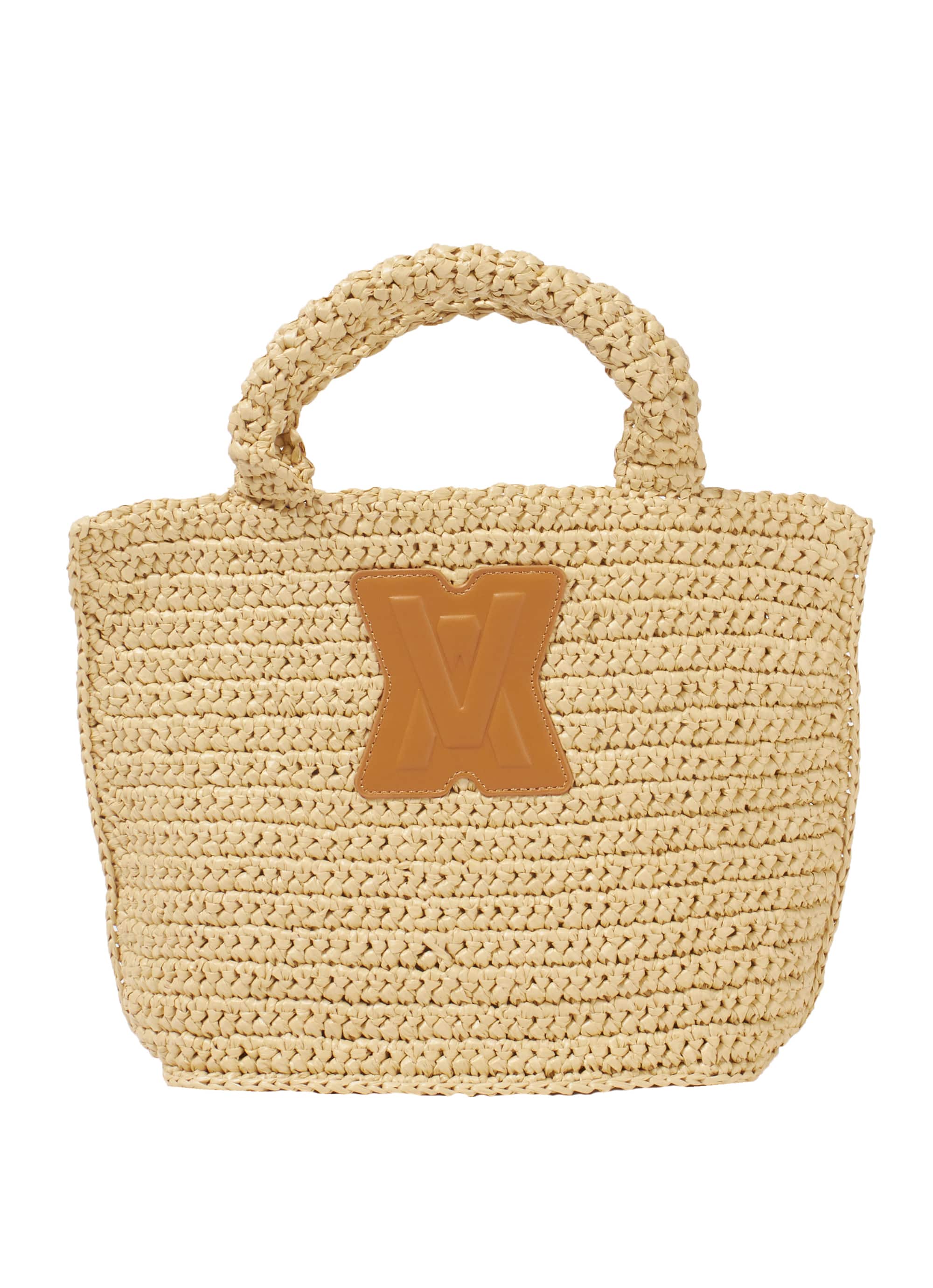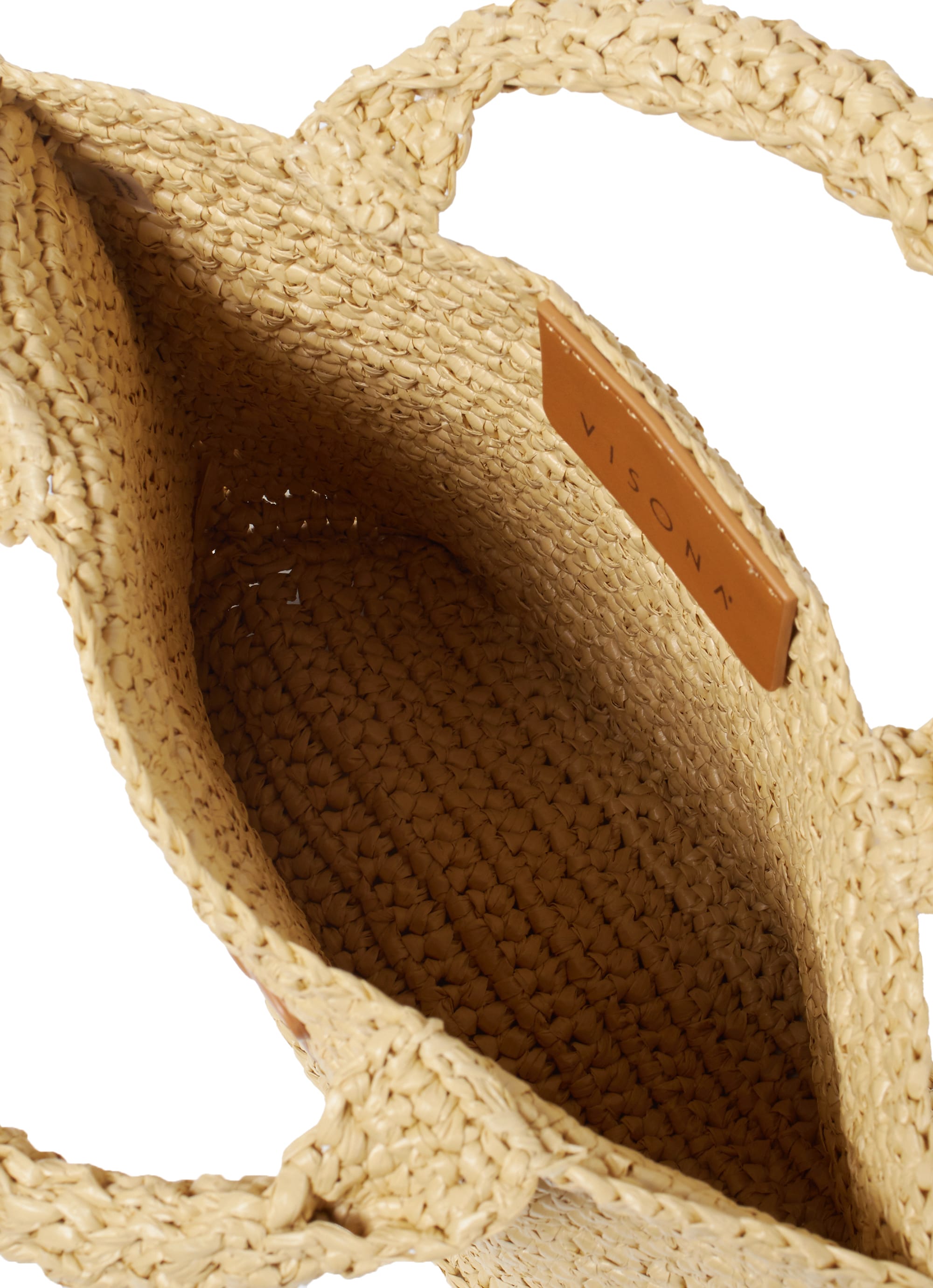 中心にブランドロゴが施されたラフィア風トートバッグ。