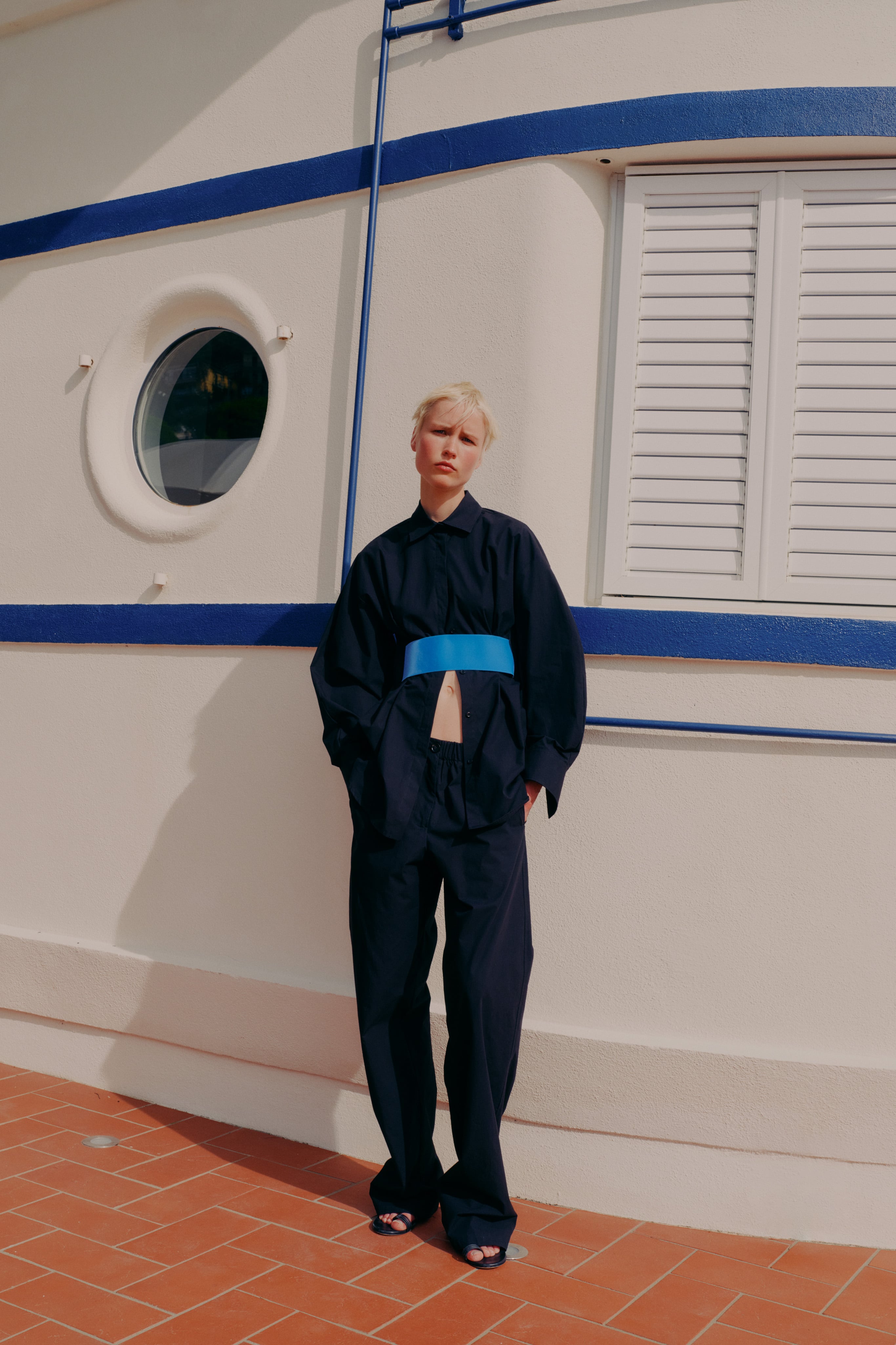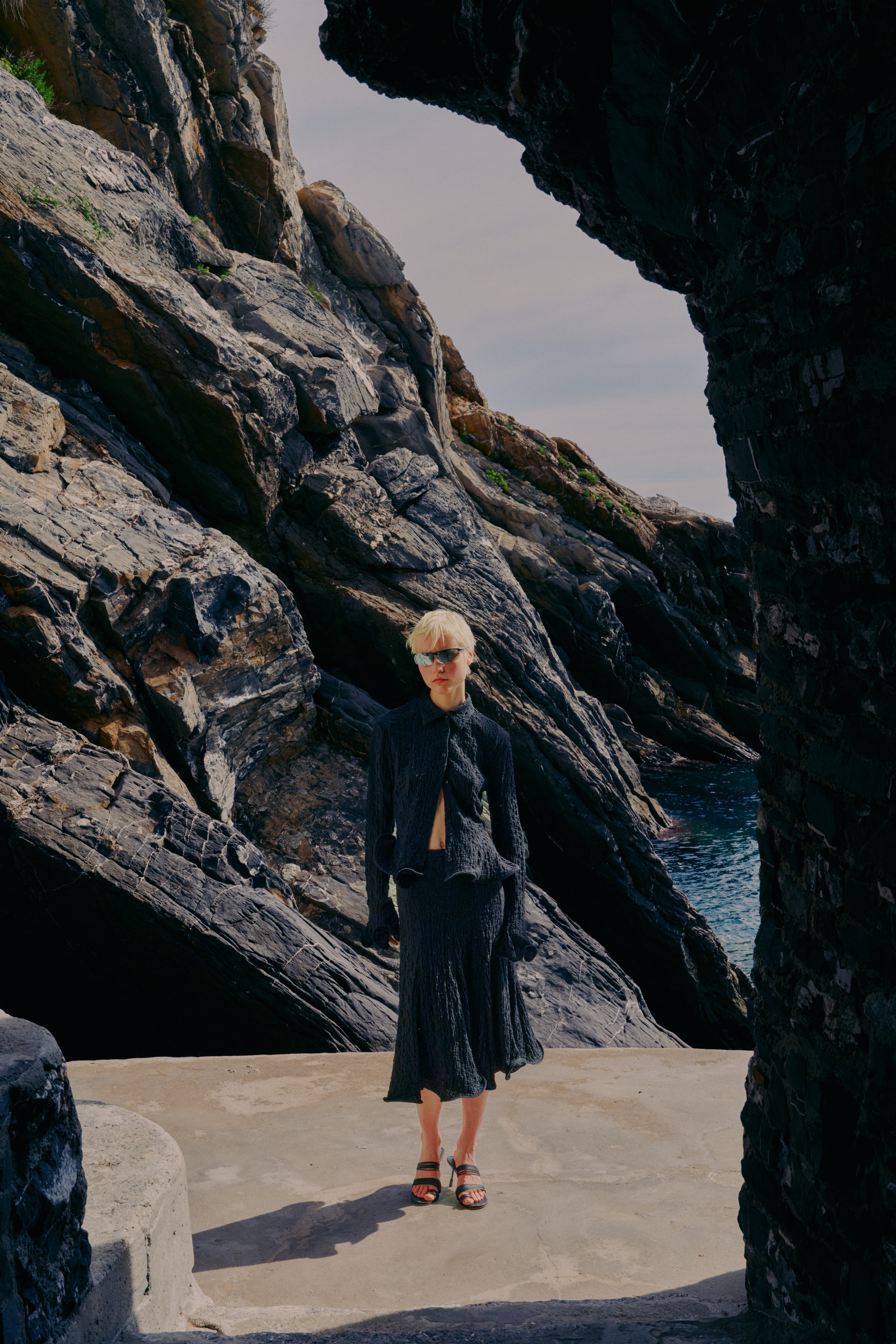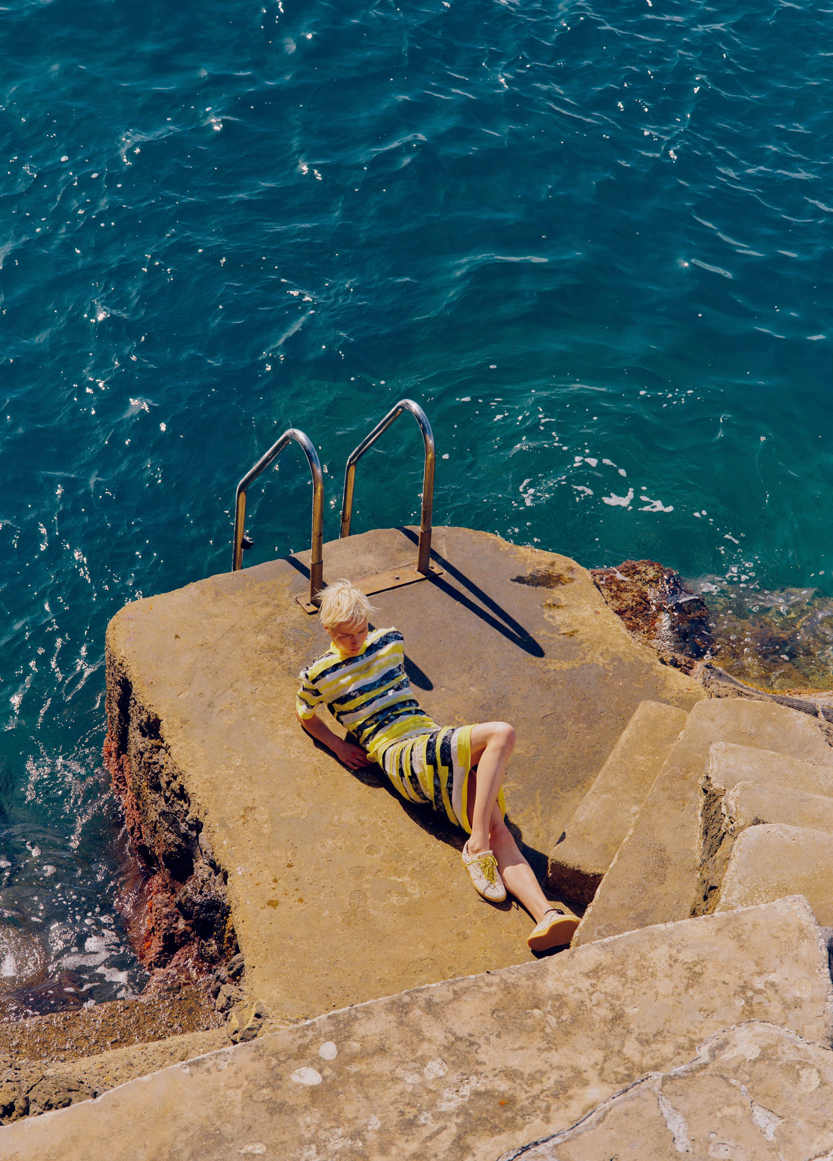 ファブリックの感覚を 高めるクリーンなシルエット、 海岸のリズムを呼び起こす しなやかな曲線のグラフィック。