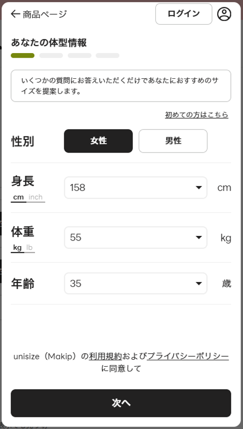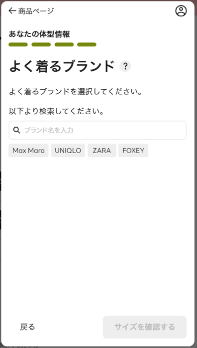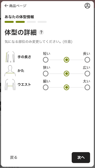 1分程度の簡単なアンケートに回答するだけで、お客様の体型に合った最適なサイズをオススメします。